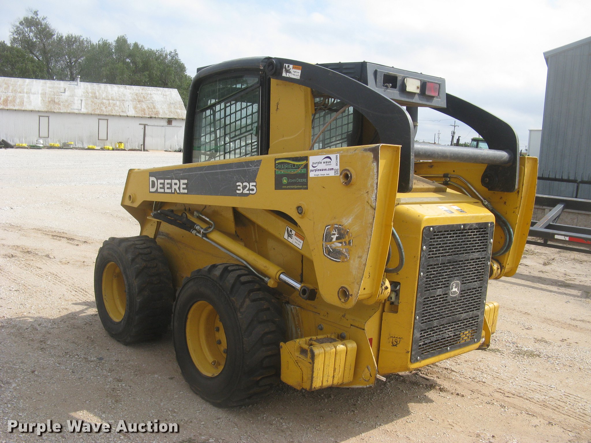 Purple Wave is selling a used Skid Steer Loader in Kansas. This item is a 2008 John Deere 325 skid steer with the following: Unknown miles on odometer, John Deere PE5030 four cylinder turbo diesel engine, Hydrostatic transmission, Enclosed cab, AC and heat, Hand and foot controls, Wipers, Front and rear work lights, Manual quick coupler, High Flow auxiliary hydraulics, Counter weights, 12 x 16.5 tires, Non-operational unit, Engine compartment fire damage, Wiring damage, Plastic components melted, Lift arm cylinder pins removed, but included, Serial T00325E158343