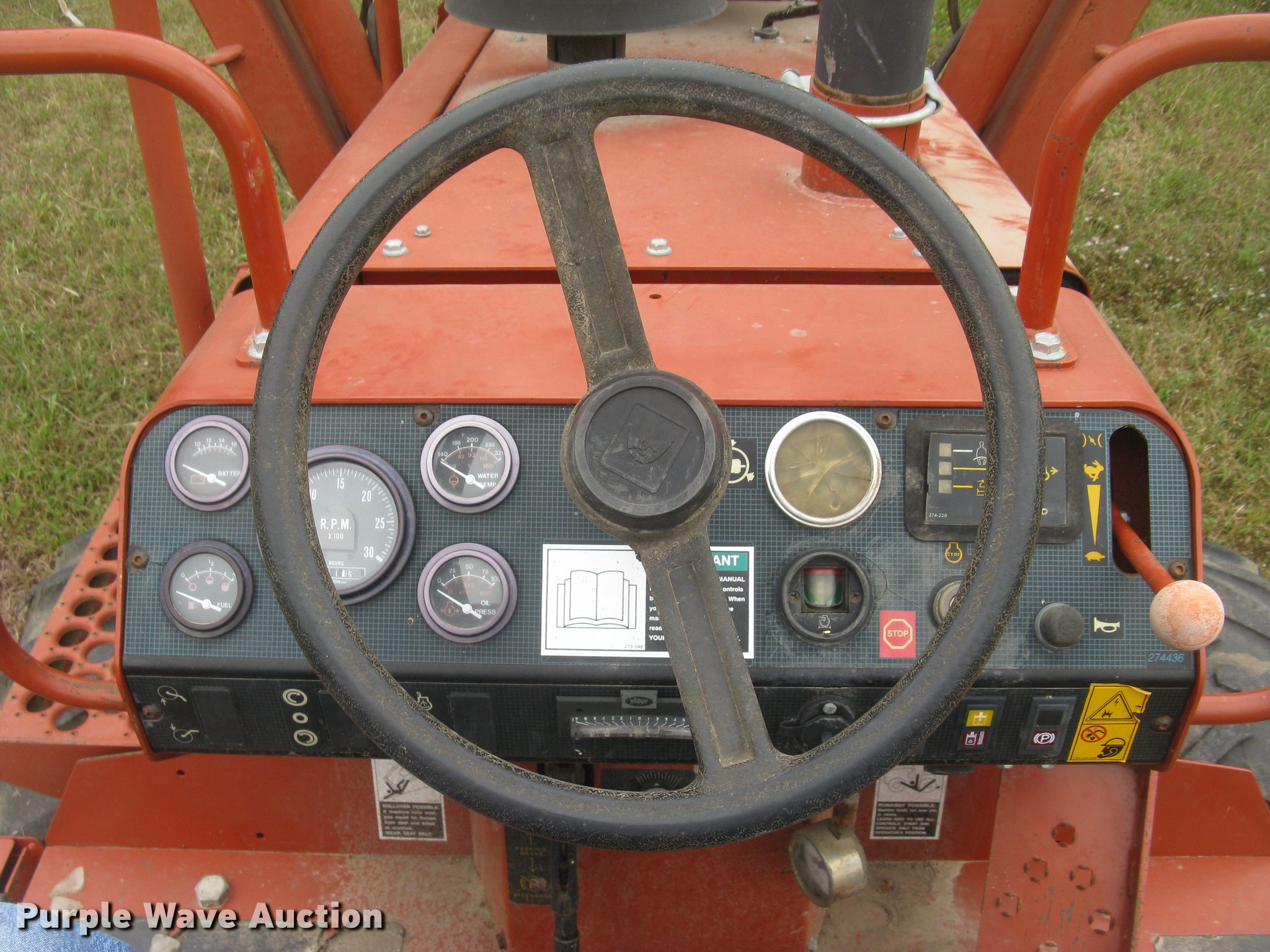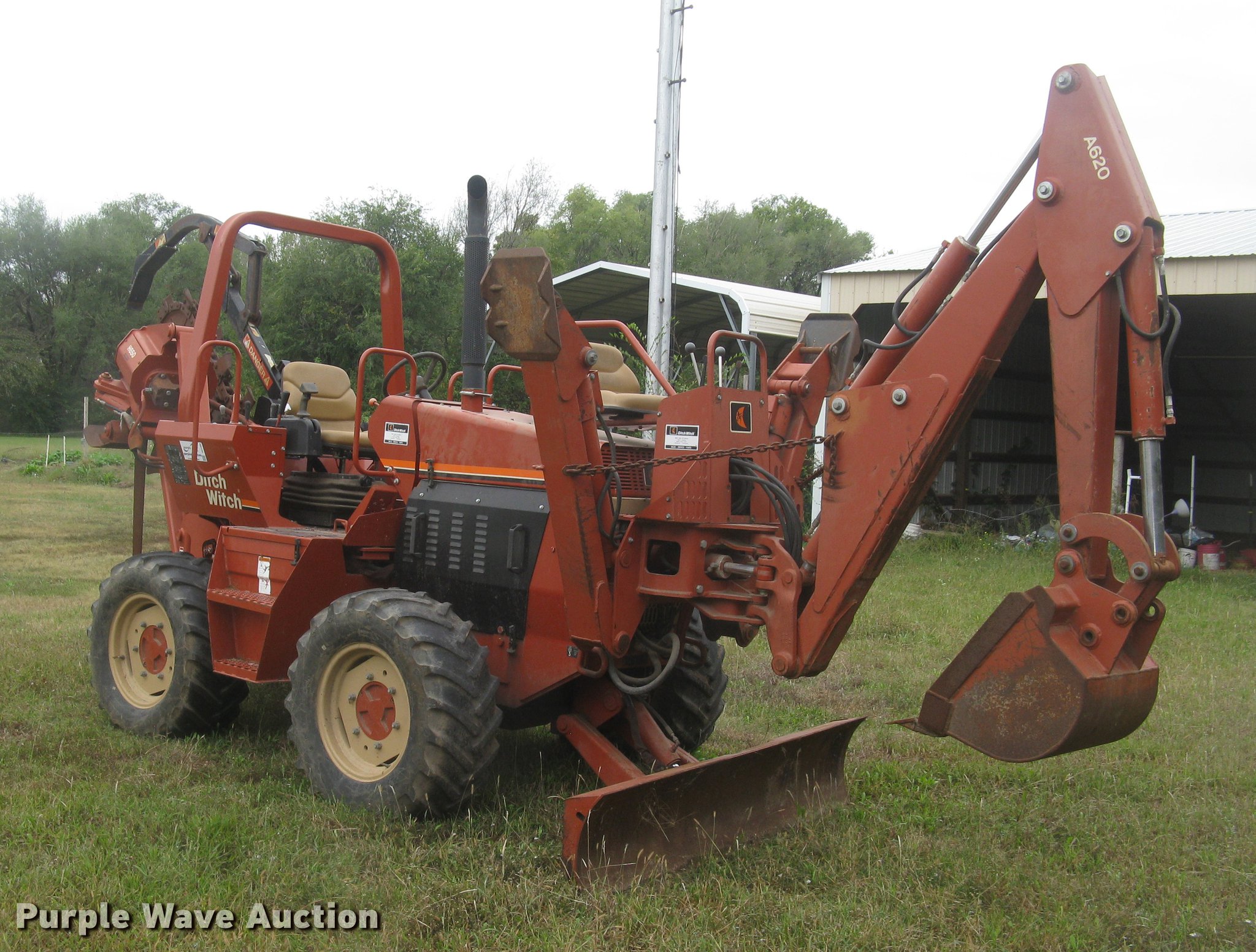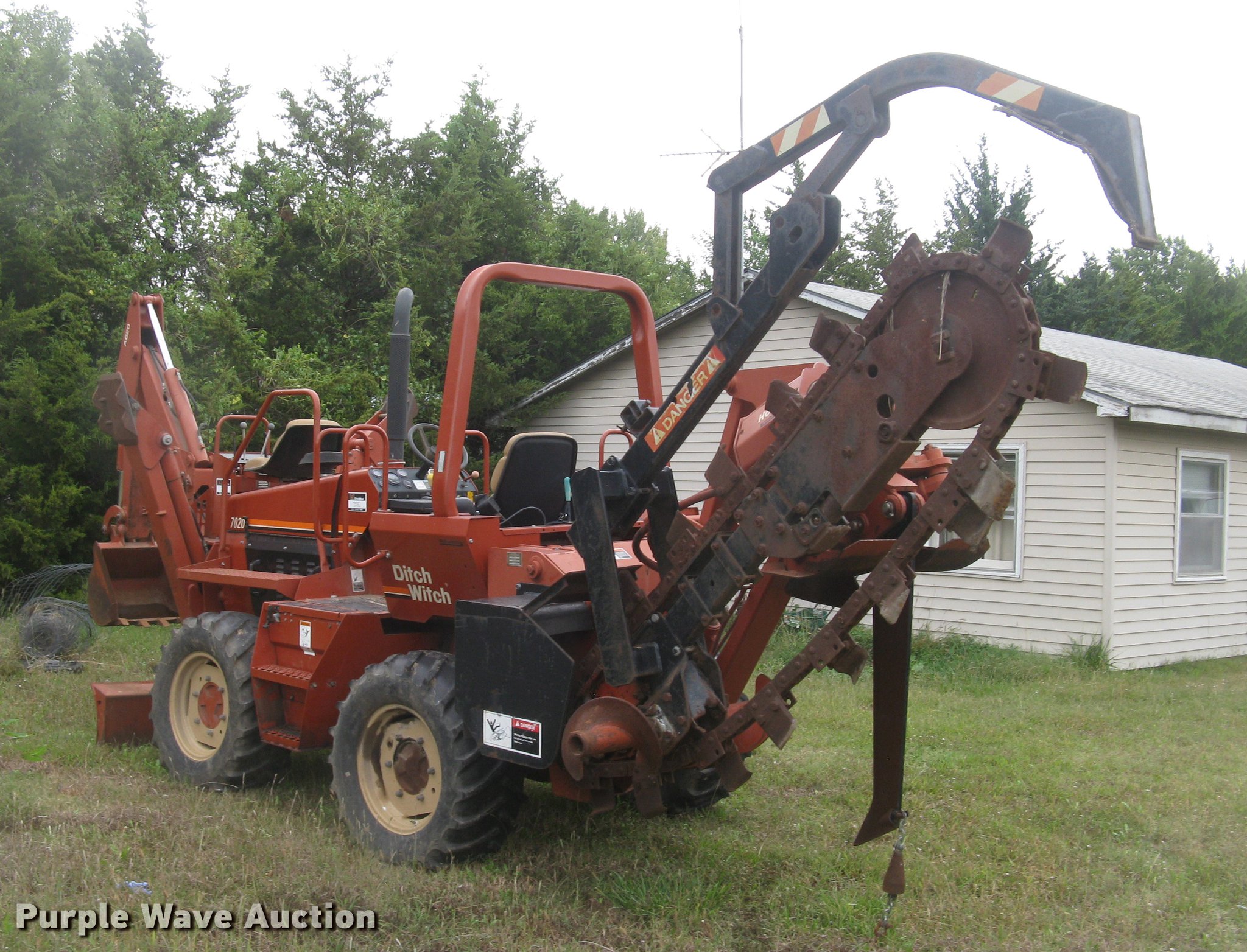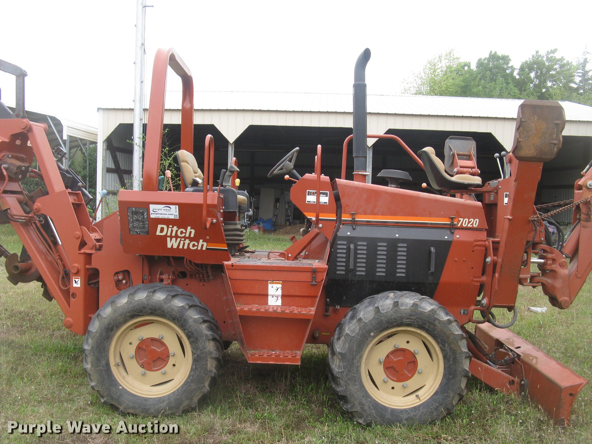 1998 Ditch Witch 7020 trencher. 891 hours on meter, John Deere 3029TF120 three cylinder diesel engine Serial CD3029T343267, Hydrostatic transmission, Four wheel drive, Two post roll bar, Rear steer control, Frame tilt, H650 vibratory plow Pull blade, Serial 2K1477, H650 trencher Approx. 84" boom length, 4" cutting width, Dirt teeth, Crumber bridge, Serial 2K1477, A620 backhoe 24"W bucket (5) teeth, Outriggers, Serial 1K1648, 72"W six-way backfill blade, 38x14.00-20 NHS tires, Manual, Serial 5R0497. Clearwater Excavating, Inc.. Haysville, KS 67060