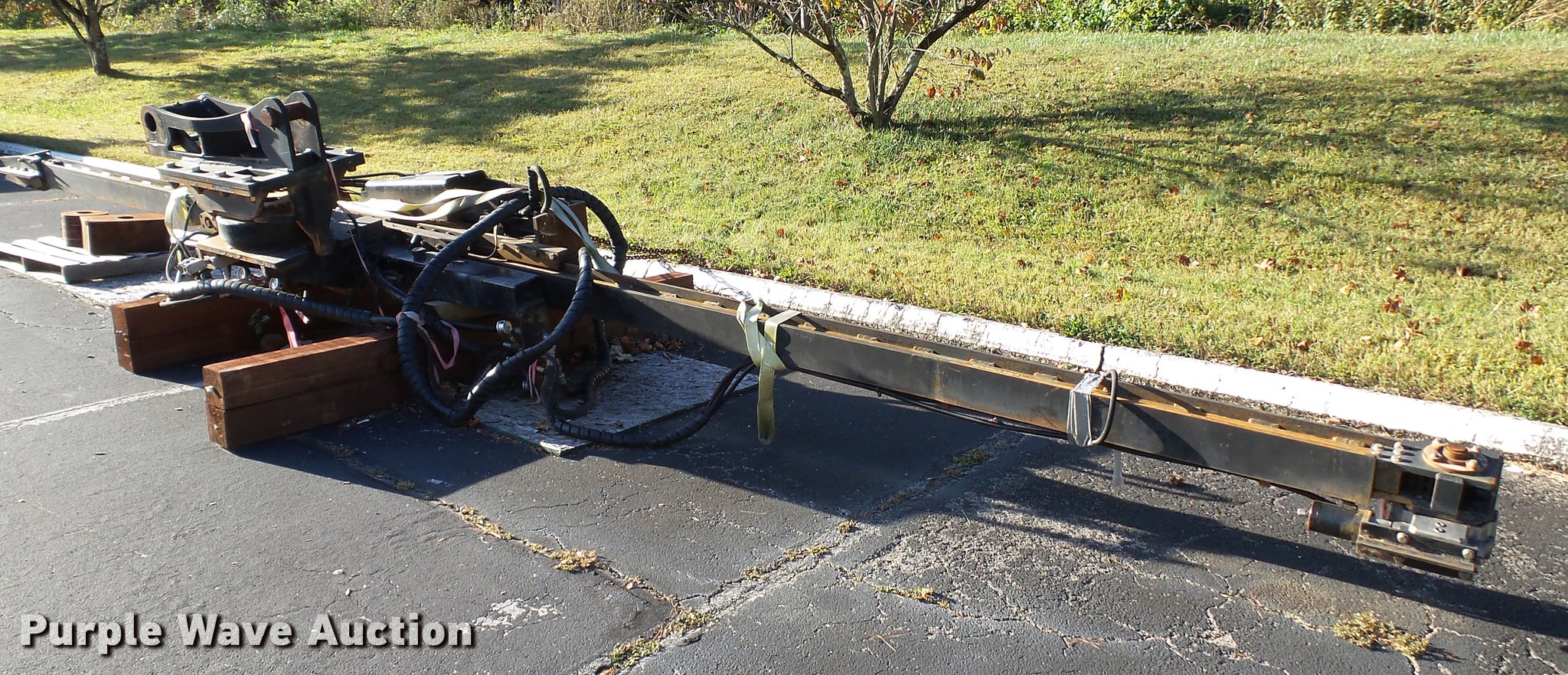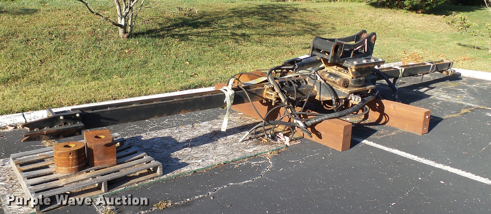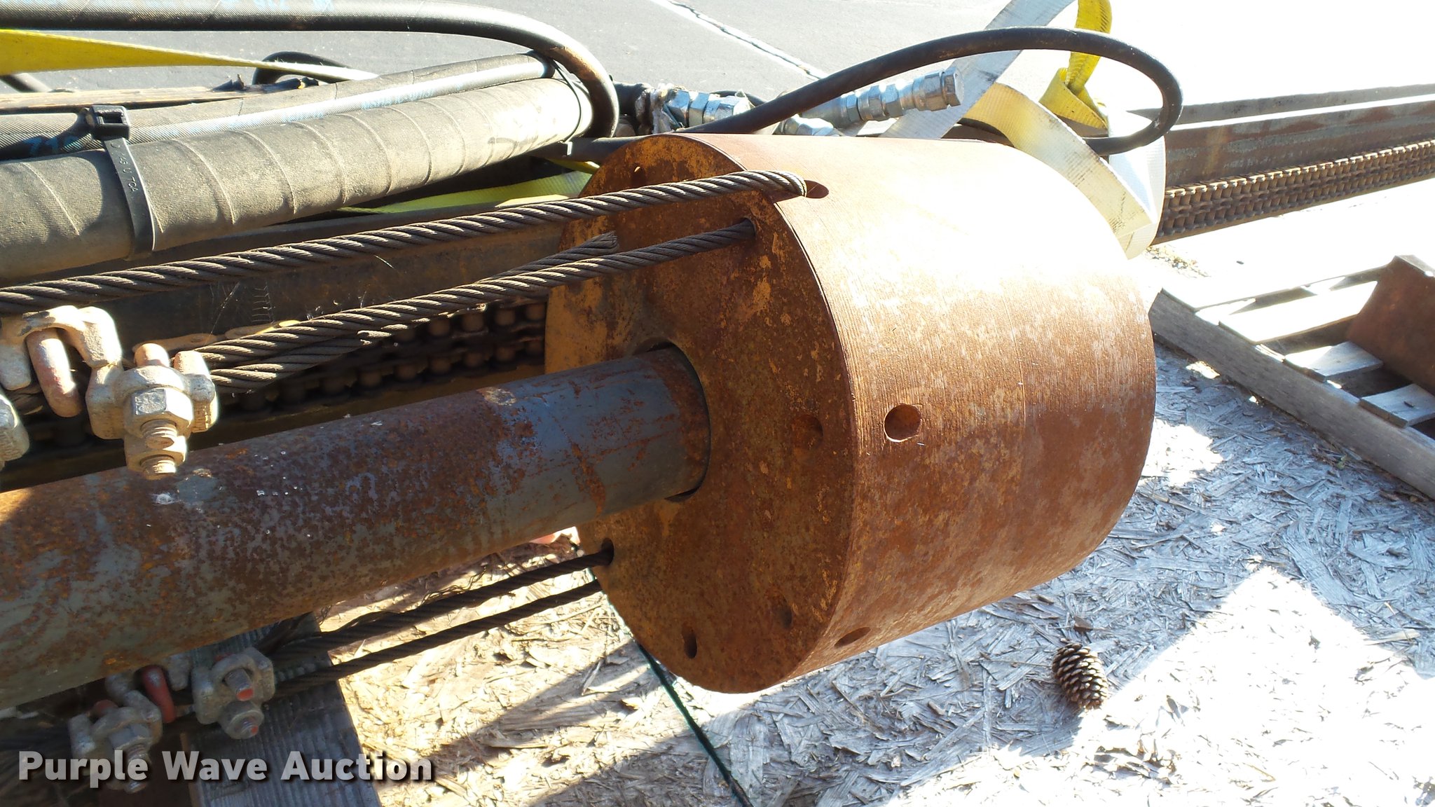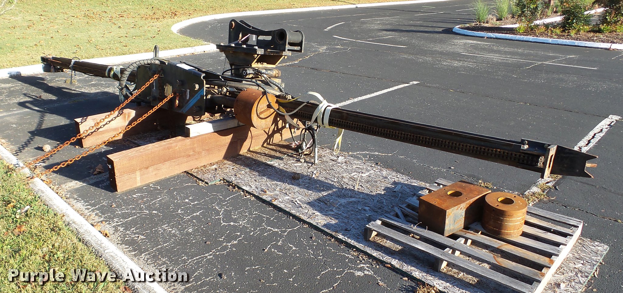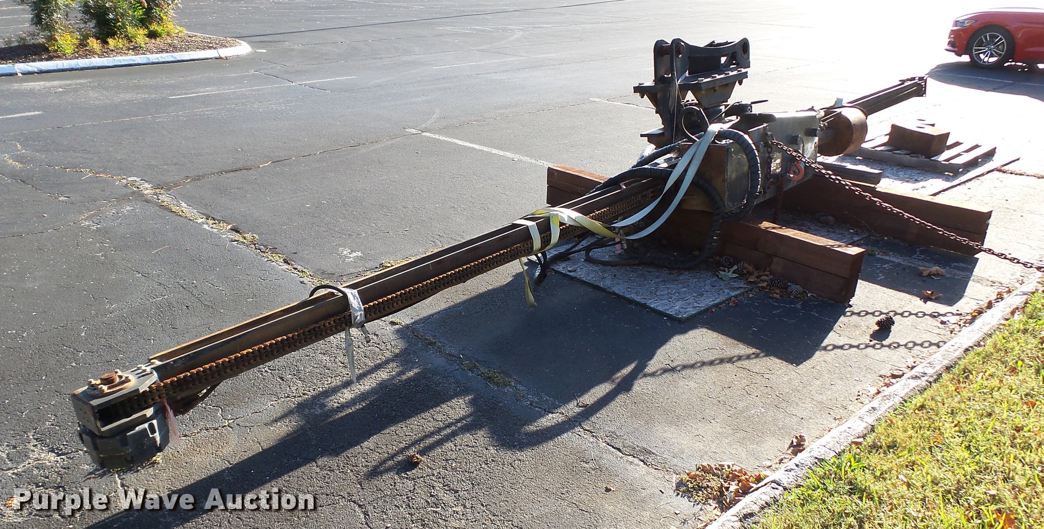 Purple Wave is selling a used Excavator Attach. in Tennessee. This item is a Word International rock drill with the following: 27'L, 12,000 lbs push/pull capacity, Hydraulic raise and lower, Hydraulic angle adjustment, 360 degree lateral movement of feed unit, RD940 Hydraulic ontrols, Metering valves, (3) pile cap subs, 8"H x 10" diameter, 10"H x 13 3/4" diameter, 18"L x 9 1/4"W x 8"H, 33" pin to pin, 11"W, Approximately 3,800 lbs, Removed from a Caterpillar 316 excavator