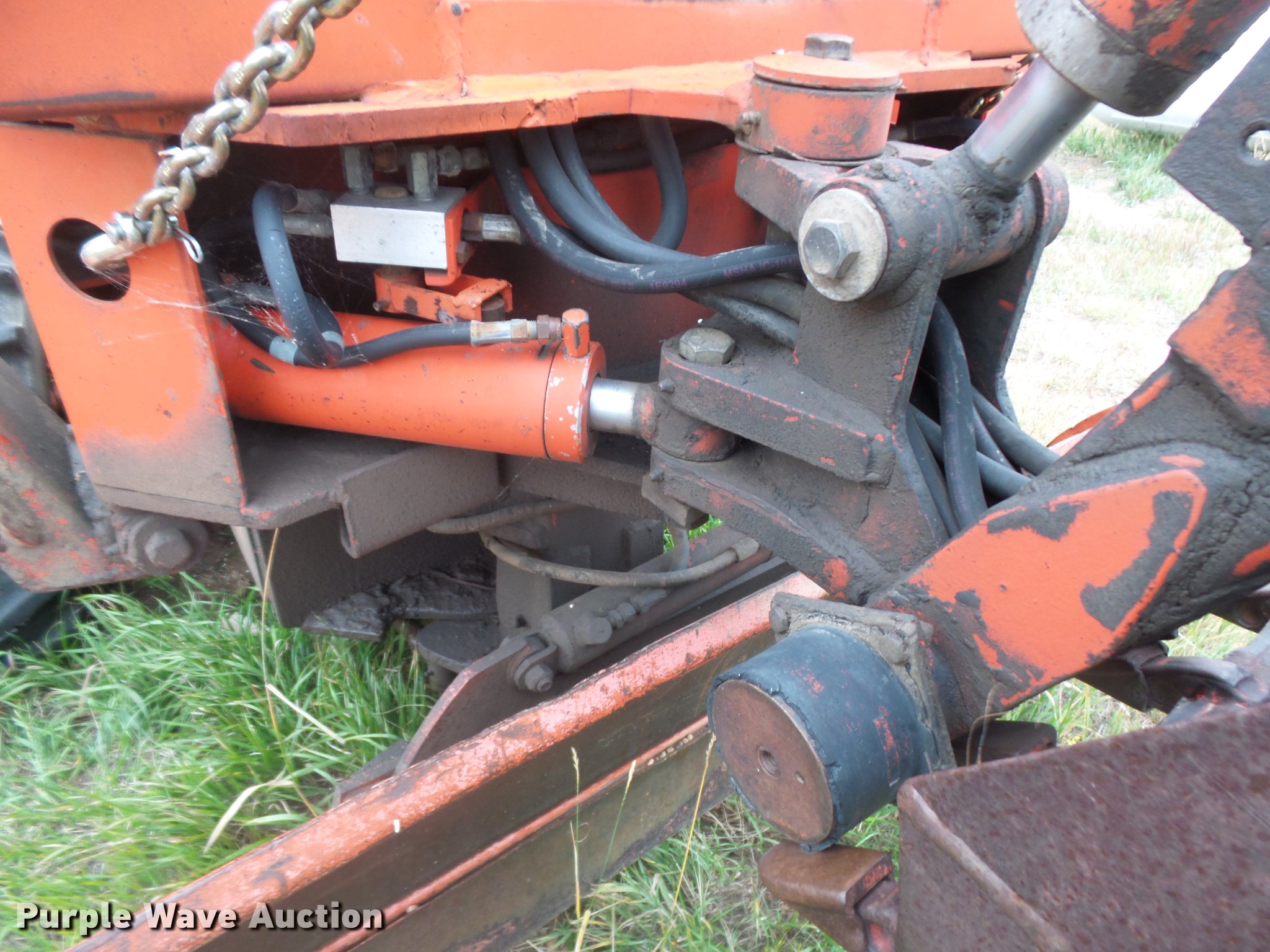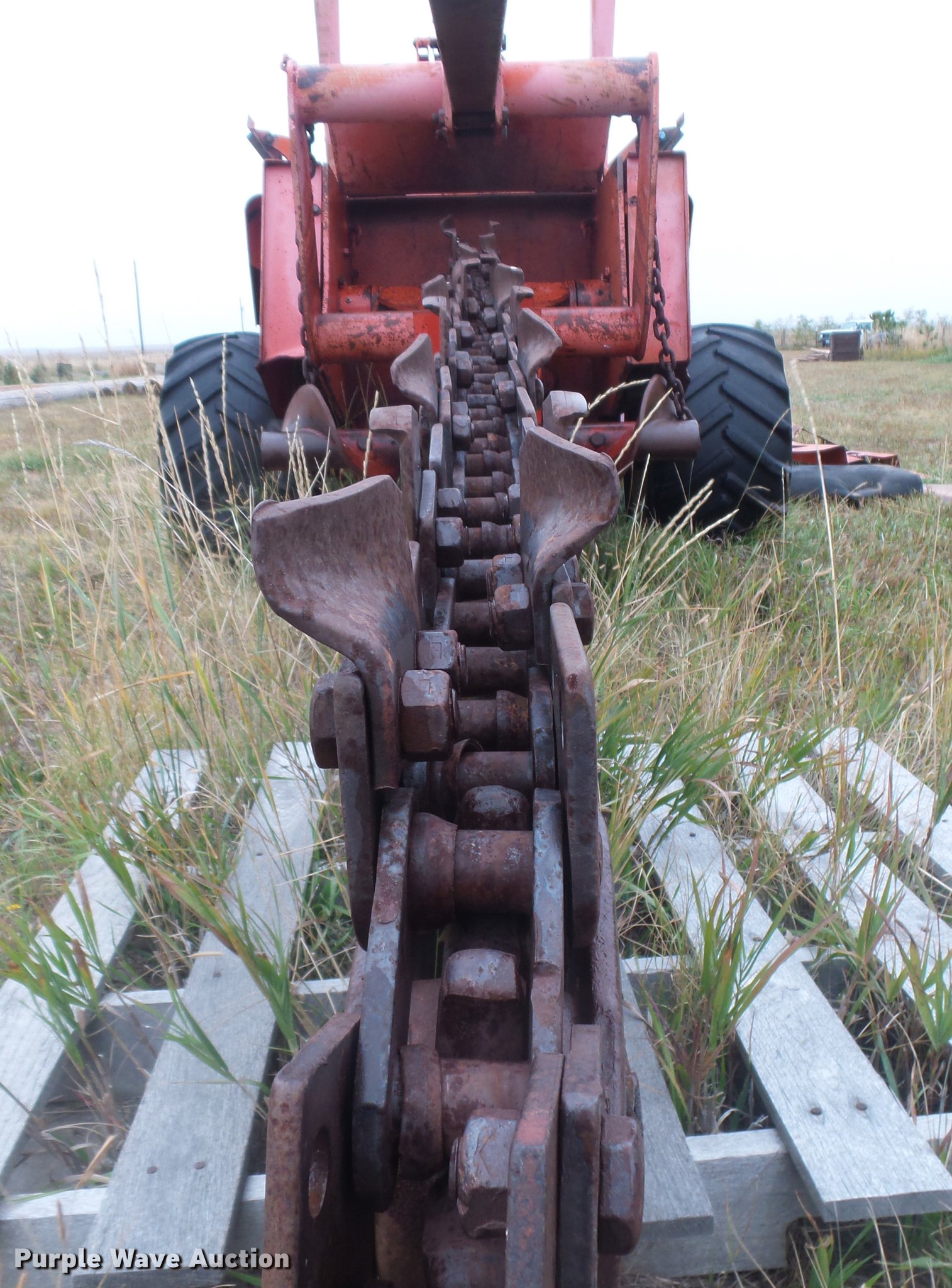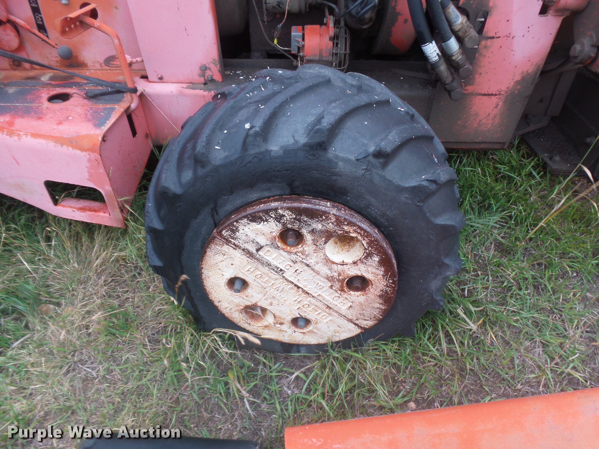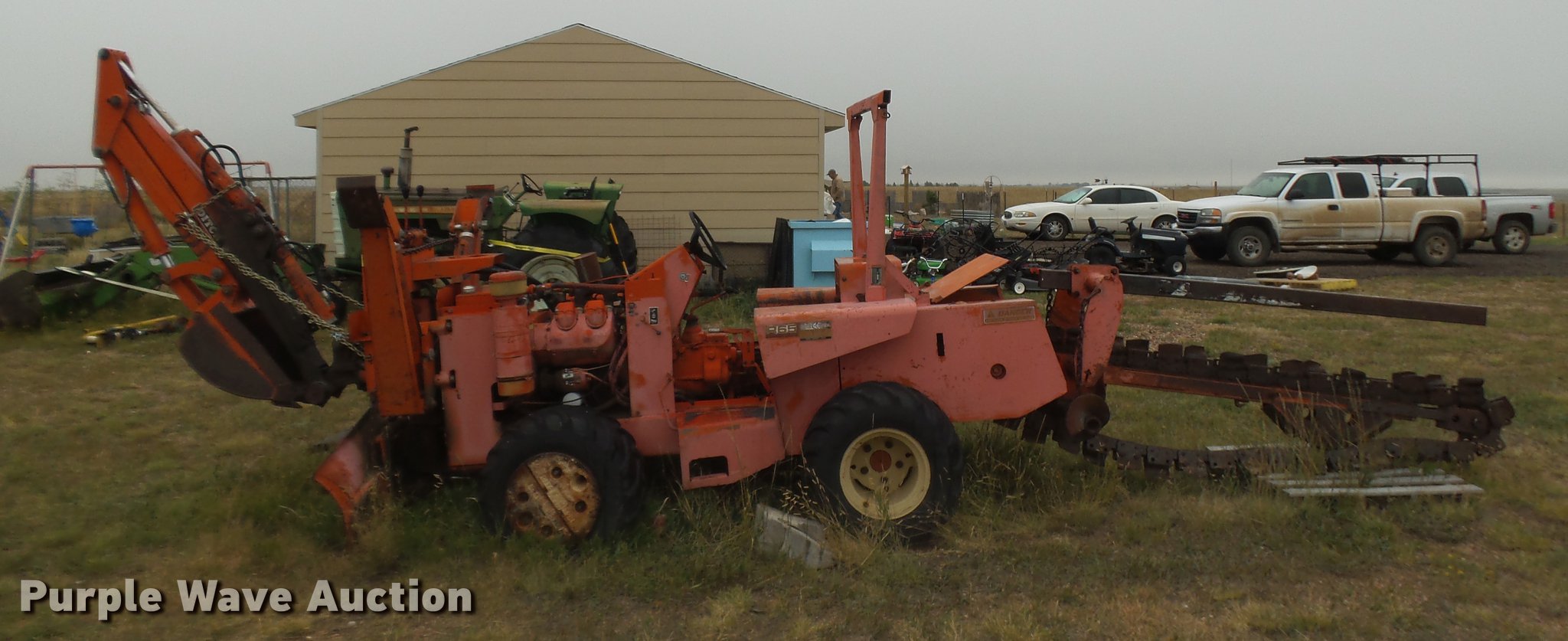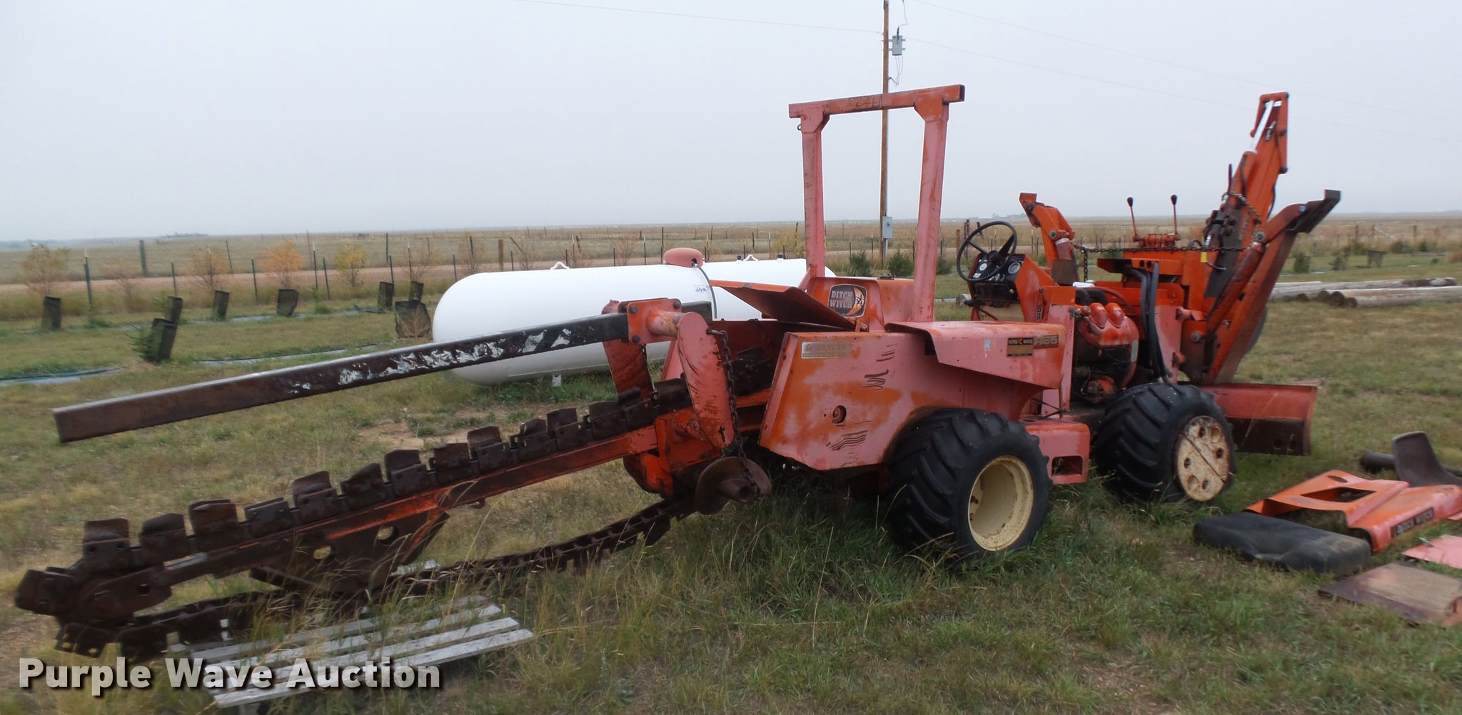 Purple Wave is selling a used Trencher or Rock Saw in Wyoming. This item is a Ditch Witch R65-2 trencher with the following: 1,334 hours on meter, Wisconsin 465D four cylinder diesel engine, Serial 406110, Manual transmission, 4F-1R gears, Four wheel drive, OROPS, R65A trencher, 10' boom length, 6" cutting width, 12" end idler diameter, Rock and dirt teeth, Serial 27787, Backhoe model 140, 44" stick length, 17"W bucket, (4) teeth, Outriggers, Serial 7848, Six-way backfill blade, 6'W, Wheel weights, Goodyear 31 x 15.50-15 tires, Non-operational, Missing drive link, Serial 653316