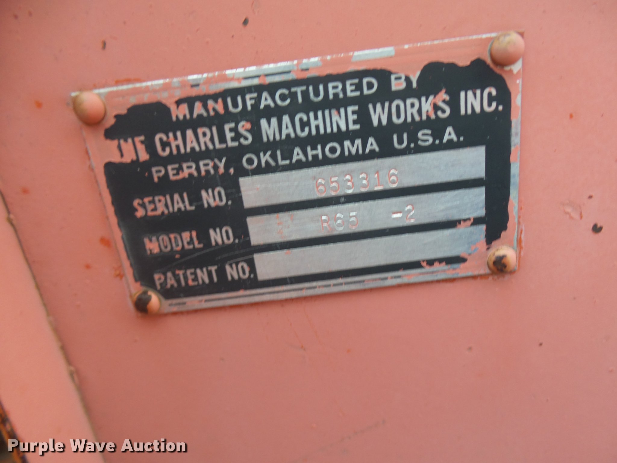 Ditch Witch R65-2 trencher. 1,334 hours on meter, Wisconsin 465D four cylinder diesel engine Serial 406110, Manual transmission 4F-1R gears, Four wheel drive, OROPS, R65A trencher 10' boom length, 6" cutting width, 12" end idler diameter, Rock and dirt teeth, Serial 27787, Backhoe model 140 44" stick length, 17"W bucket, (4) teeth, Outriggers, Serial 7848, Six-way backfill blade 6'W, Wheel weights, Goodyear 31 x 15.50-15 tires, Non-operational Missing drive link, Serial 653316. Carpenter, WY 82054