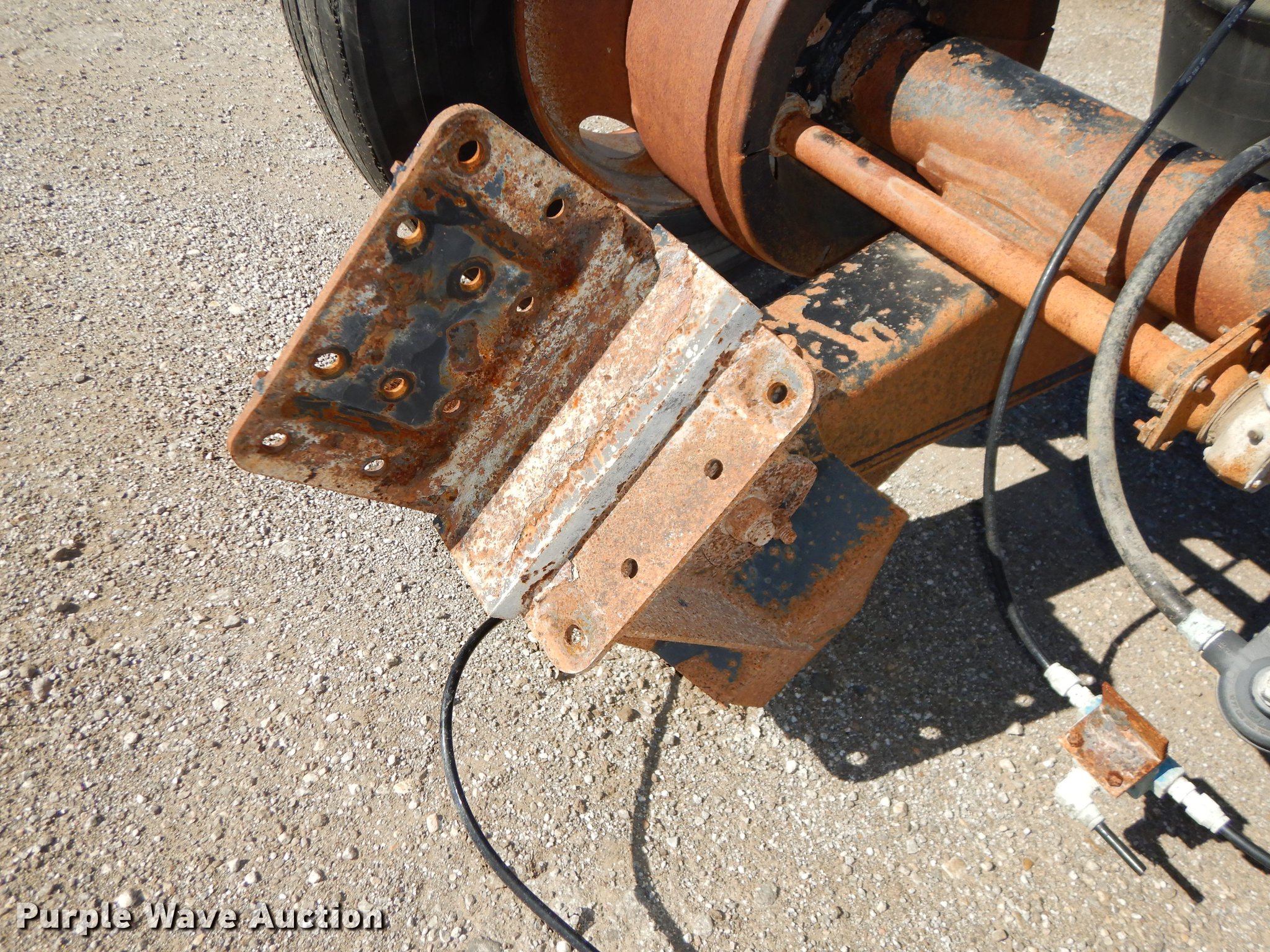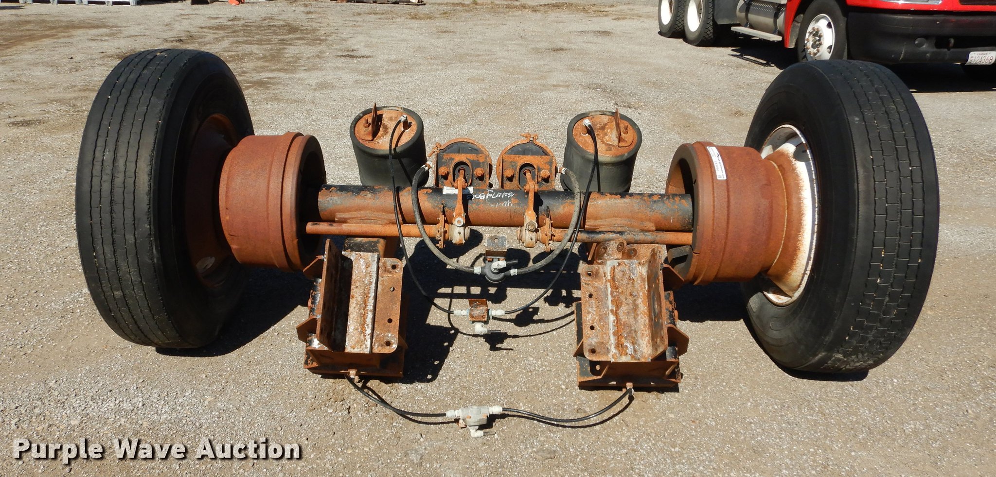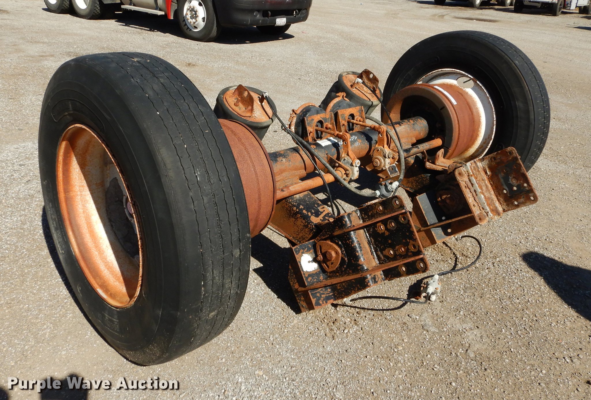 Purple Wave is selling a used Truck Part and Attach. in Kansas. This item is a 2005 Ridewell tag axle assembly with the following: Air suspension, Air brakes, 33" mounting bracket spacing, 295/75R22.5 tires, Serial LV00054394