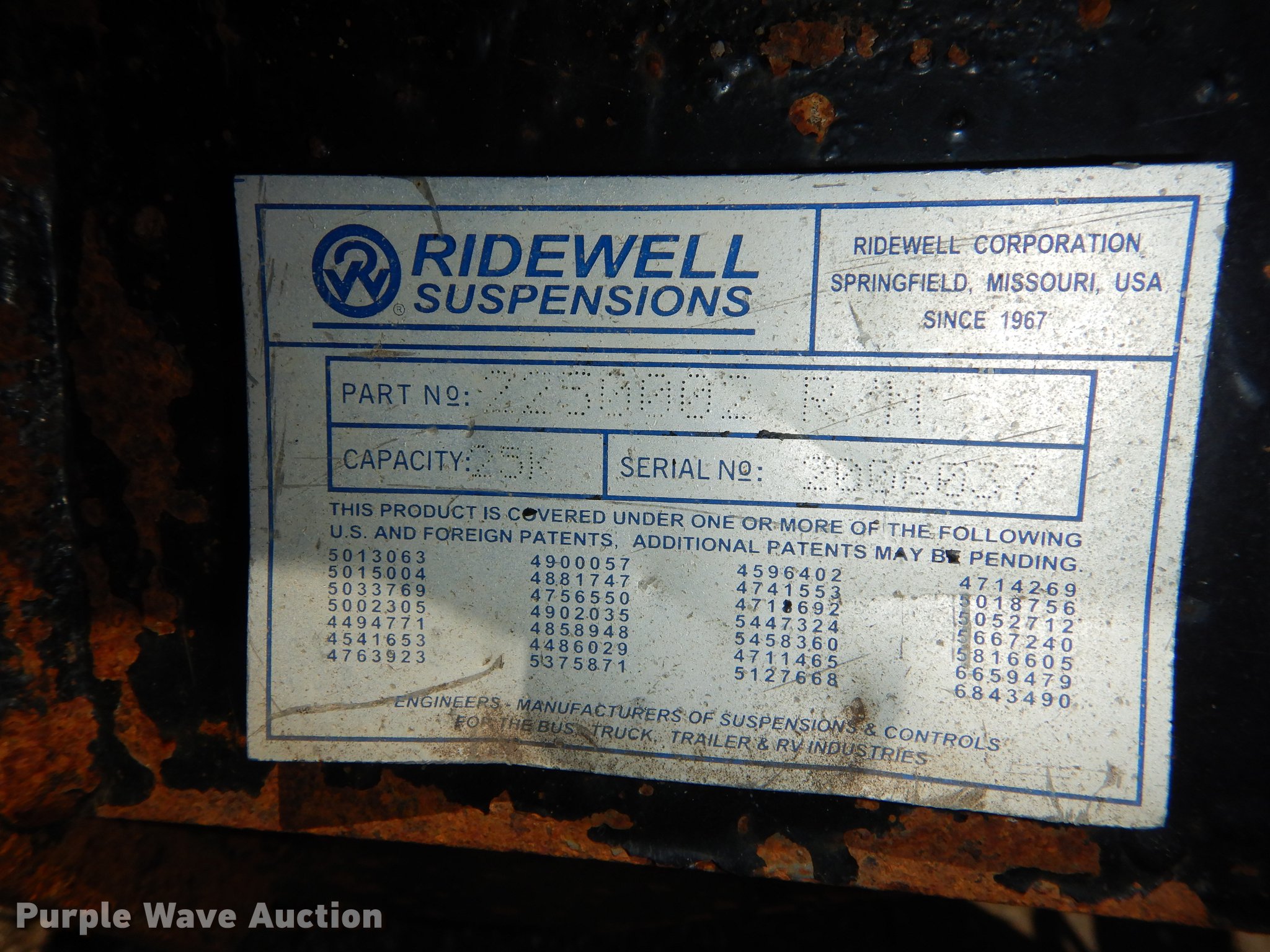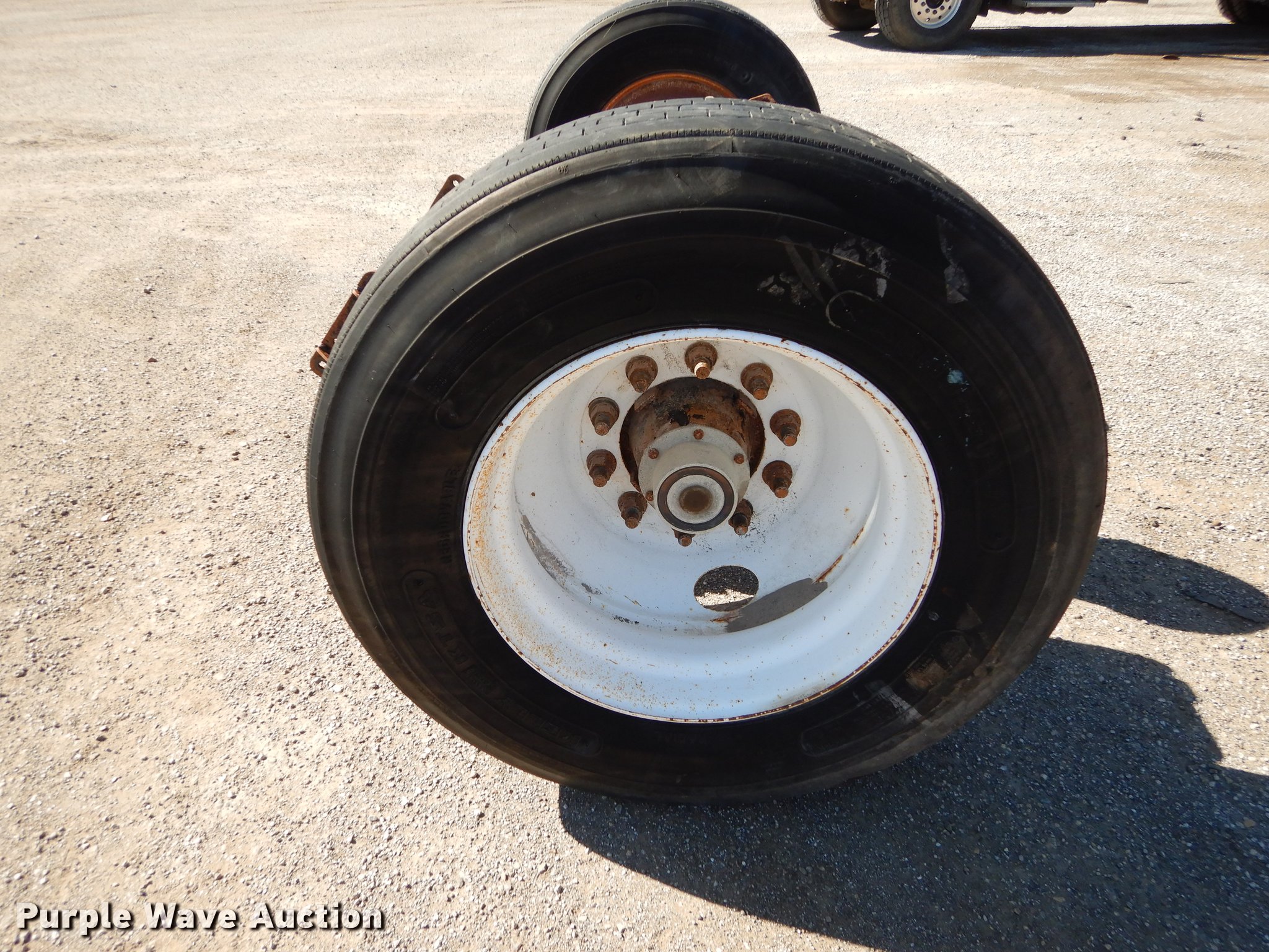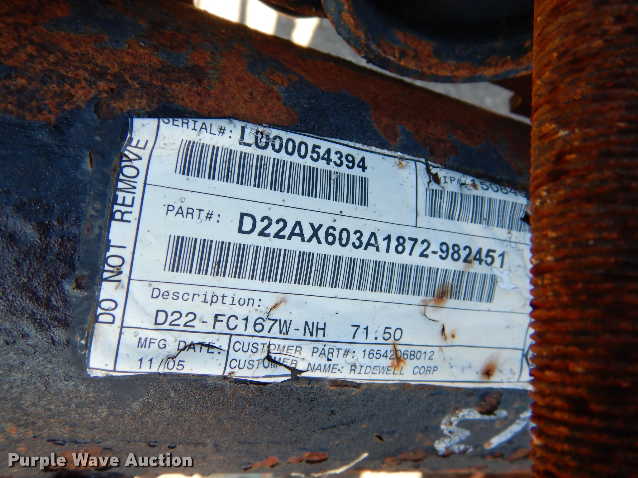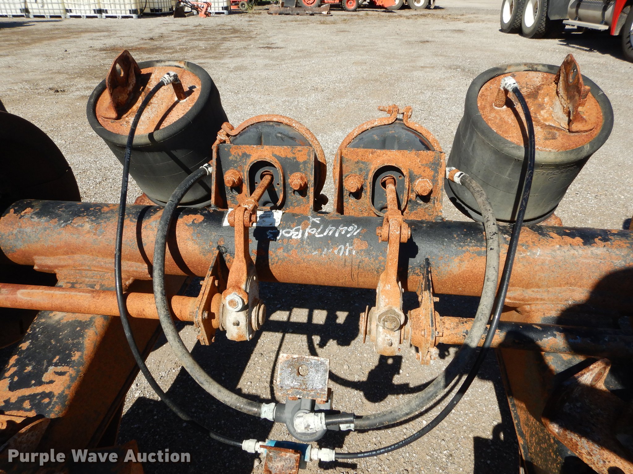 Purple Wave is selling a used Truck Part and Attach. in Kansas. This item is a 2005 Ridewell tag axle assembly with the following: Air suspension, Air brakes, 33" mounting bracket spacing, 295/75R22.5 tires, Serial LV00054394