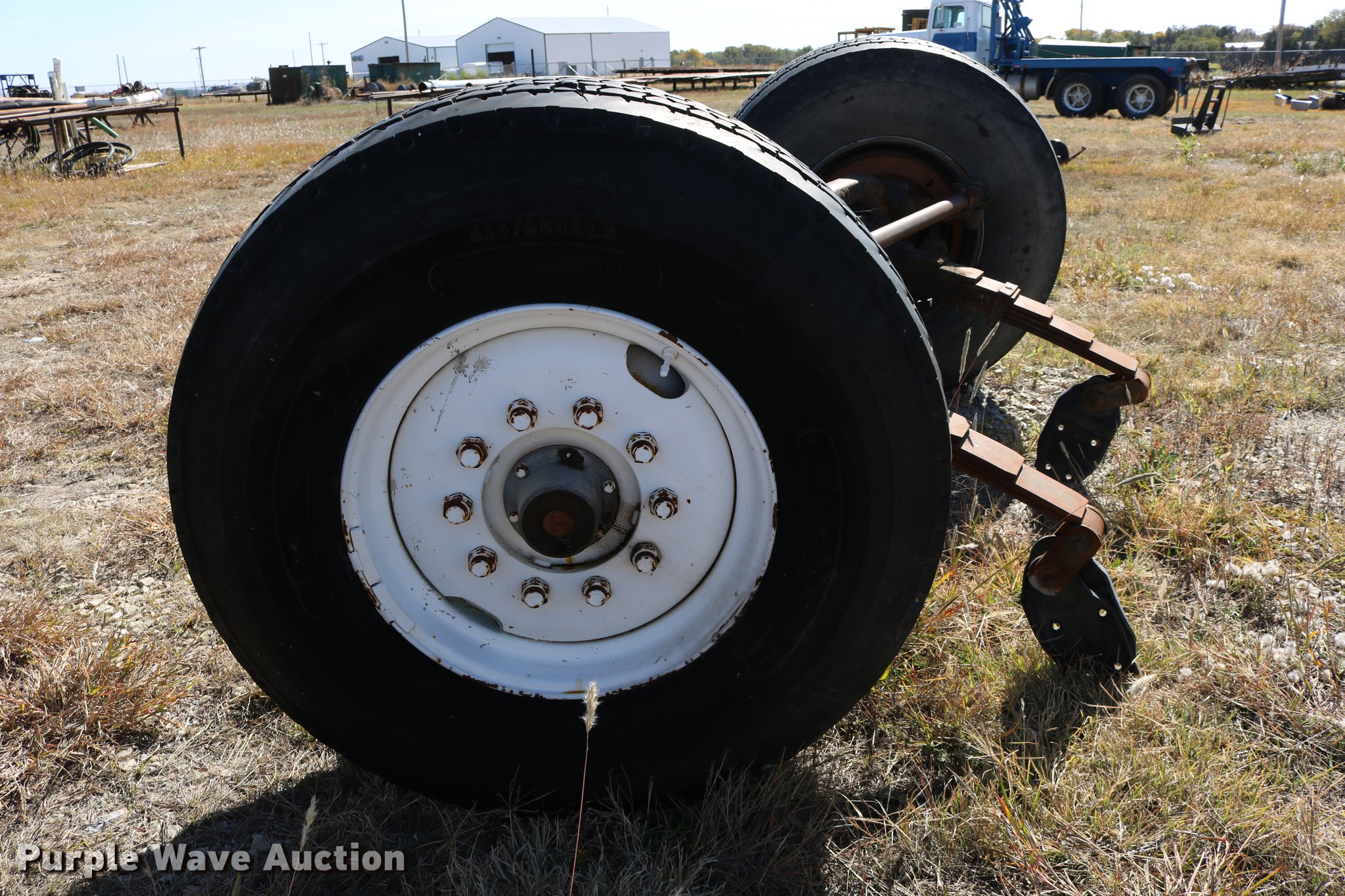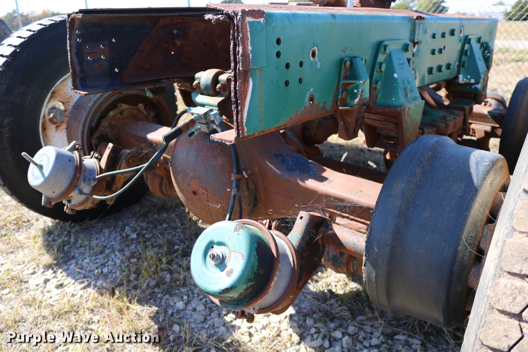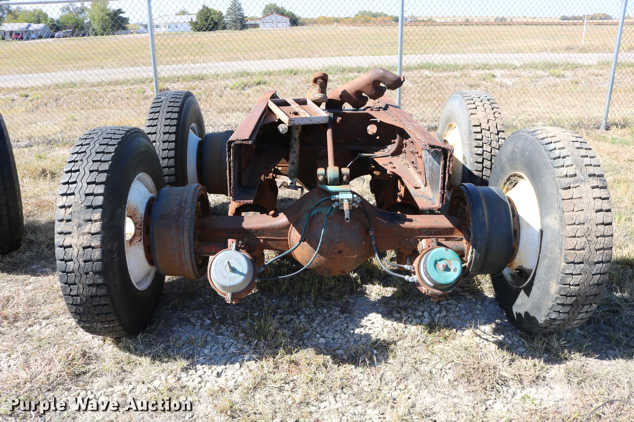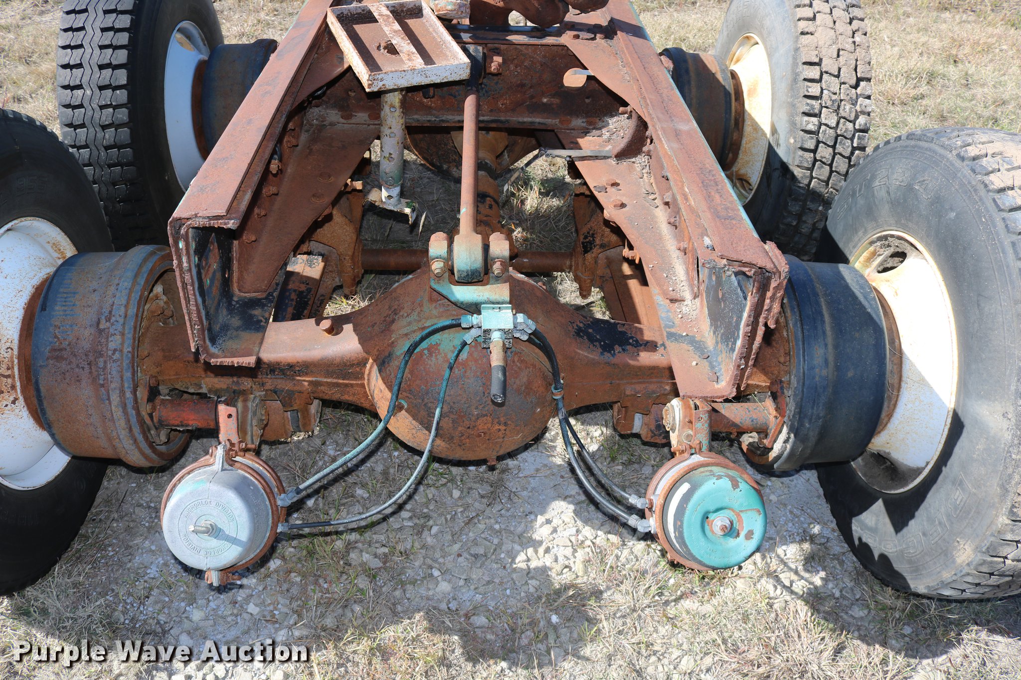 Purple Wave is selling a used Truck Part and Attach. in Kansas. This item is a GMC Brigadier axles with the following: Rear spring over walking beam suspension, Front spring suspension, (4) 11R22.5 tires, (2) 425/65R22.5 tires
