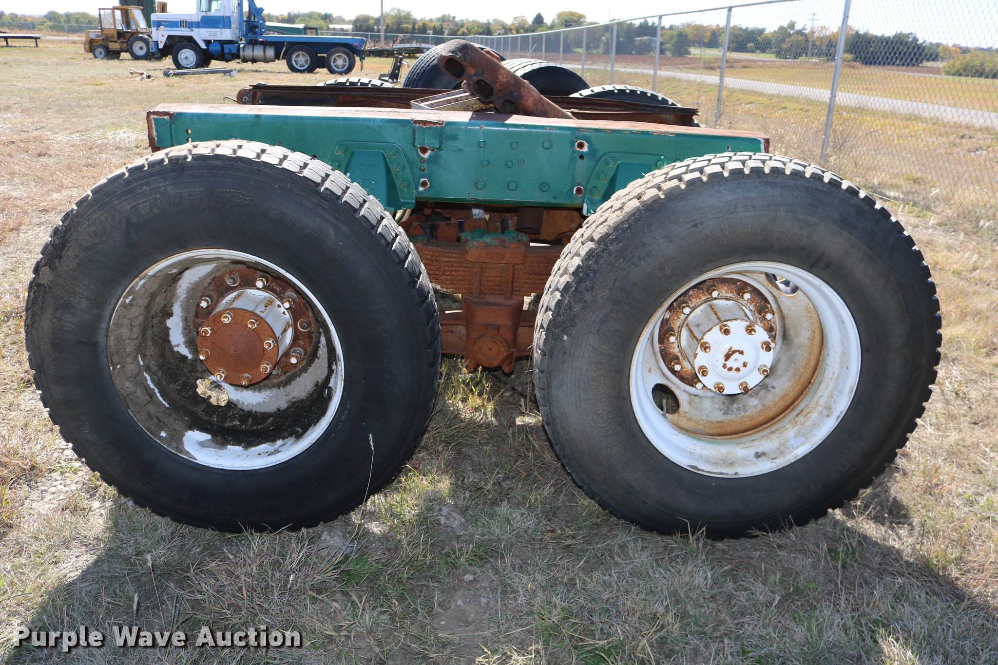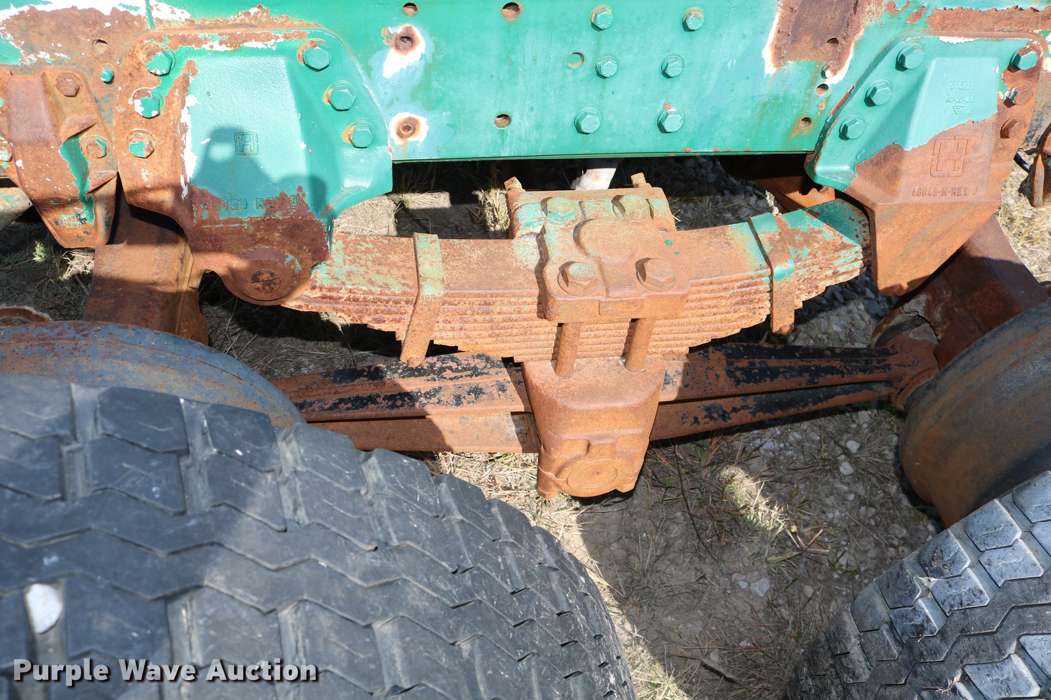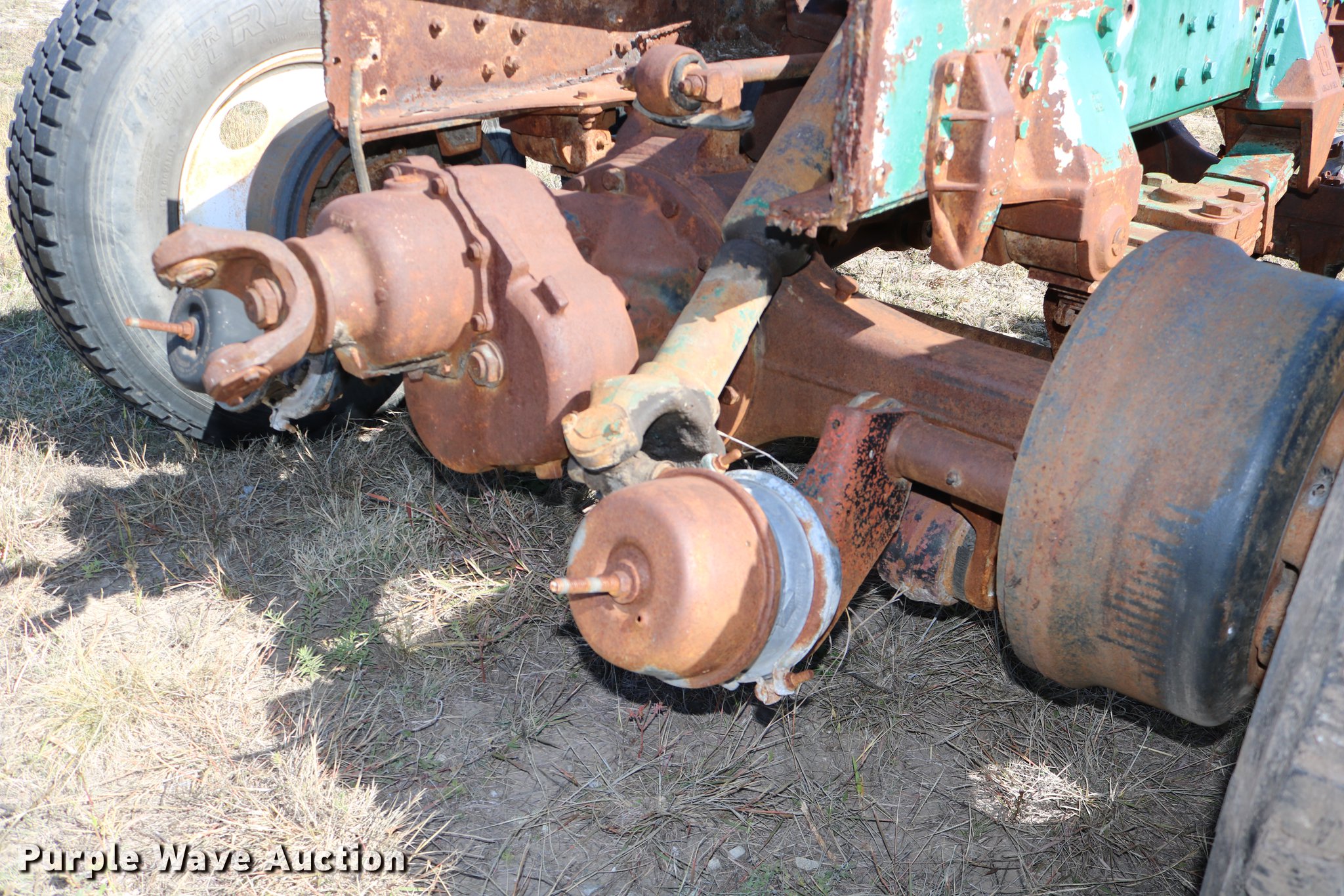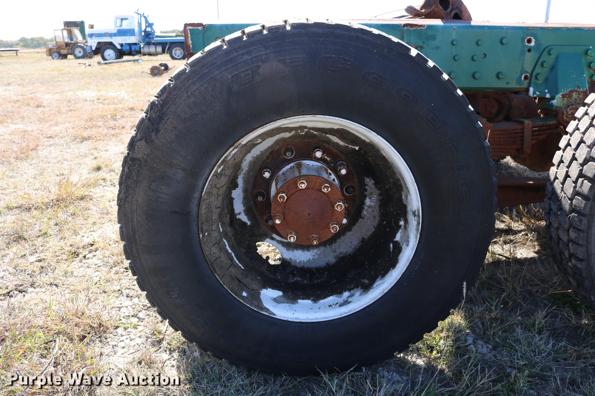 Purple Wave is selling a used Truck Part and Attach. in Kansas. This item is a GMC Brigadier axles with the following: Rear spring over walking beam suspension, Front spring suspension, (4) 11R22.5 tires, (2) 425/65R22.5 tires