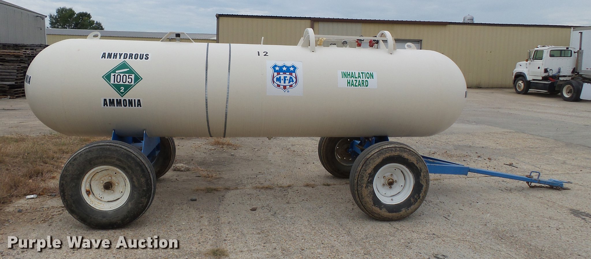 Anhydrous ammonia nurse tank. 16'L tank, 1,000 gallon capacity, 12.5-15 tires, Decals will be removed prior to auction. MFA Ag Inc.. 104 E South St. Advance, MO 63730