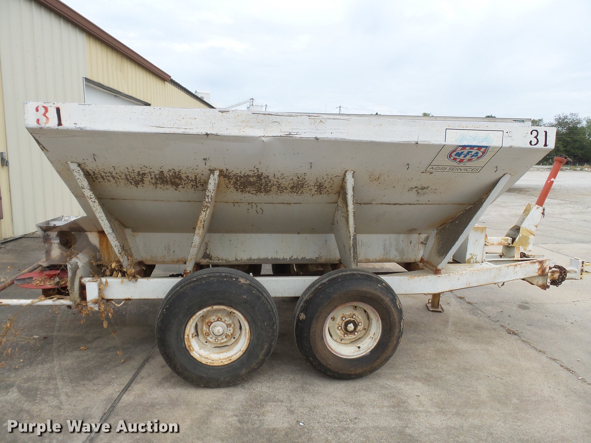 Fertilizer spreader. 10'L x 8'W hopper, Four ton capacity, 10"W chain floor, Ground driven chain, Dual spinners, 540 PTO, Adjustable pin hitch, 12.5-15 tires, Decals will be removed prior to auction. MFA Ag Inc.. 104 E South St. Advance, MO 63730