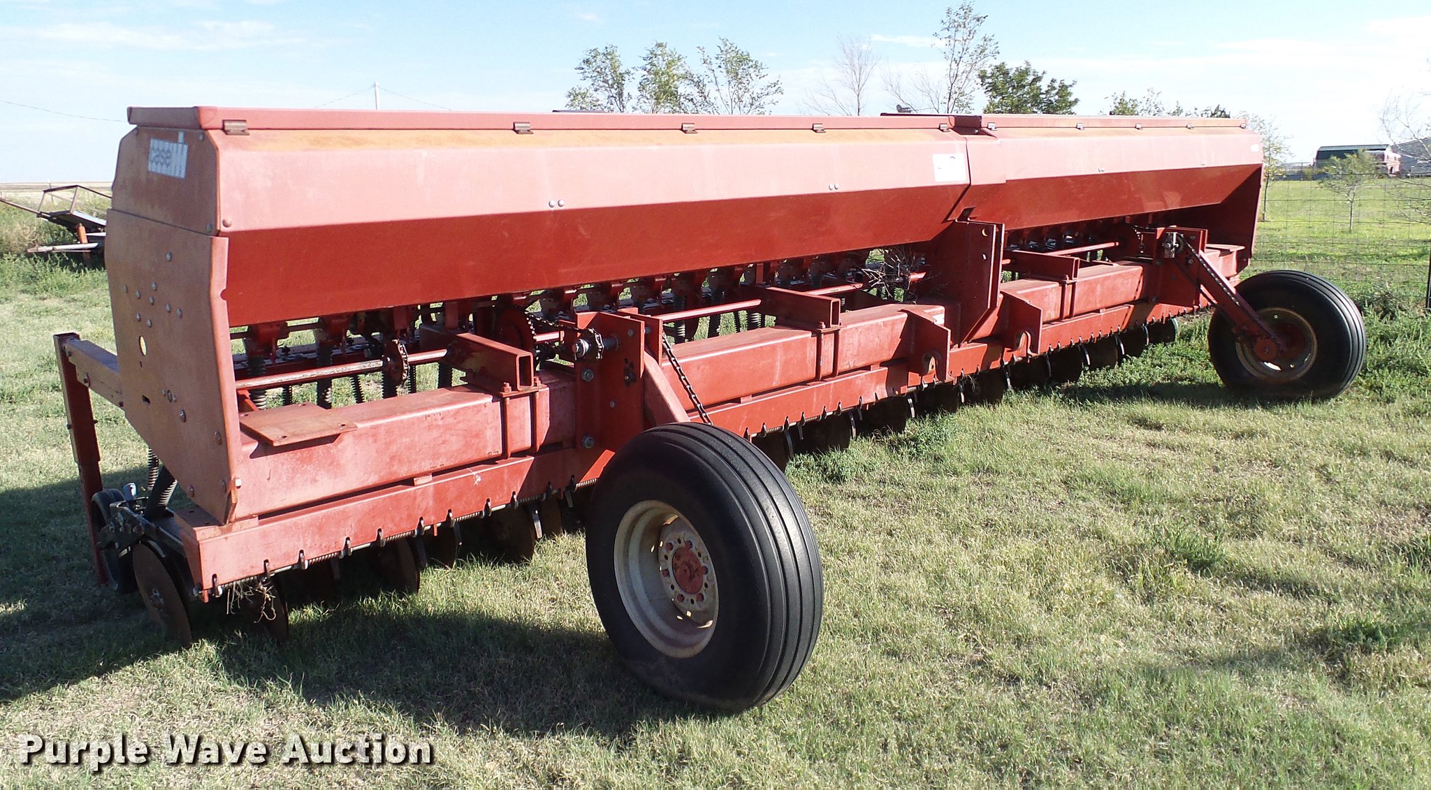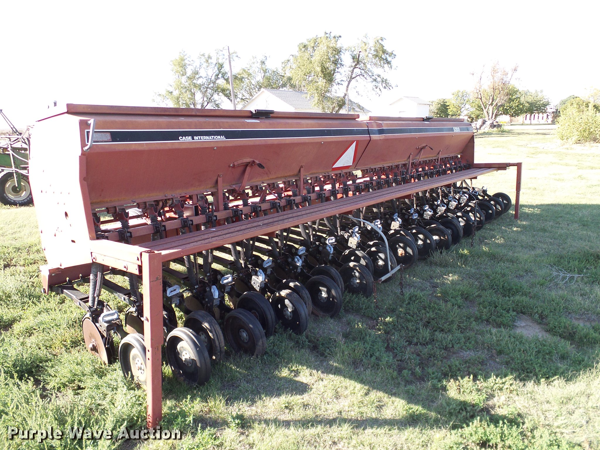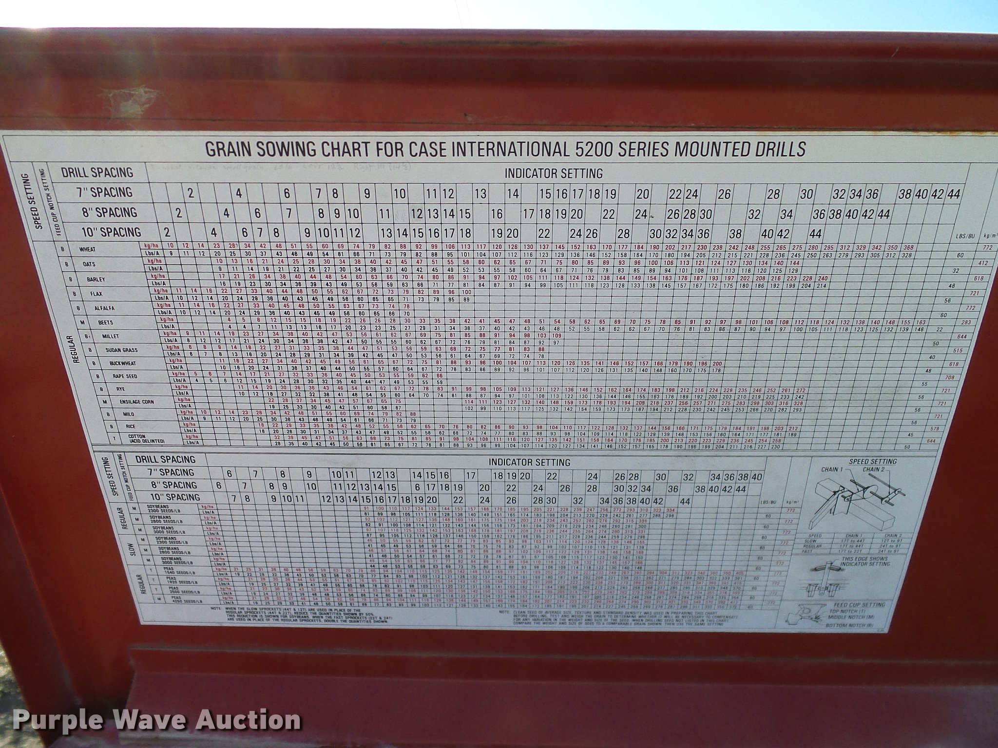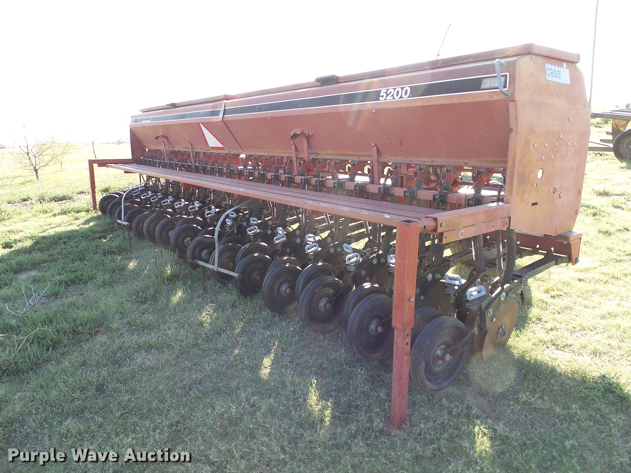 Purple Wave is selling a used Grain Drill or Seeder in Oklahoma. This item is a Case IH 5200 grain drill with the following: 19.5'W, 30 row units, 8" row spacing, Bulk fill system, Ground meter drive, HD spring down pressure, Double disk openers, Rubber closing system, Three point, (2) 9.5L-14 drive/outside tires, Serial 0100472