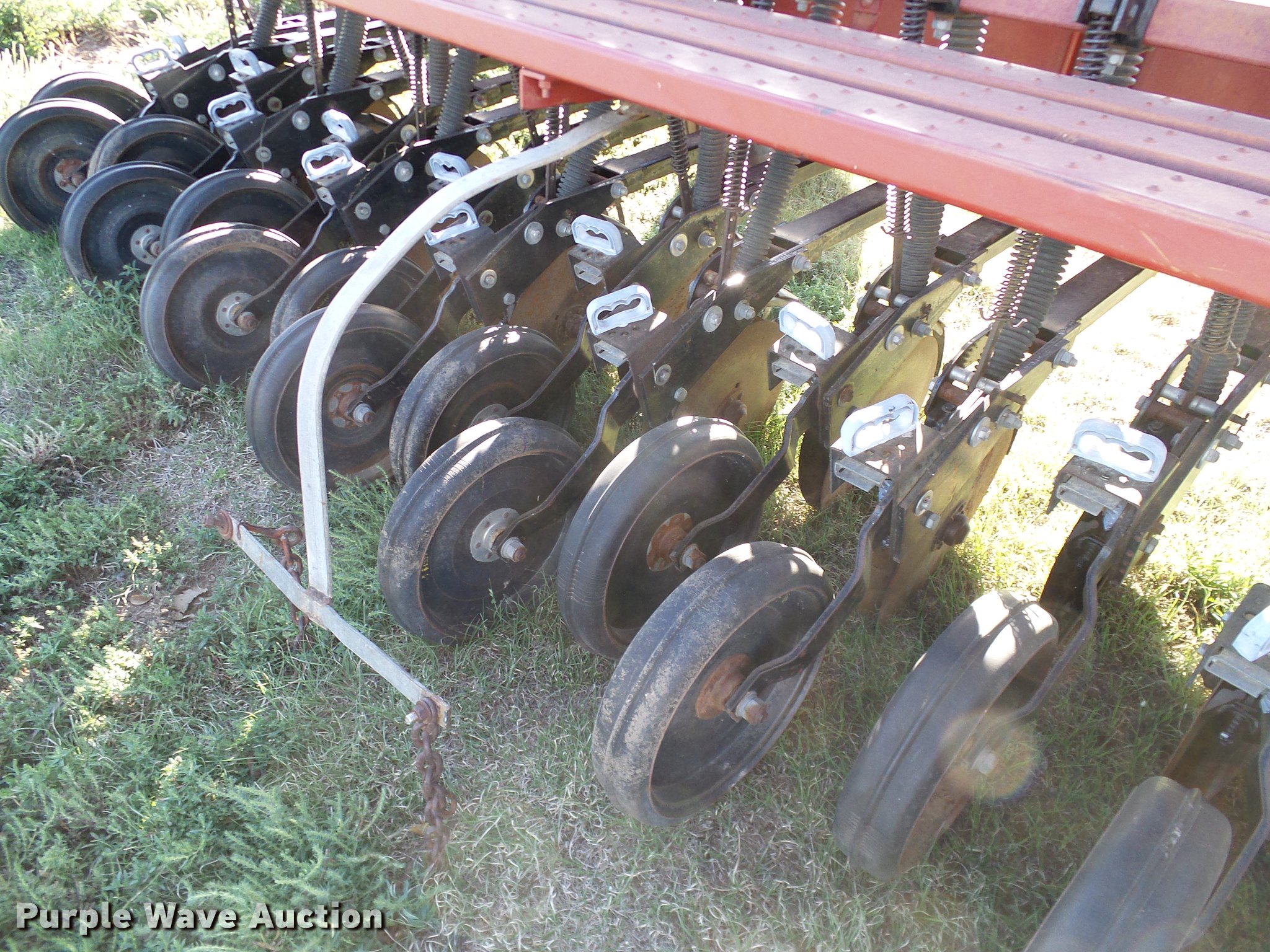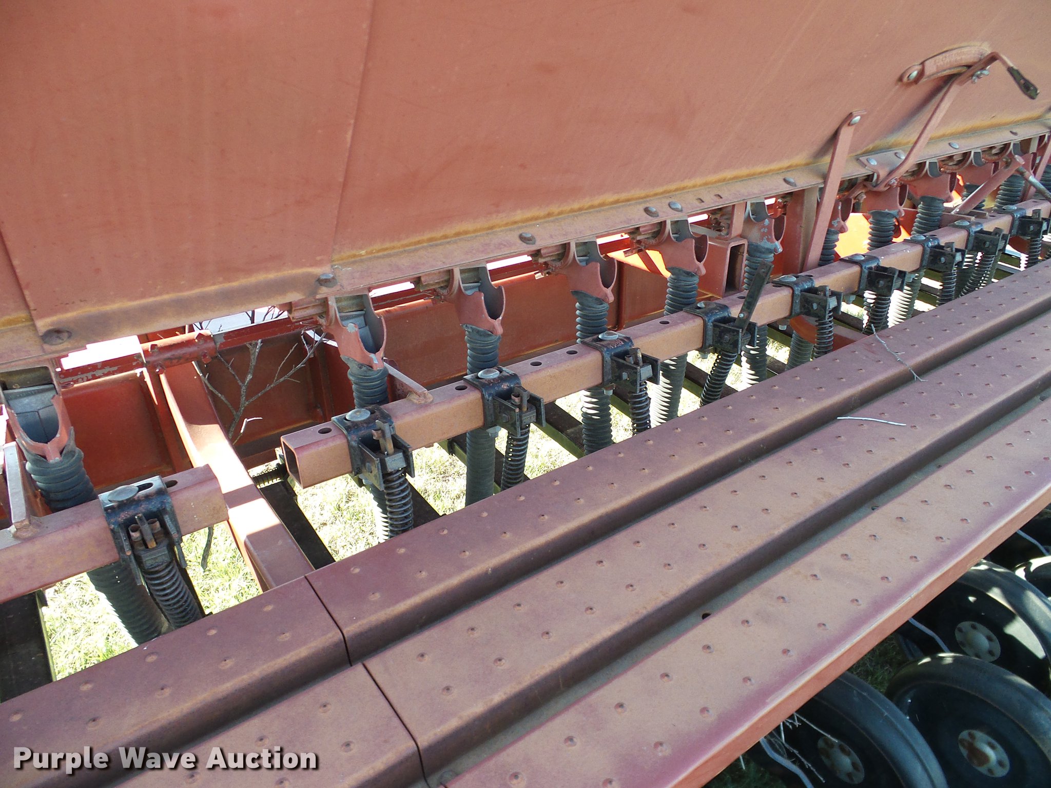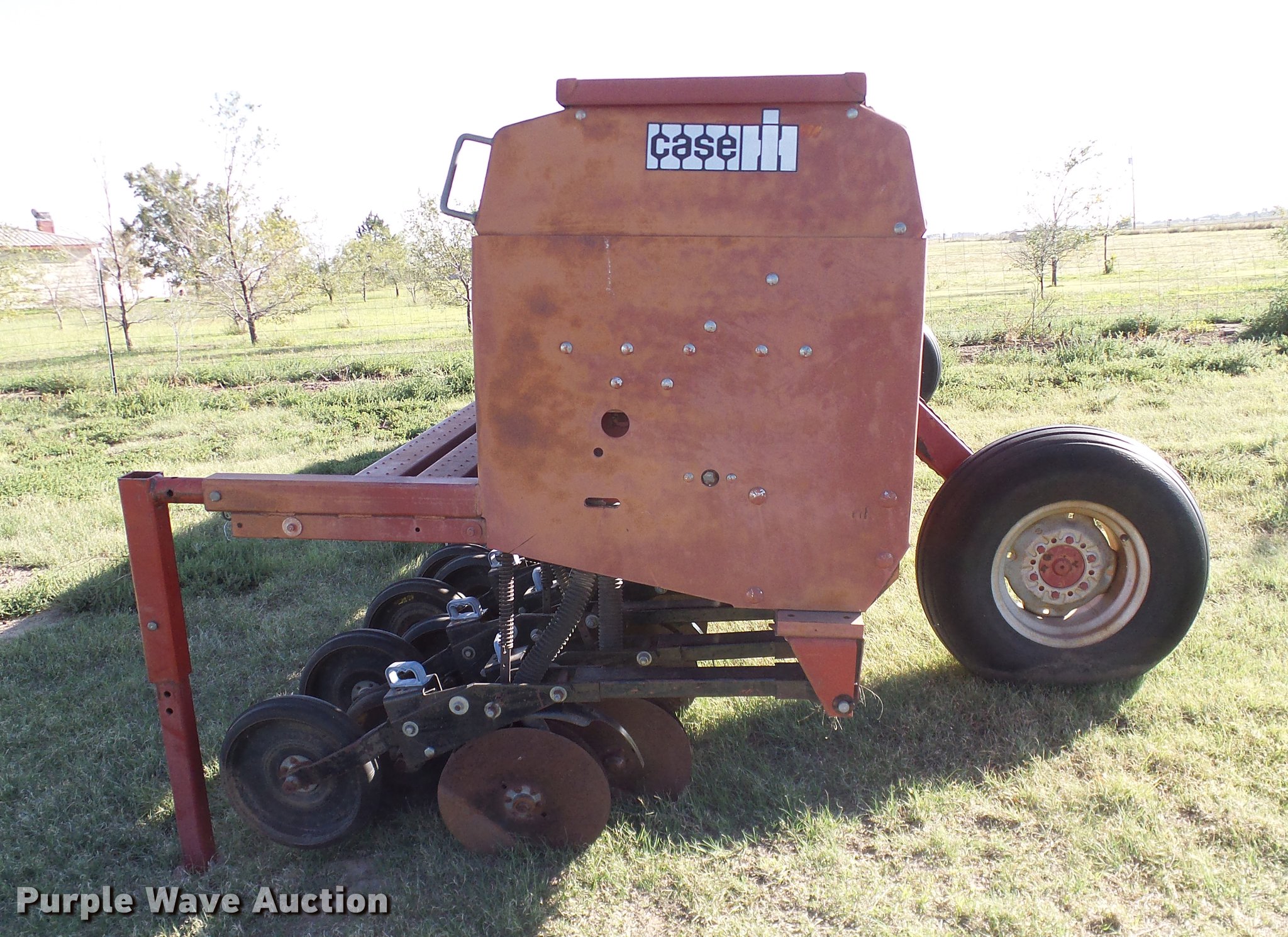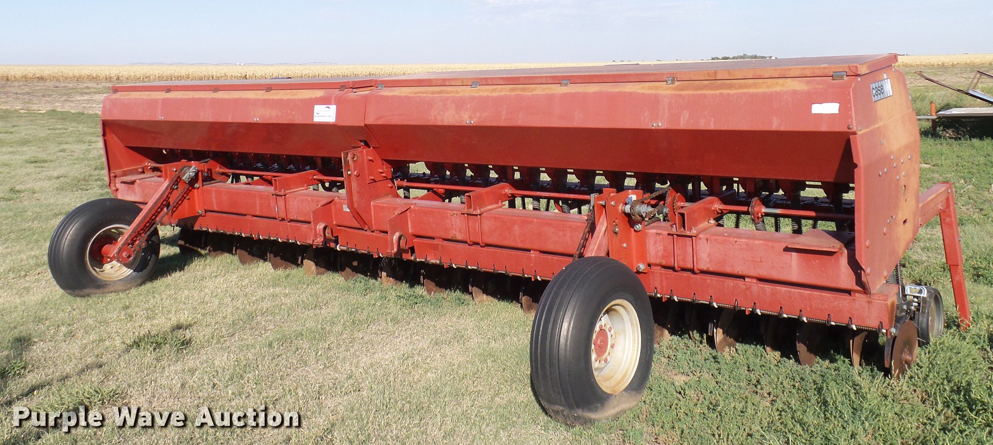 Purple Wave is selling a used Grain Drill or Seeder in Oklahoma. This item is a Case IH 5200 grain drill with the following: 19.5'W, 30 row units, 8" row spacing, Bulk fill system, Ground meter drive, HD spring down pressure, Double disk openers, Rubber closing system, Three point, (2) 9.5L-14 drive/outside tires, Serial 0100472