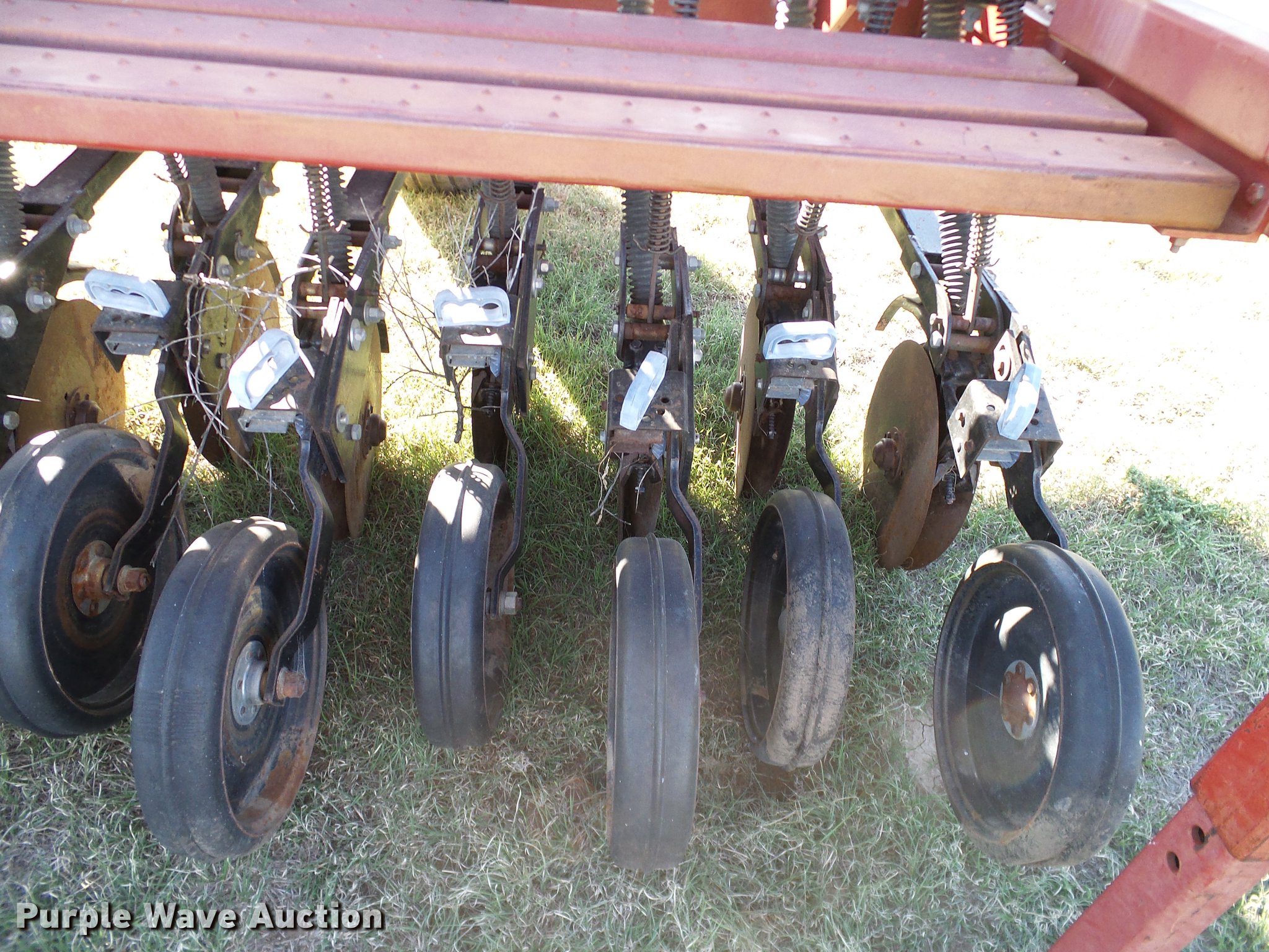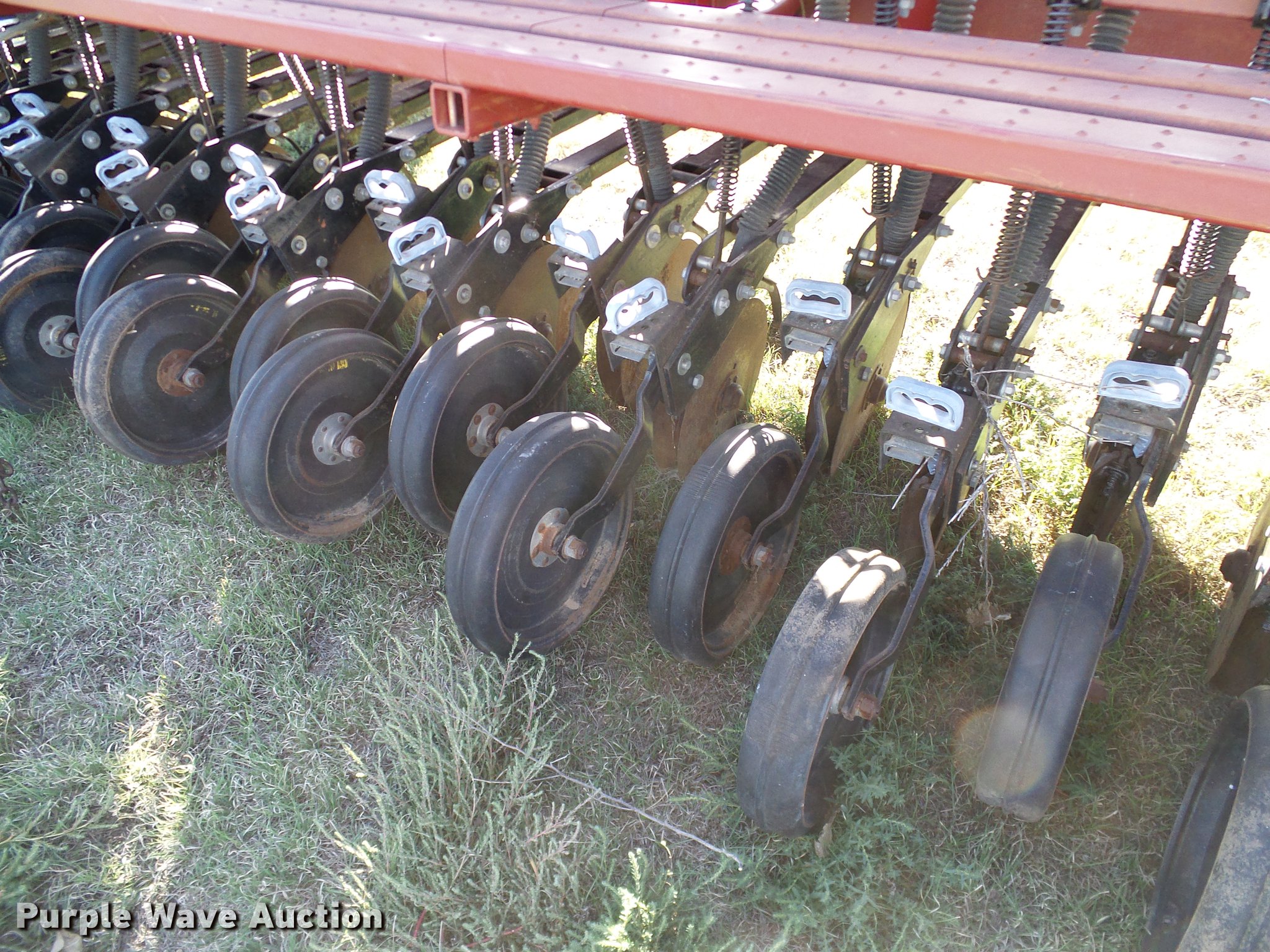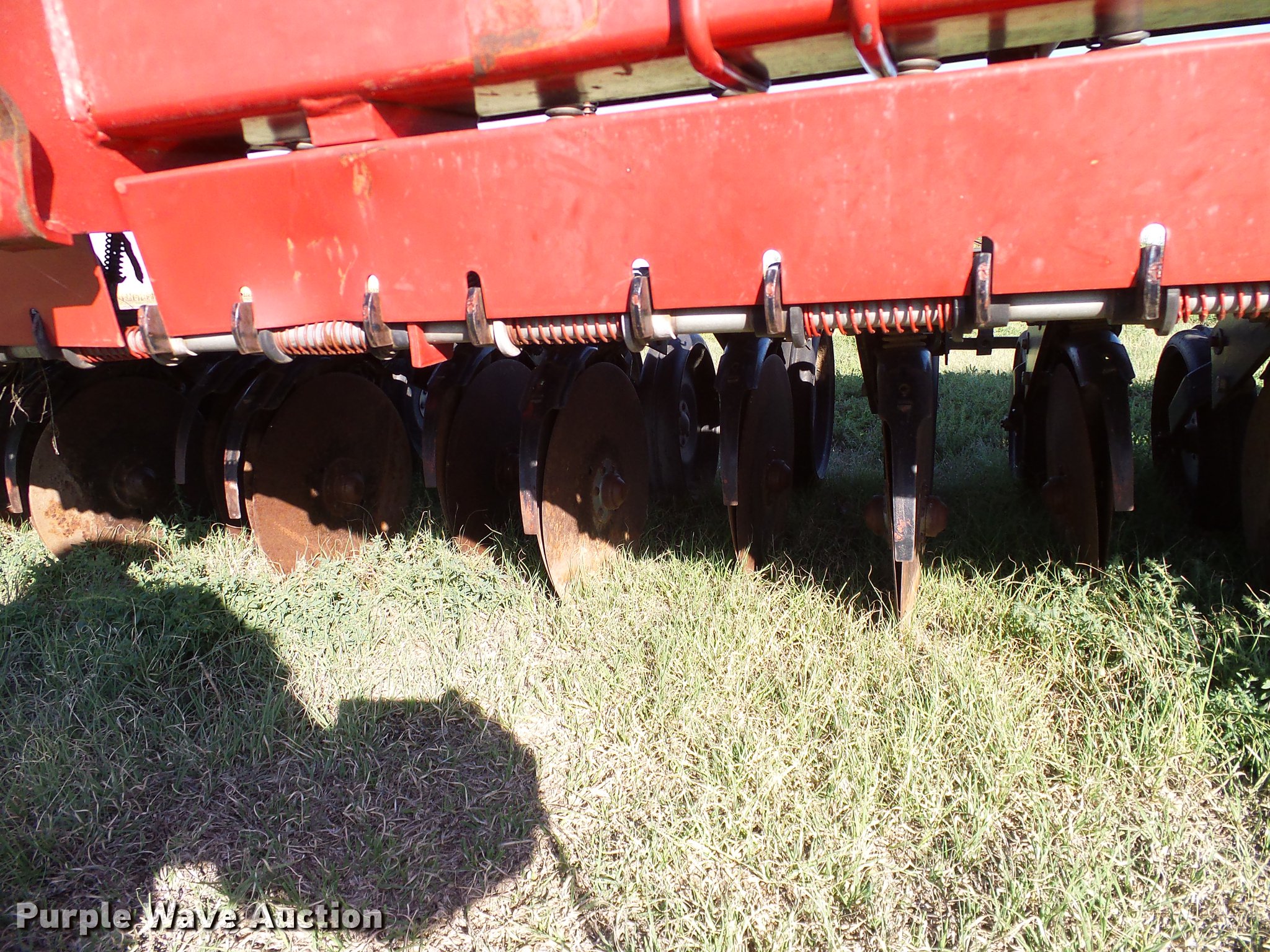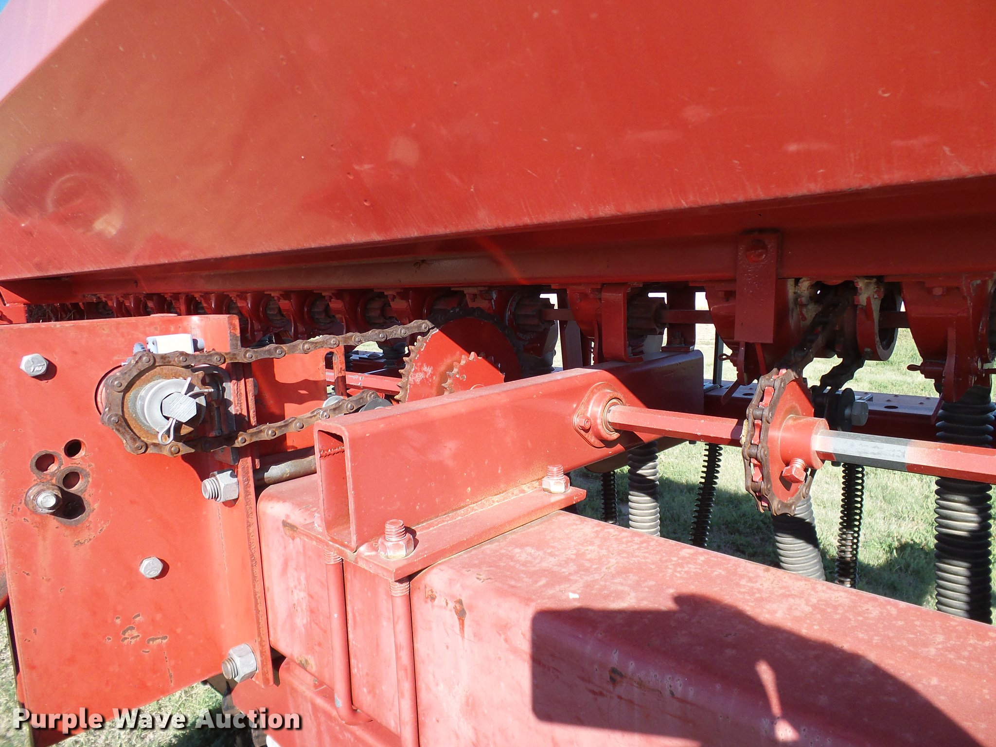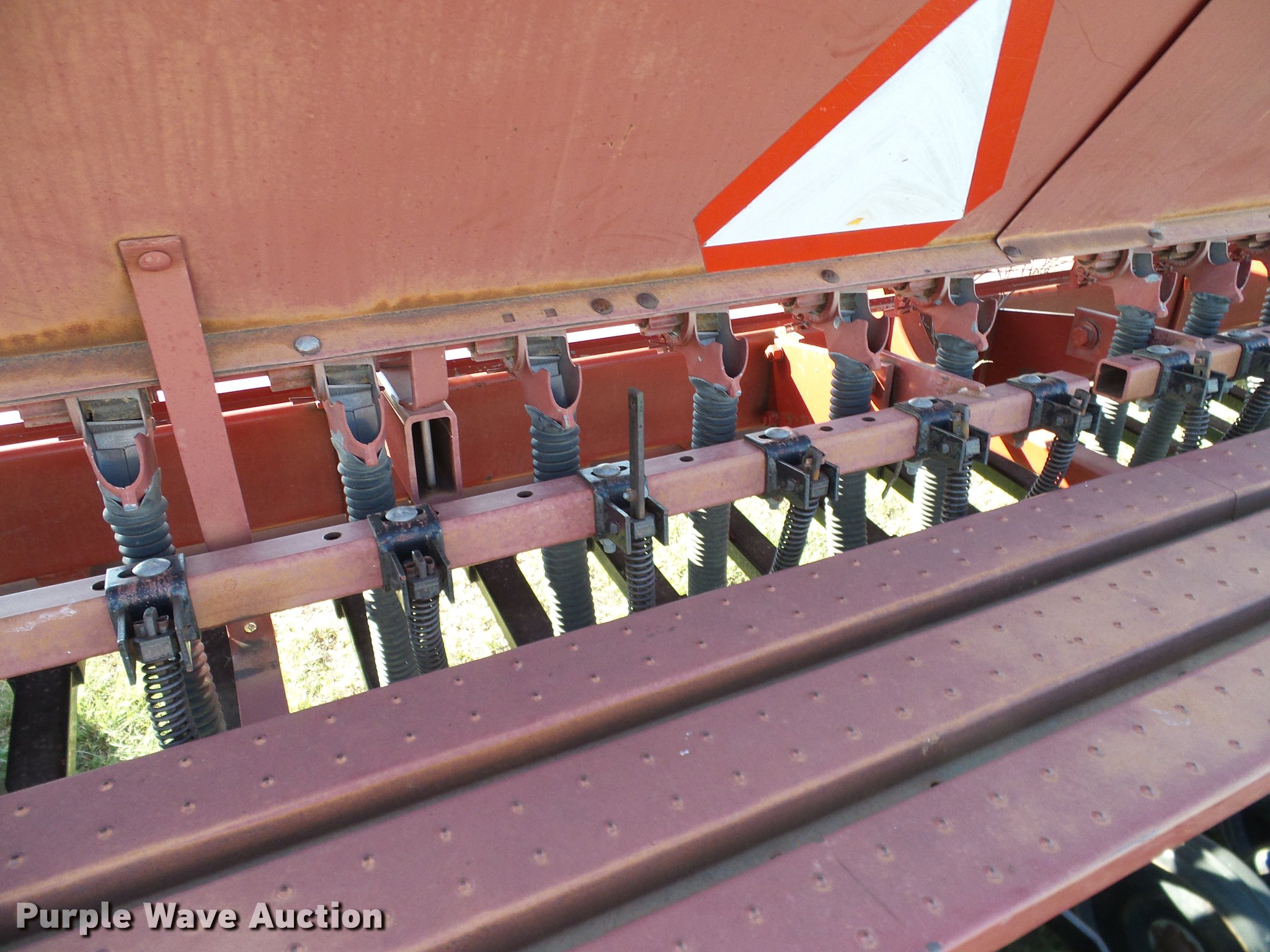 Purple Wave is selling a used Grain Drill or Seeder in Oklahoma. This item is a Case IH 5200 grain drill with the following: 19.5'W, 30 row units, 8" row spacing, Bulk fill system, Ground meter drive, HD spring down pressure, Double disk openers, Rubber closing system, Three point, (2) 9.5L-14 drive/outside tires, Serial 0100472
