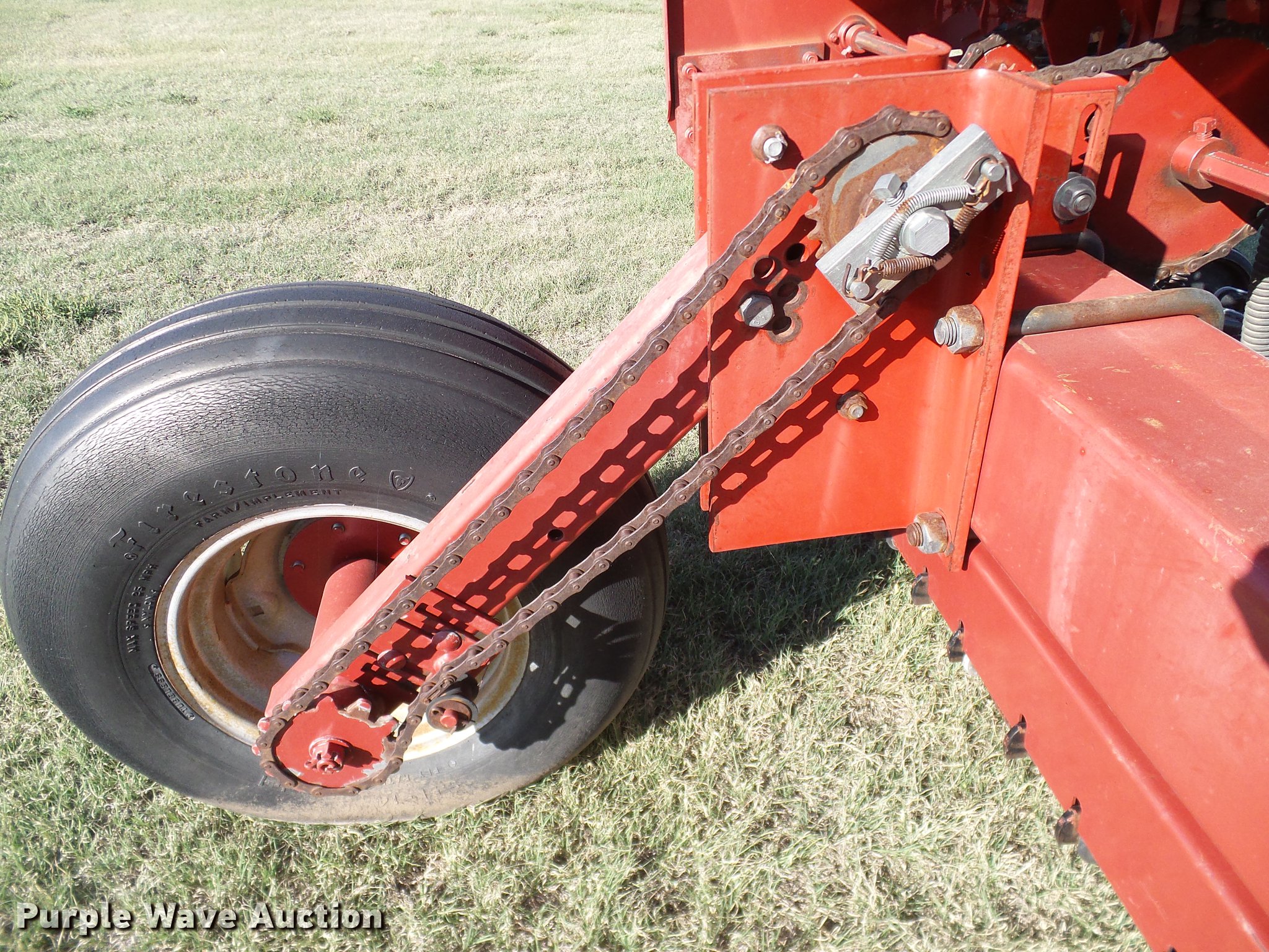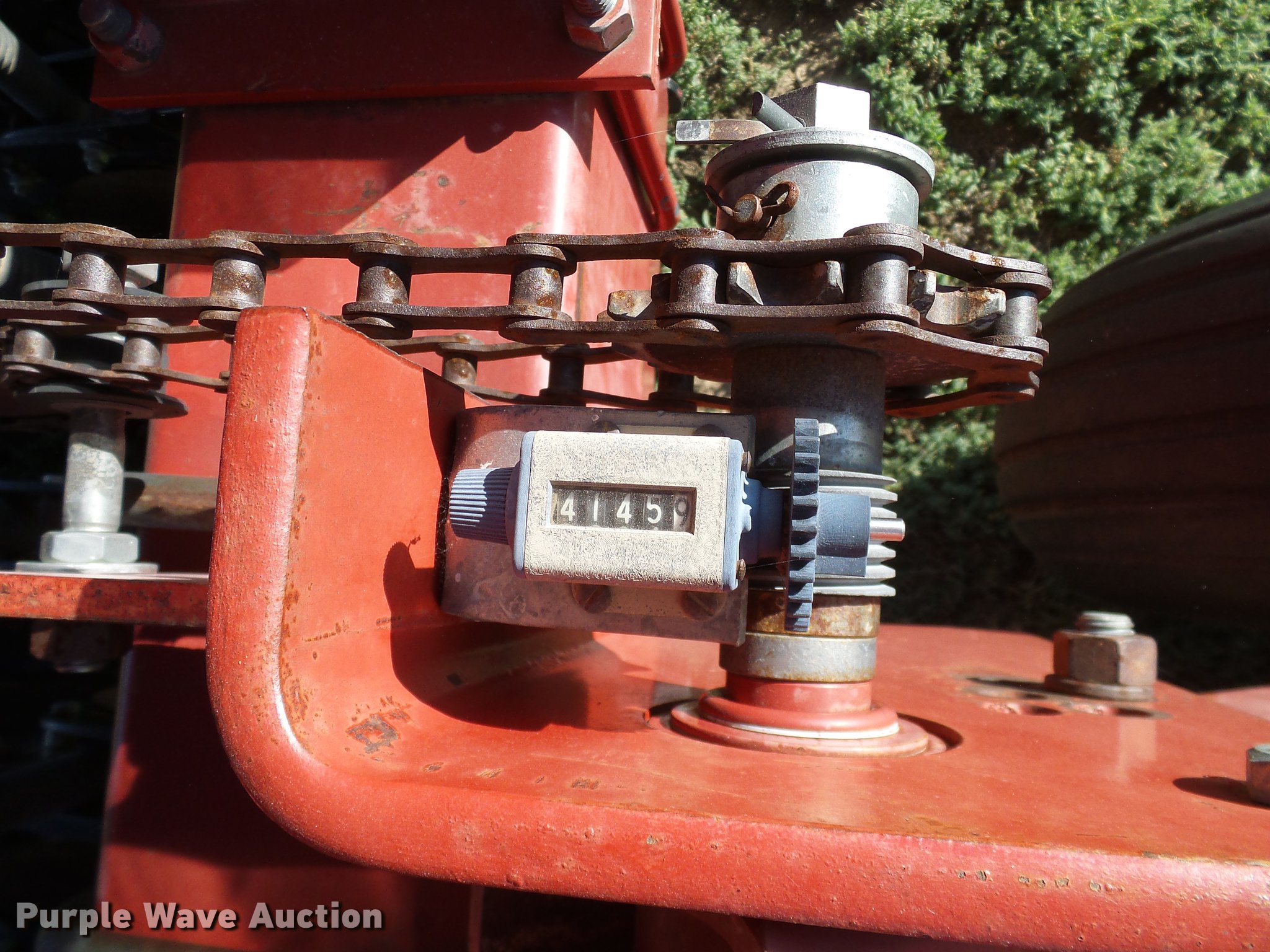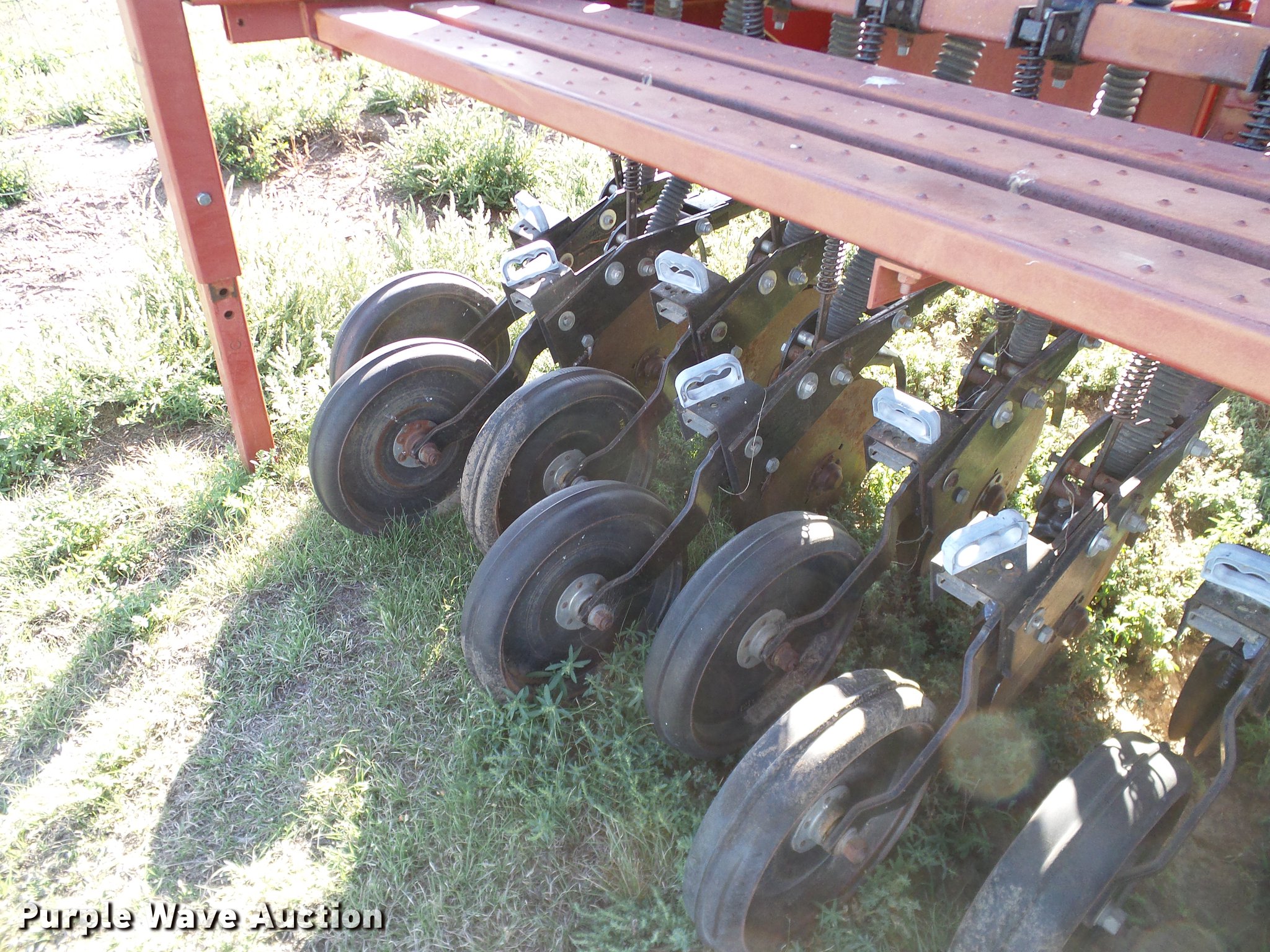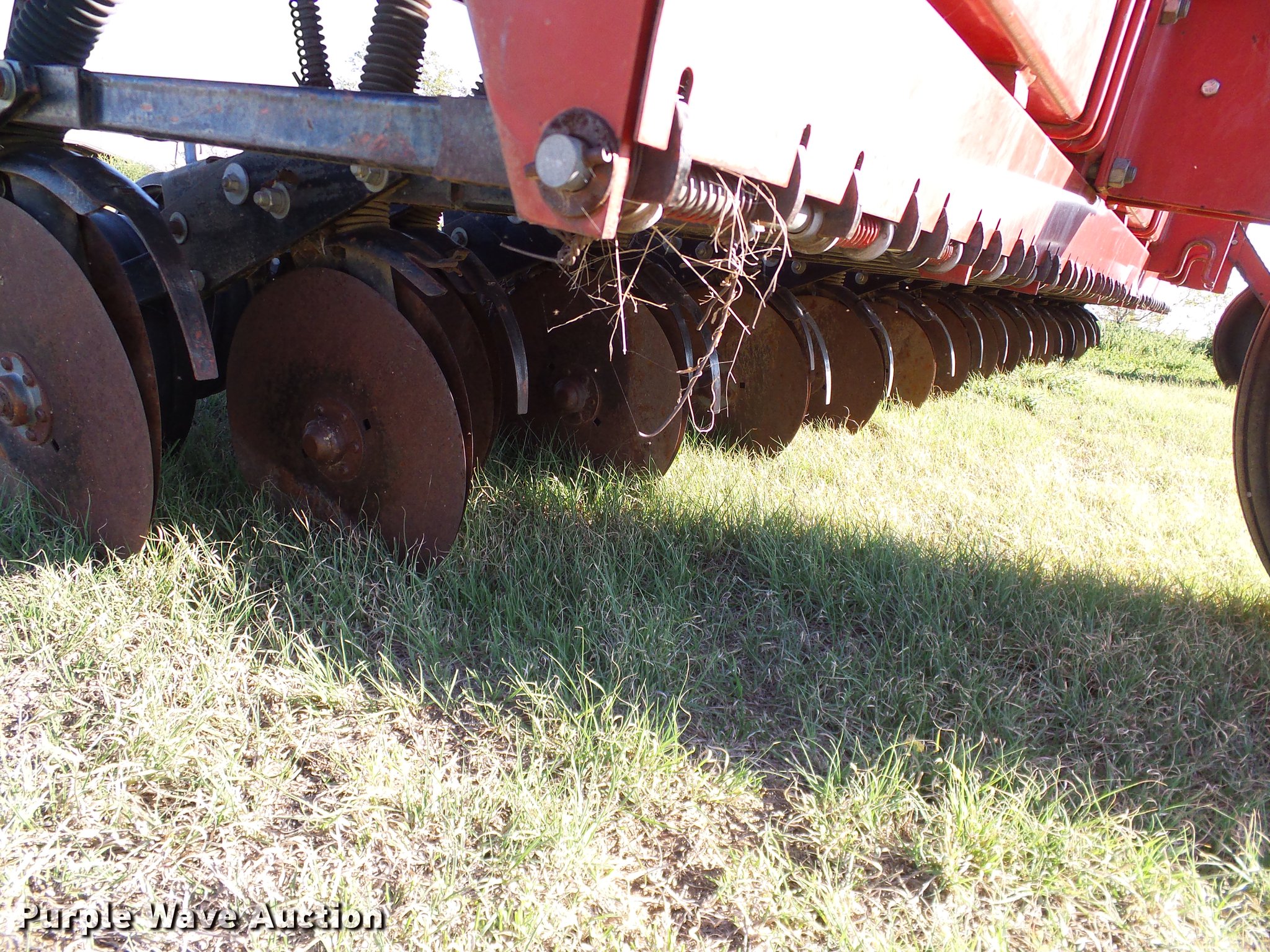 Purple Wave is selling a used Grain Drill or Seeder in Oklahoma. This item is a Case IH 5200 grain drill with the following: 19.5'W, 30 row units, 8" row spacing, Bulk fill system, Ground meter drive, HD spring down pressure, Double disk openers, Rubber closing system, Three point, (2) 9.5L-14 drive/outside tires, Serial 0100472