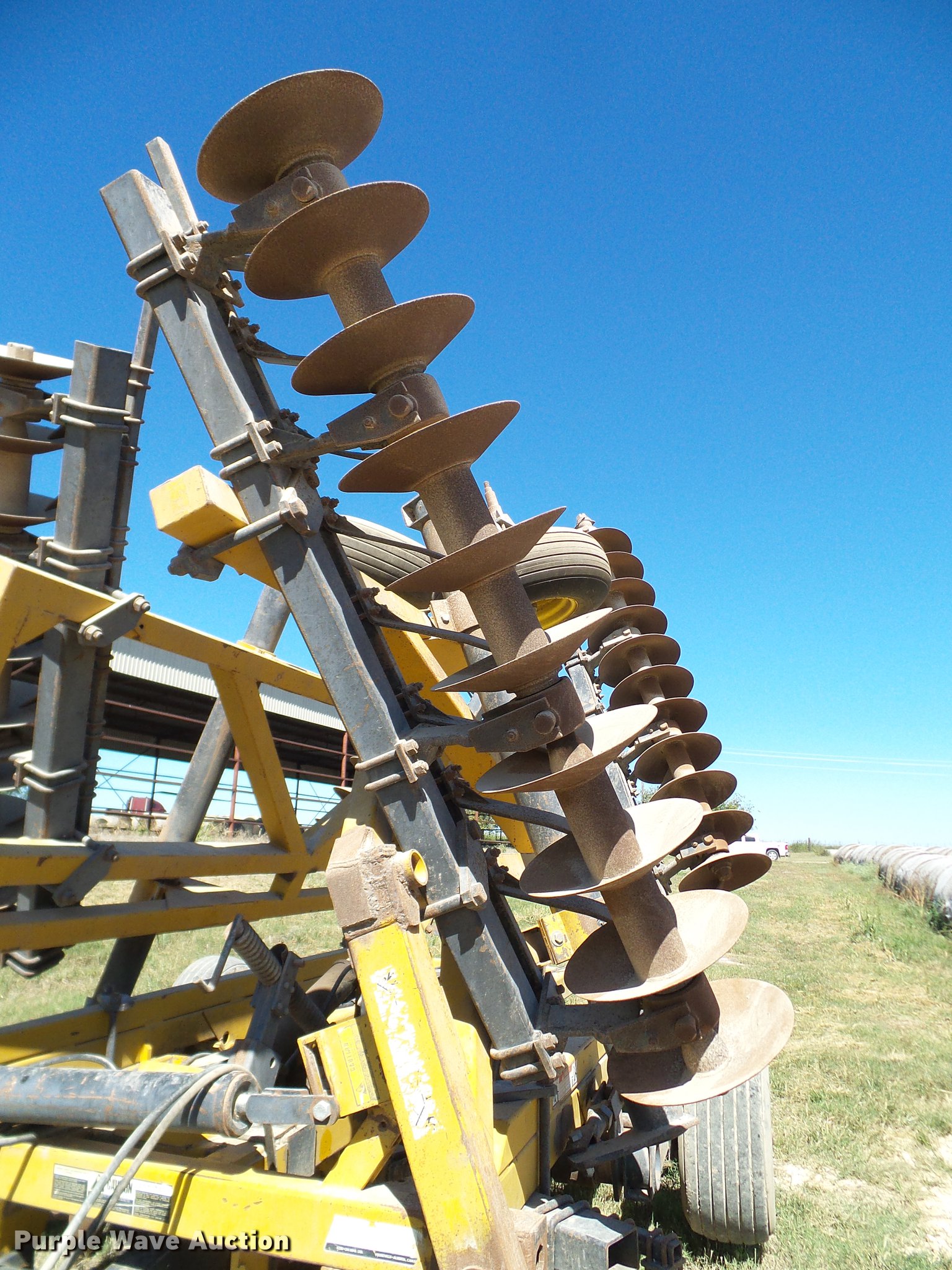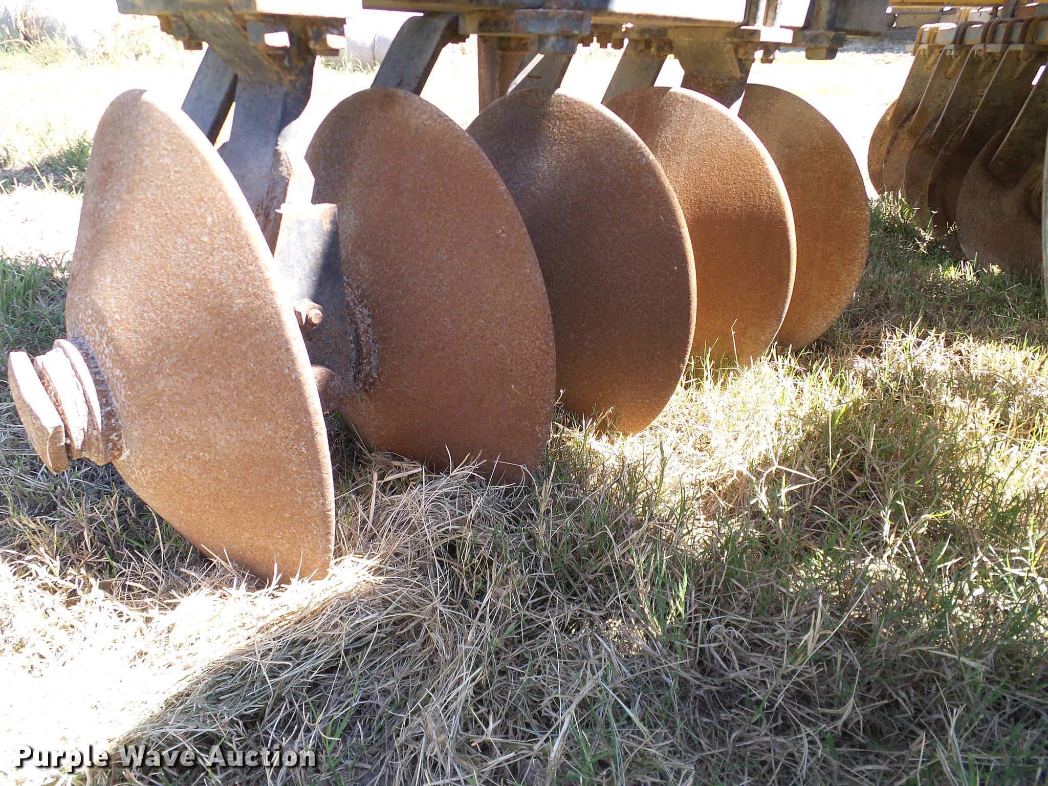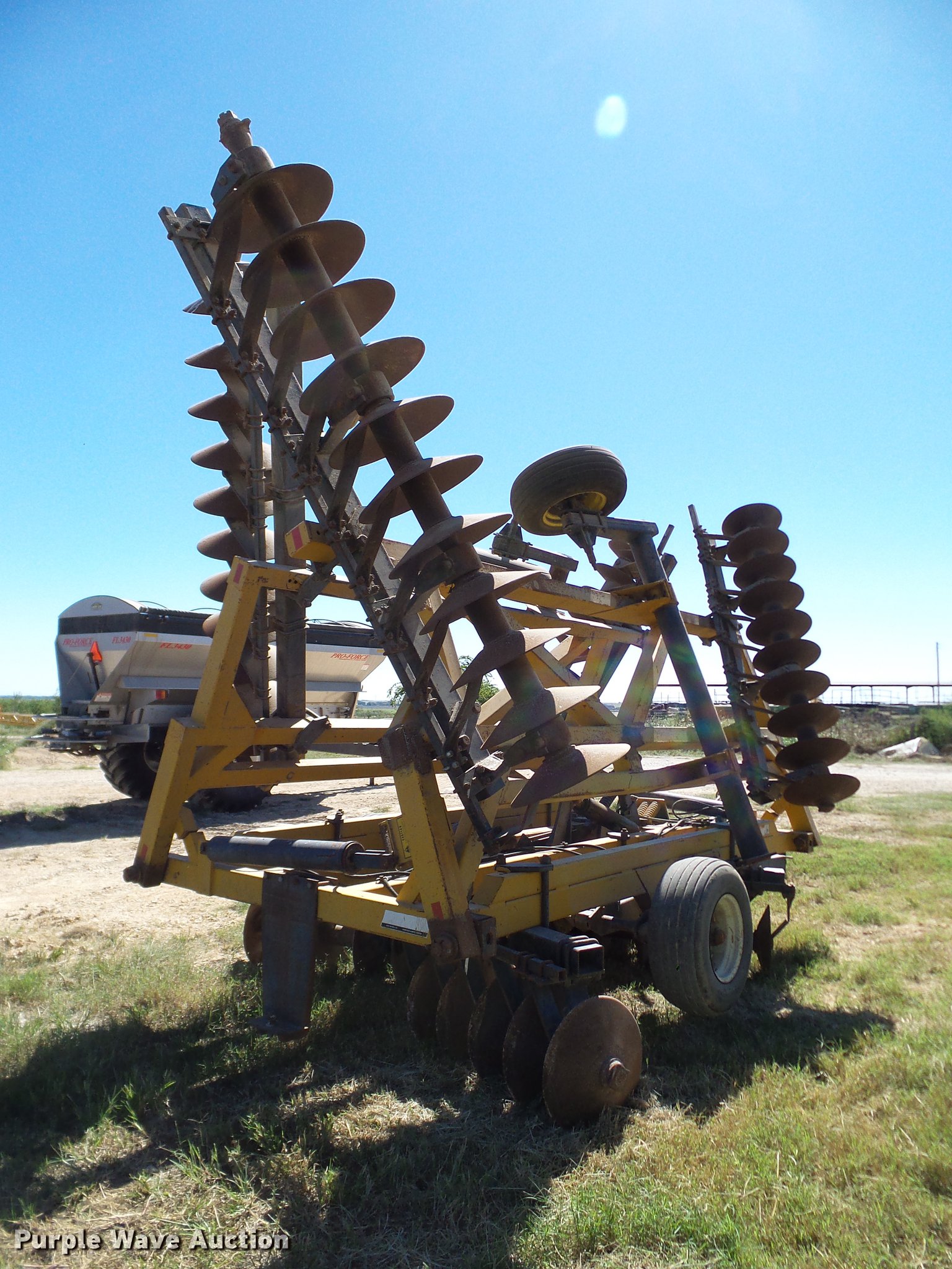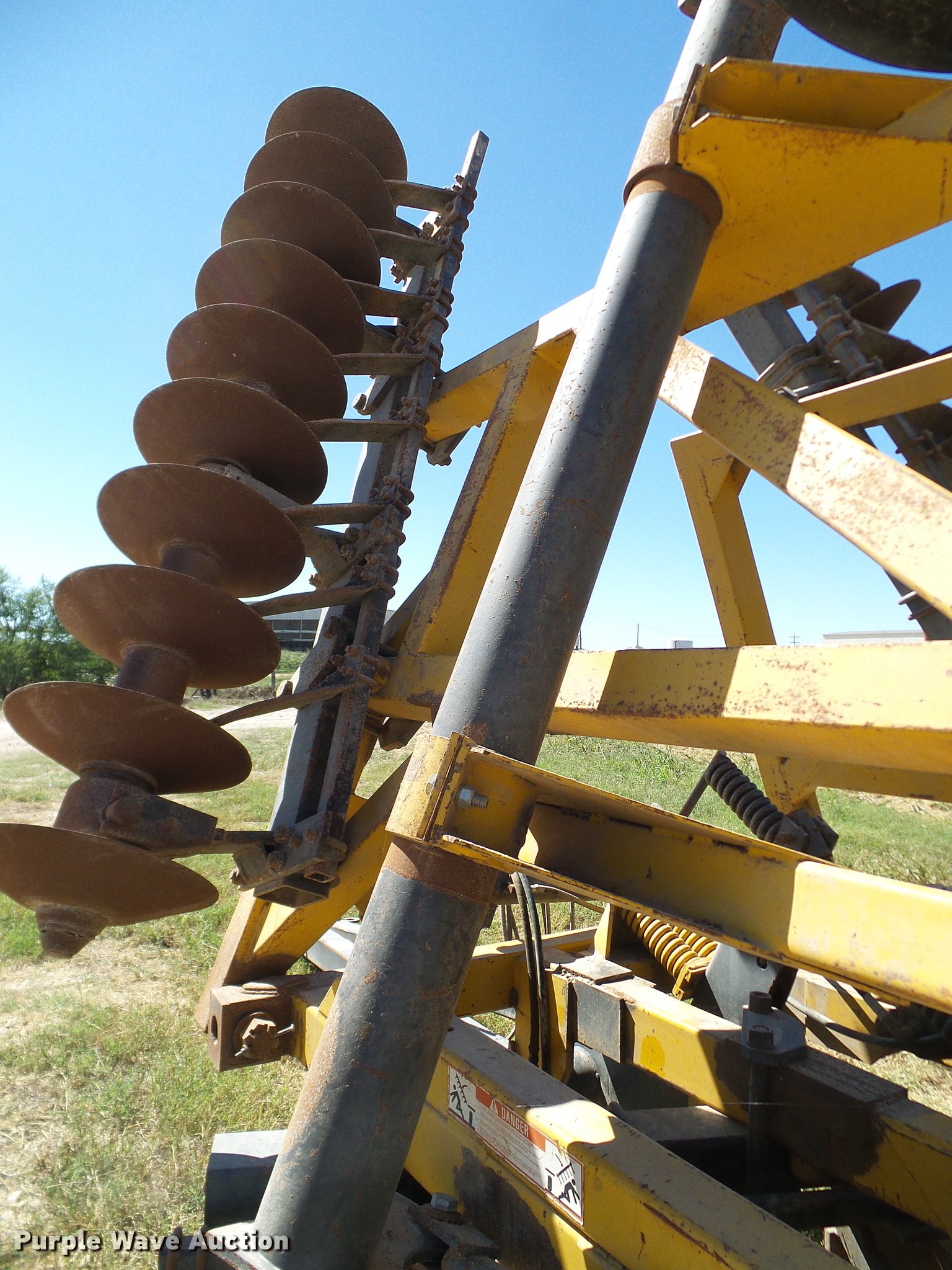 Purple Wave is selling a used Disk in Texas. This item is a Ezee-On double offset disk with the following: 28'W, 20" diameter front blades, 22" diameter rear blades, 10" spacing, Disk scrapers, Manual leveler, Hydraulic fold, Slab hitch, Rear hitch, 12.5-16 tires, Frame weld repairs, (3) wheels and tires missing
