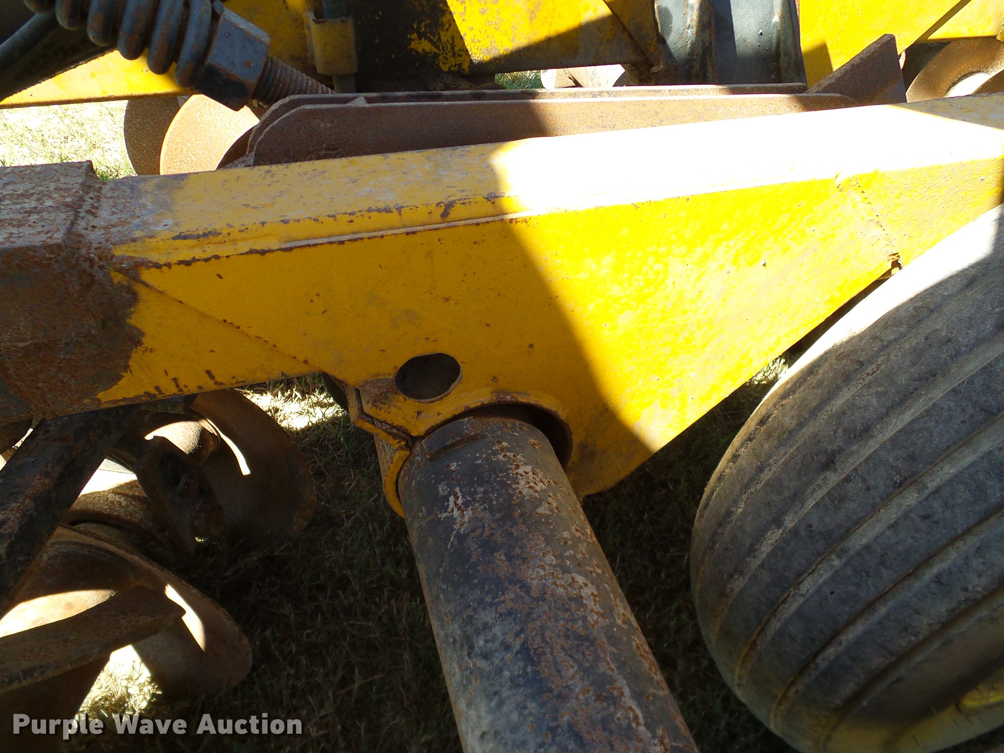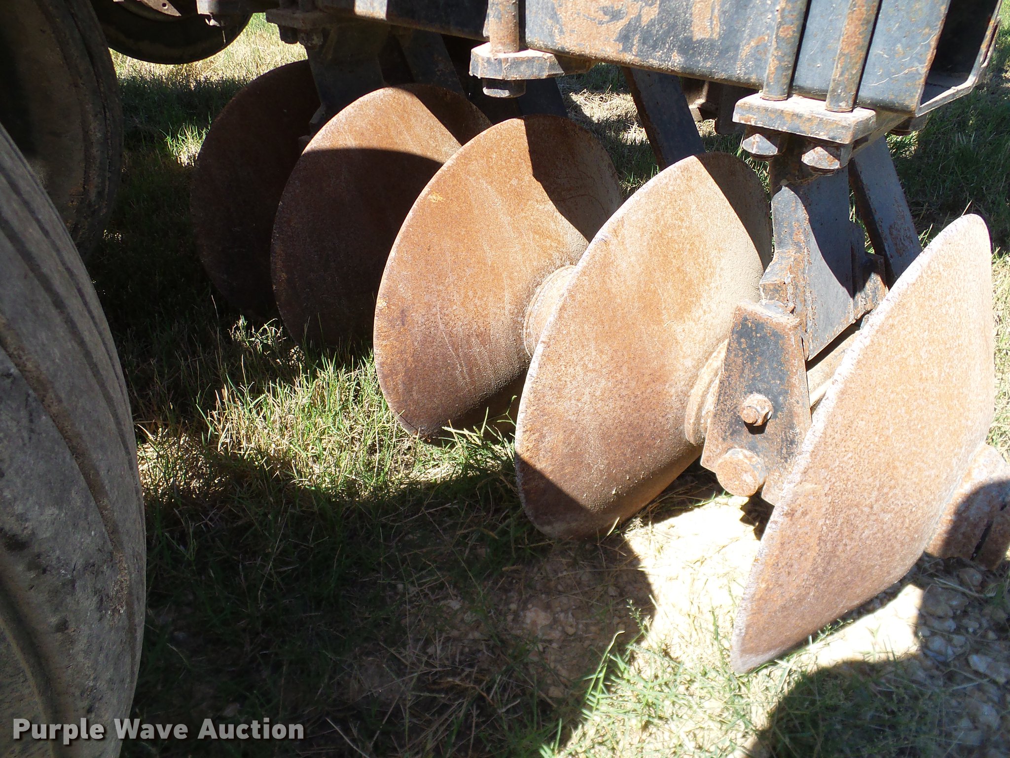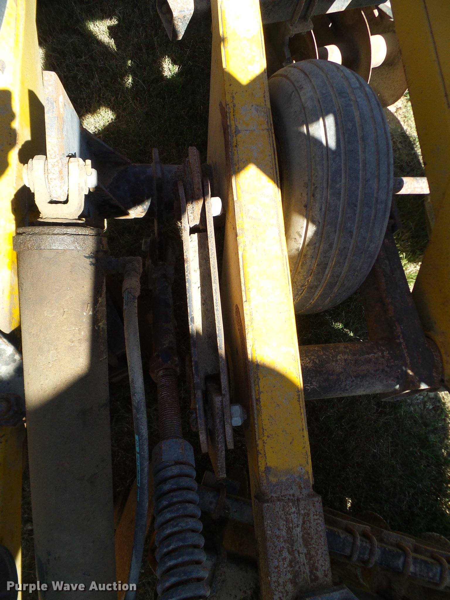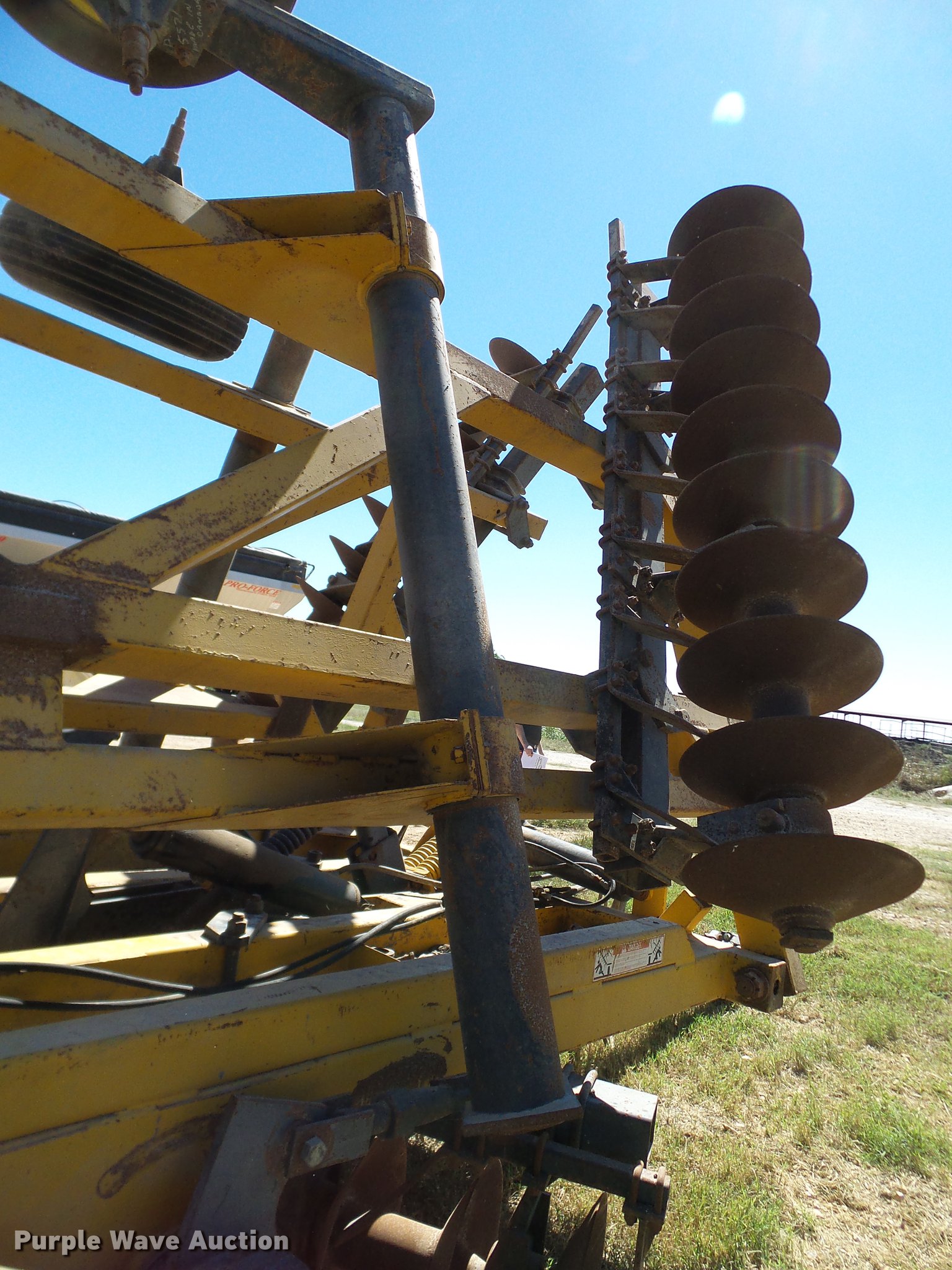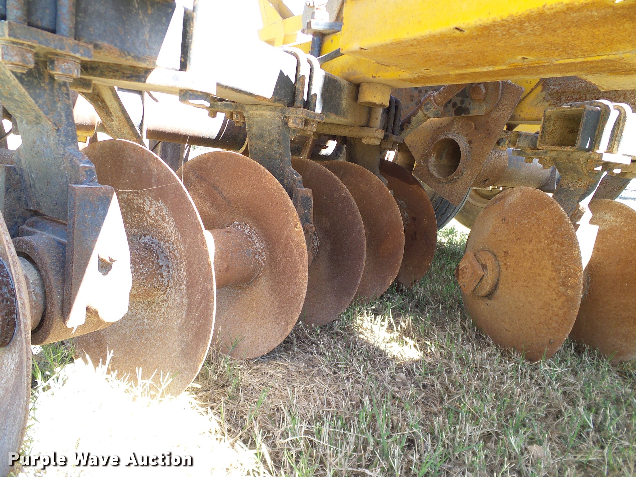 Purple Wave is selling a used Disk in Texas. This item is a Ezee-On double offset disk with the following: 28'W, 20" diameter front blades, 22" diameter rear blades, 10" spacing, Disk scrapers, Manual leveler, Hydraulic fold, Slab hitch, Rear hitch, 12.5-16 tires, Frame weld repairs, (3) wheels and tires missing