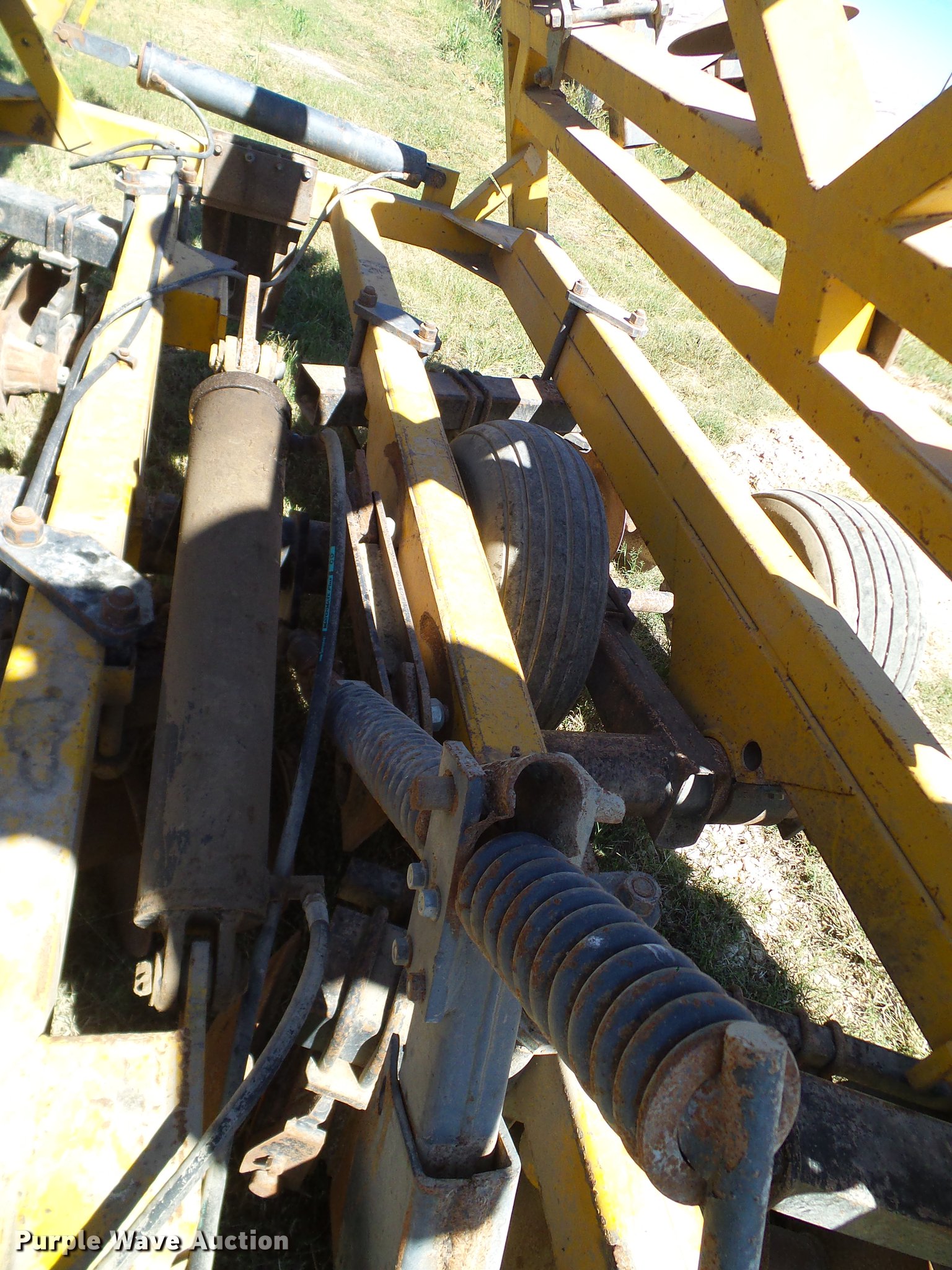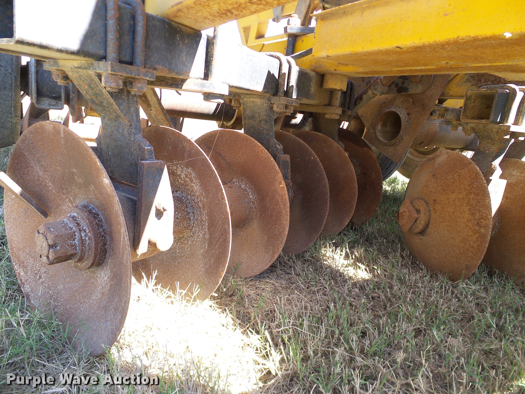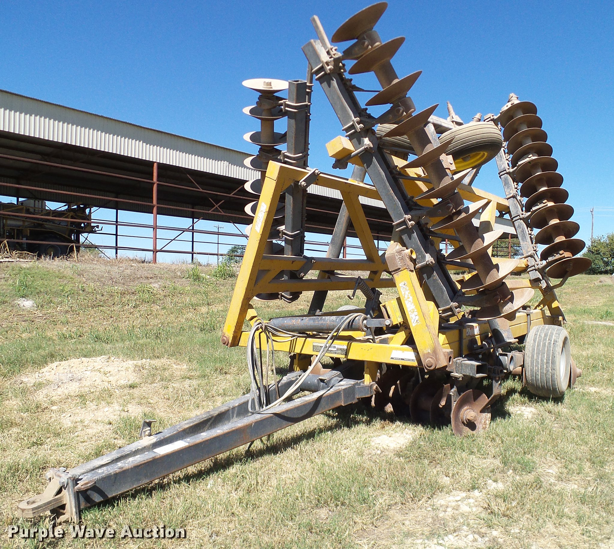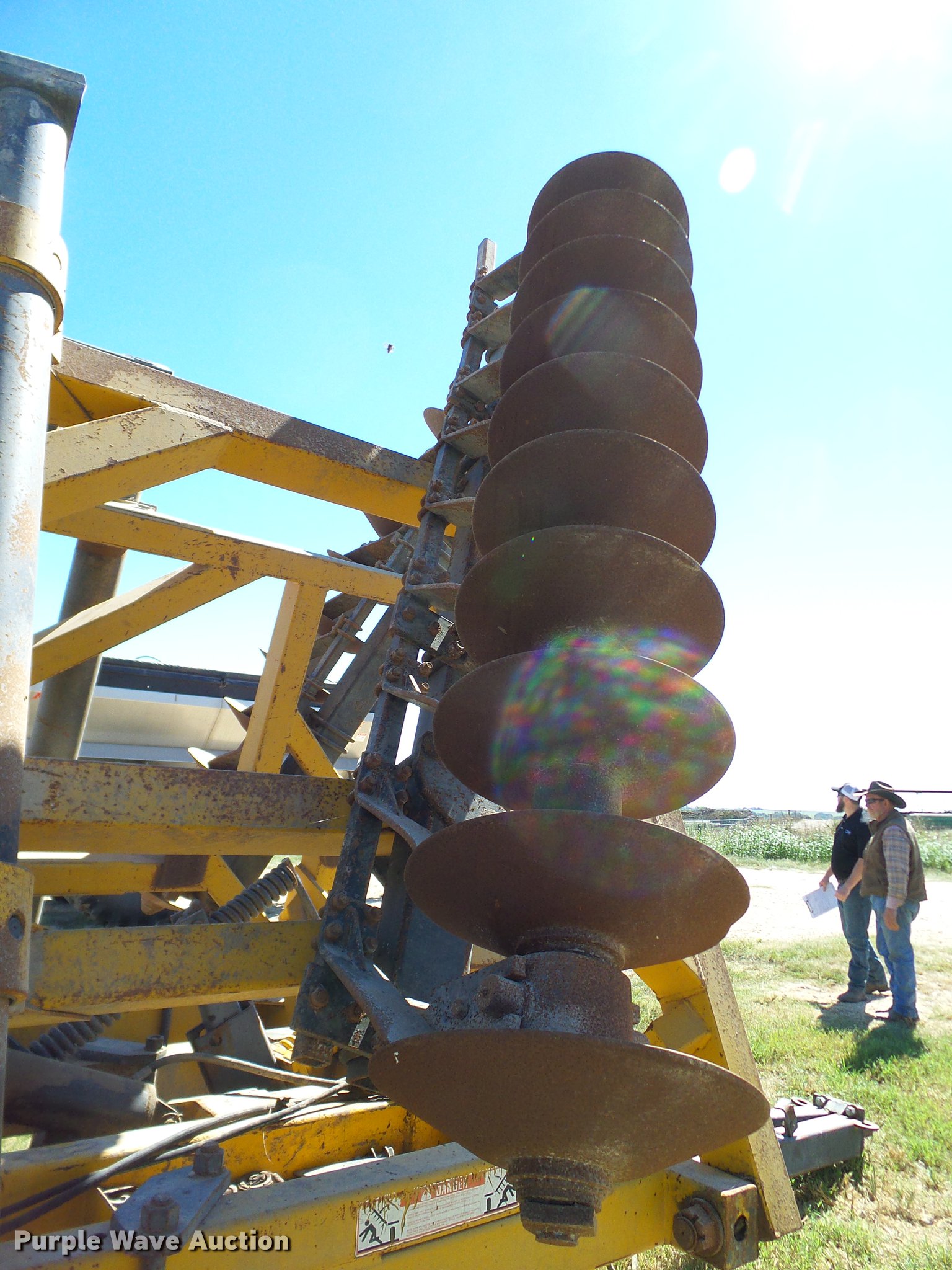 Purple Wave is selling a used Disk in Texas. This item is a Ezee-On double offset disk with the following: 28'W, 20" diameter front blades, 22" diameter rear blades, 10" spacing, Disk scrapers, Manual leveler, Hydraulic fold, Slab hitch, Rear hitch, 12.5-16 tires, Frame weld repairs, (3) wheels and tires missing