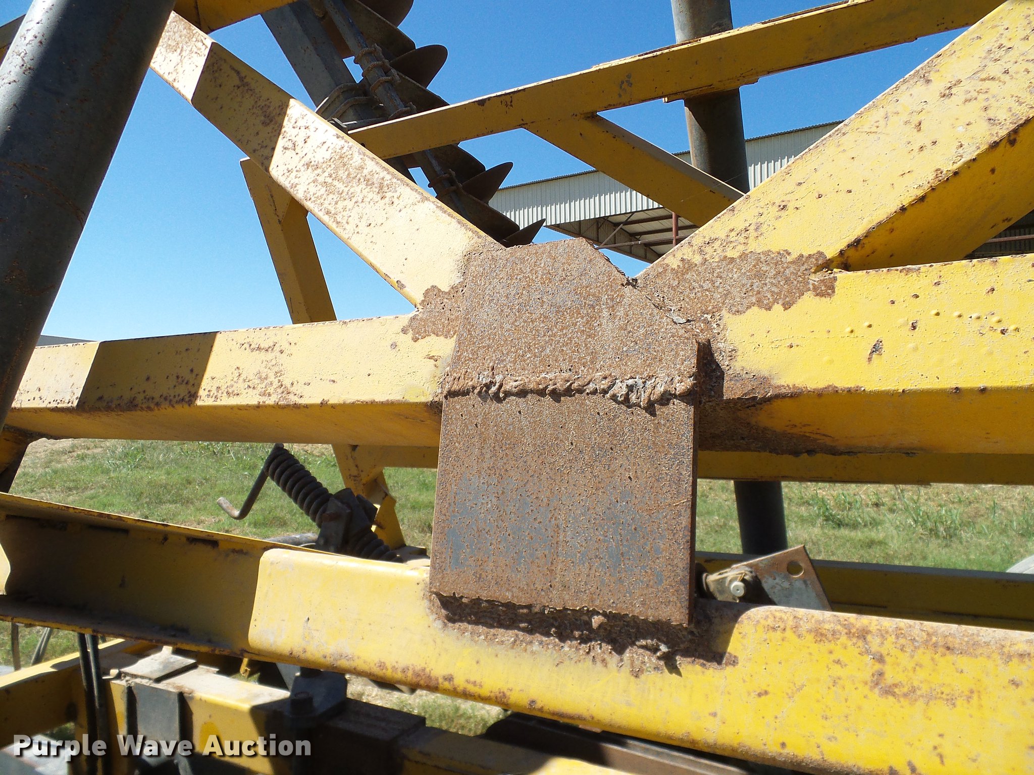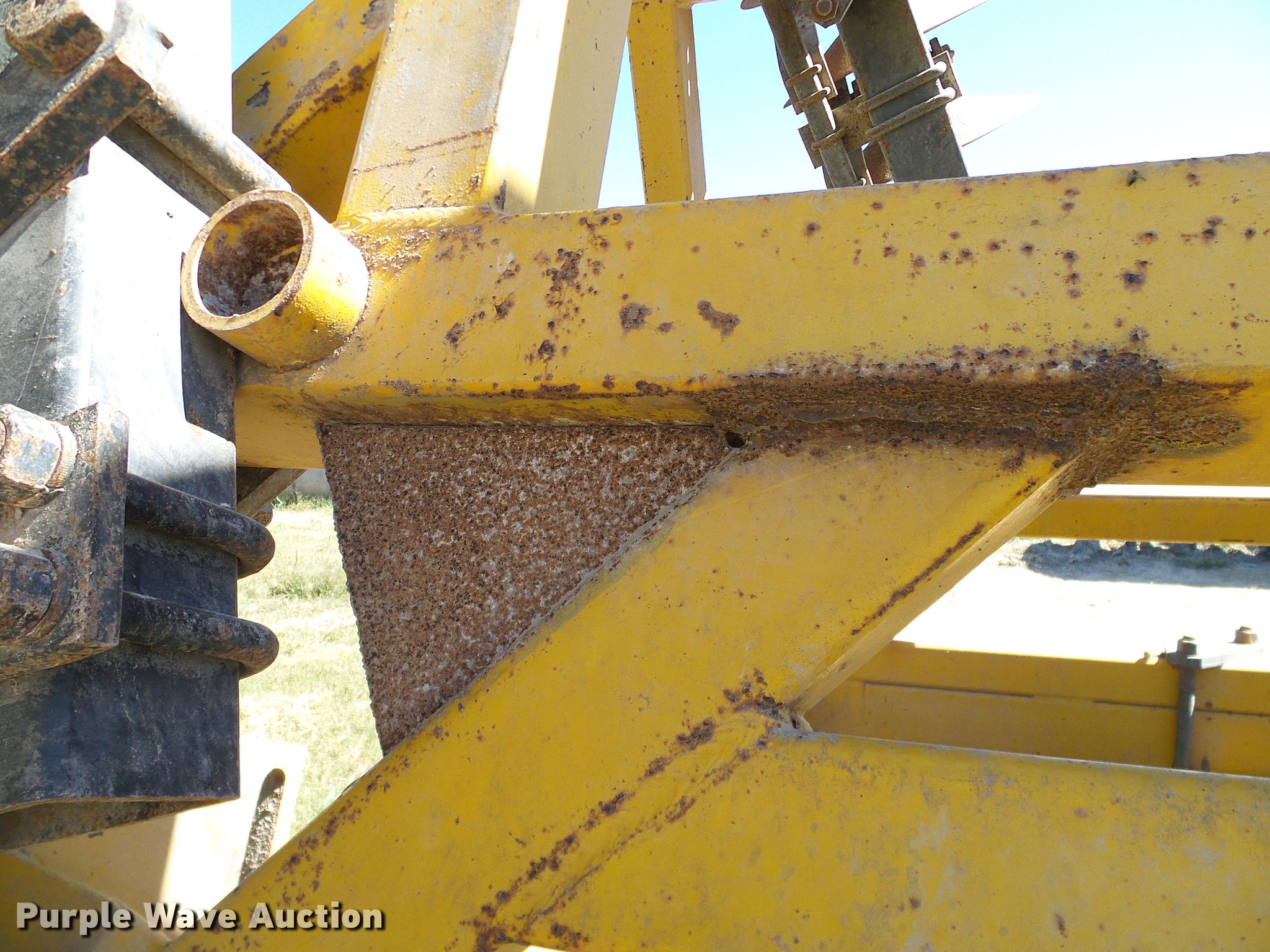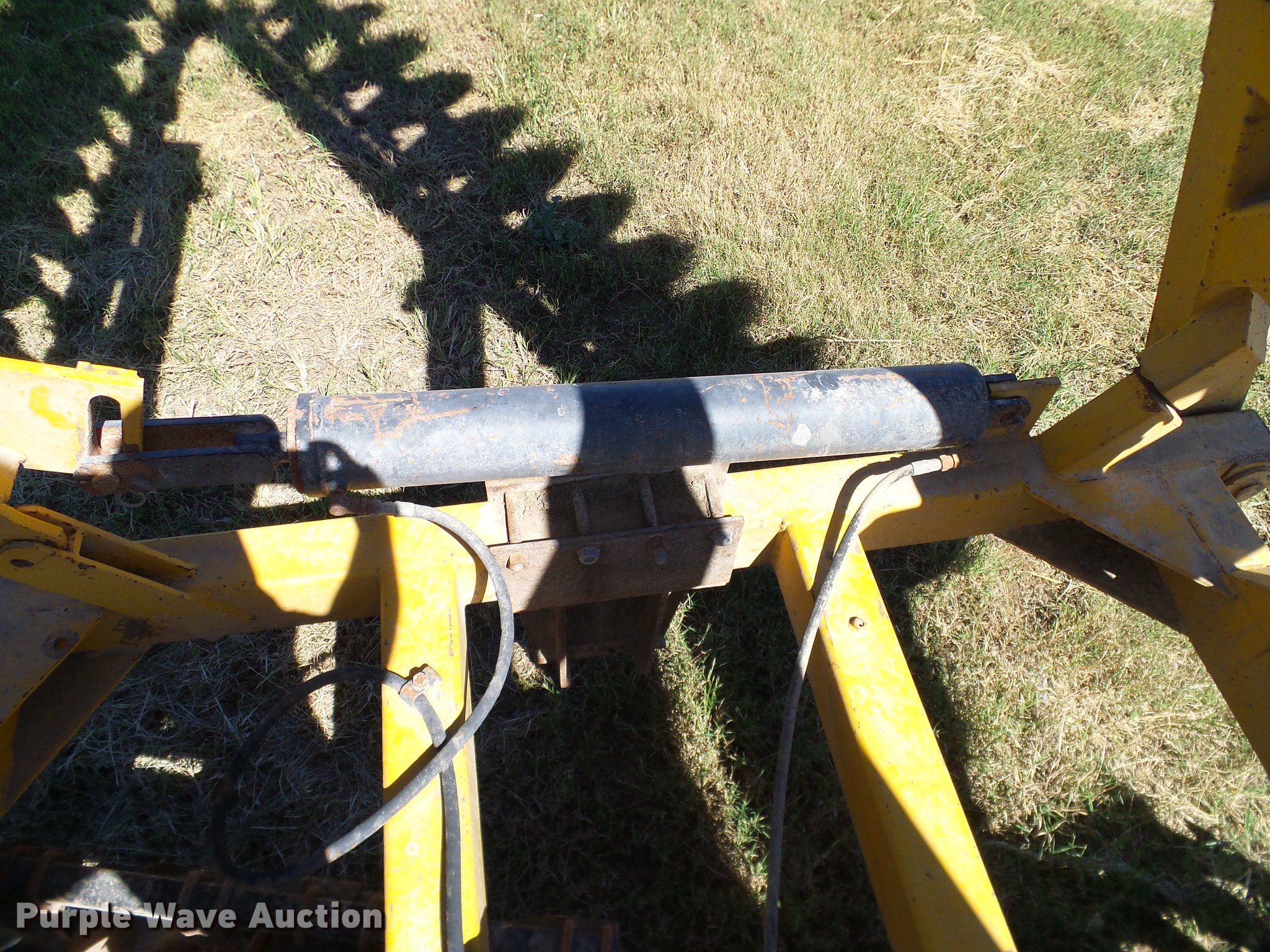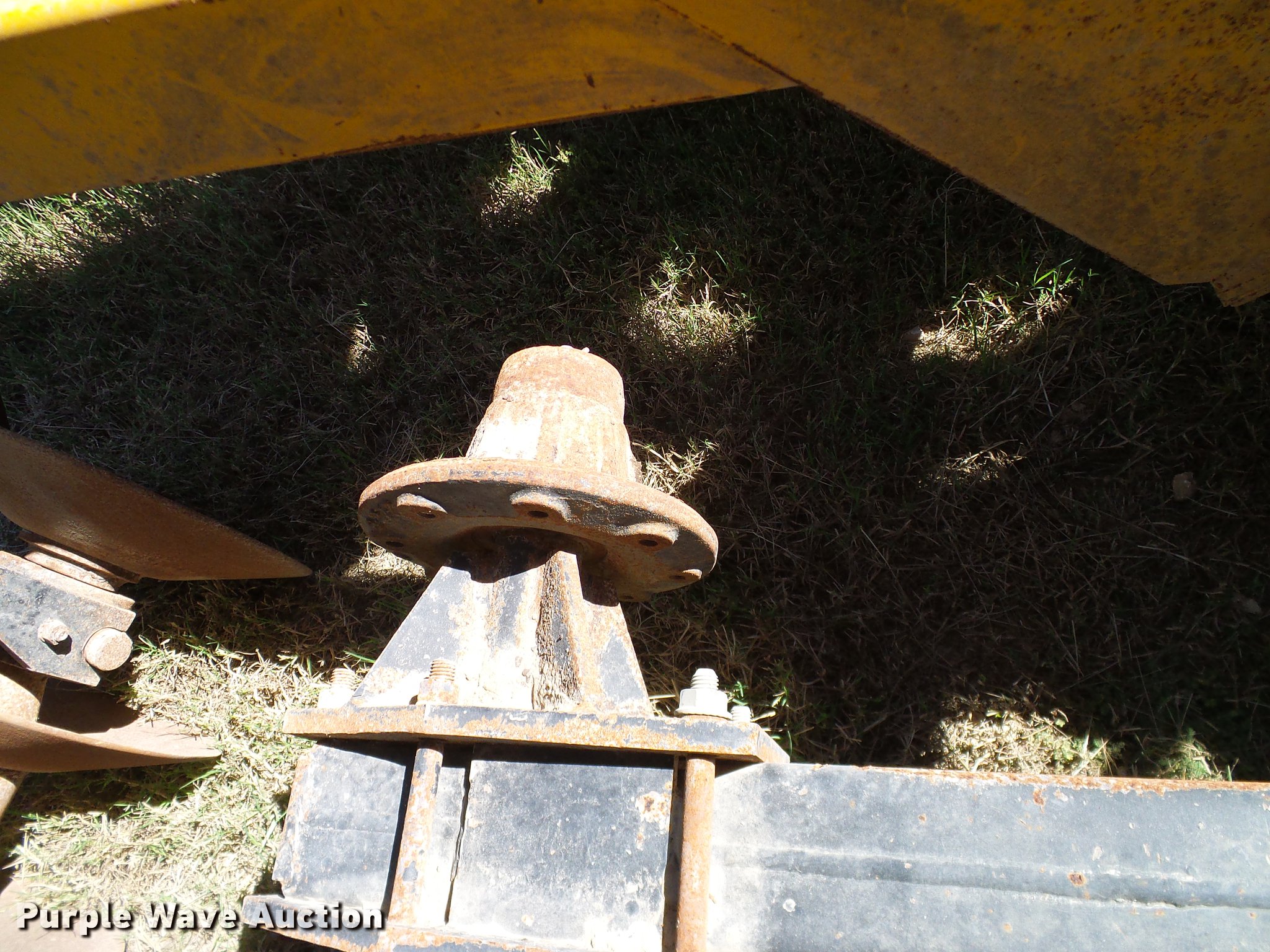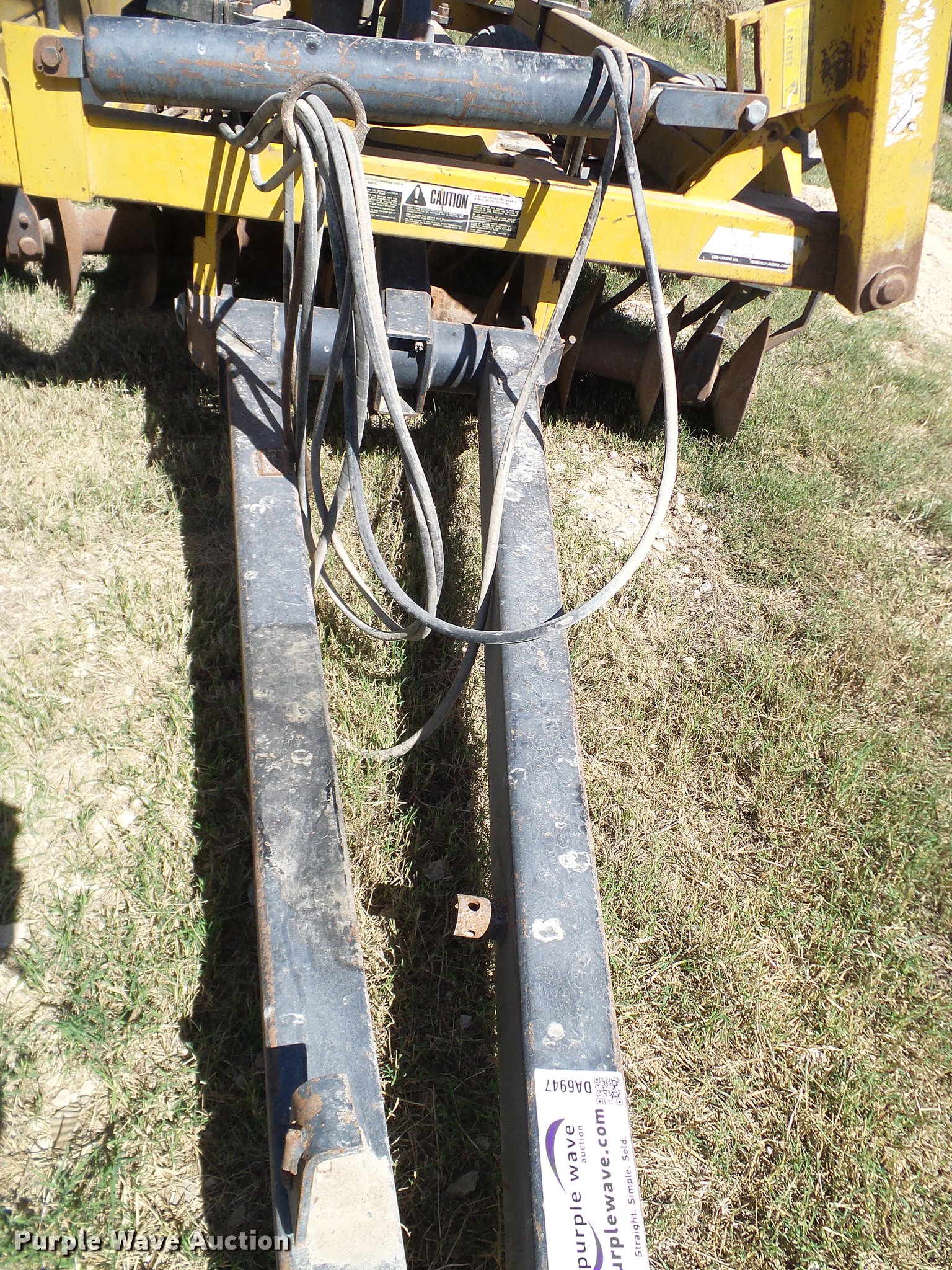Purple Wave is selling a used Disk in Texas. This item is a Ezee-On double offset disk with the following: 28'W, 20" diameter front blades, 22" diameter rear blades, 10" spacing, Disk scrapers, Manual leveler, Hydraulic fold, Slab hitch, Rear hitch, 12.5-16 tires, Frame weld repairs, (3) wheels and tires missing
