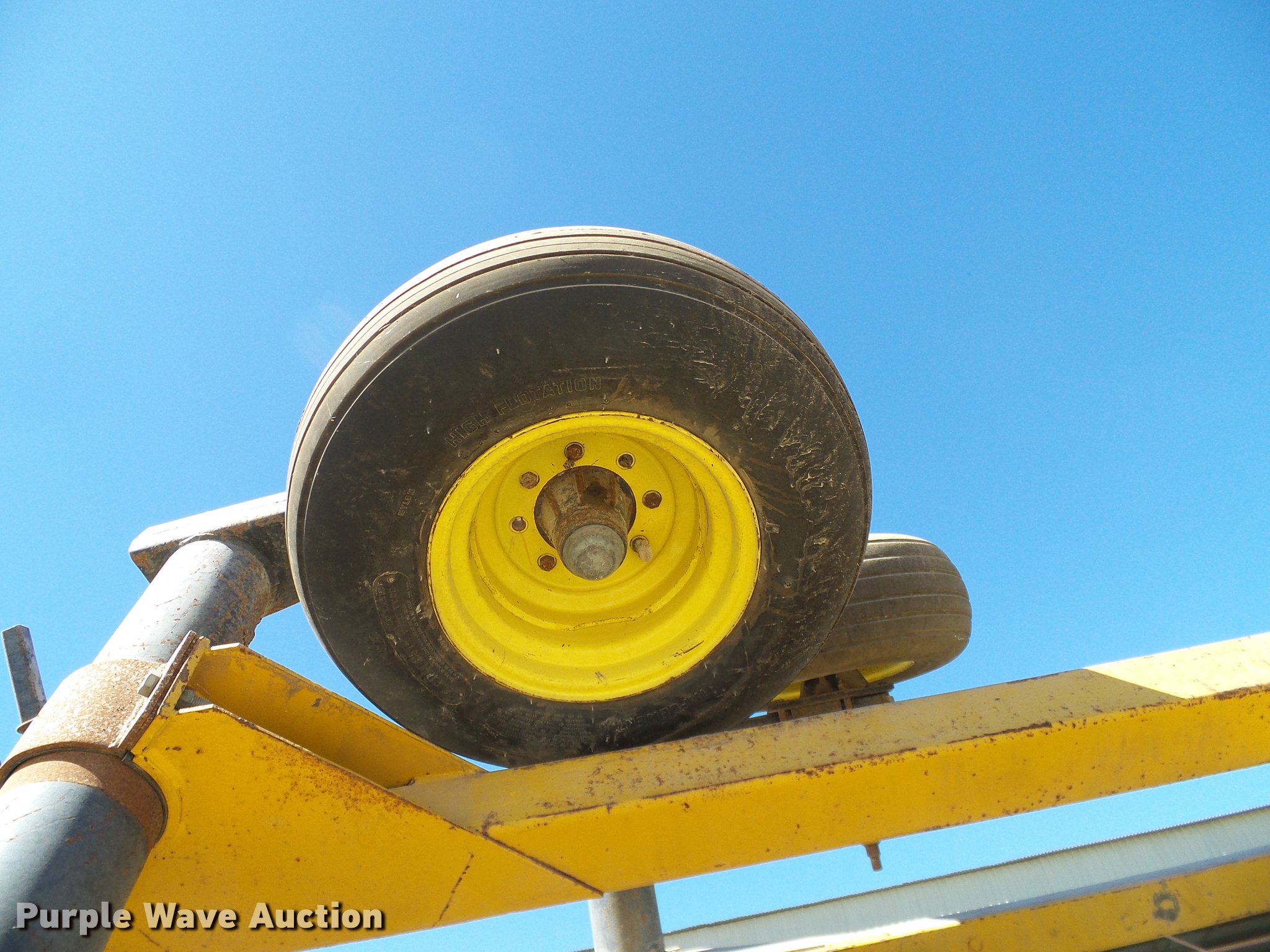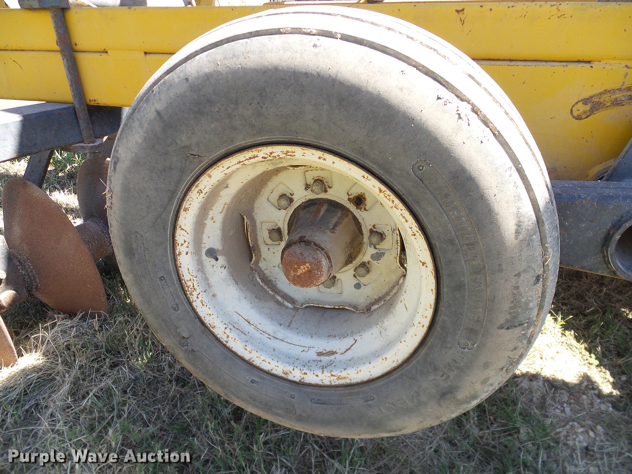 Ezee-On double offset disk. 28'W, 20" diameter front blades, 22" diameter rear blades, 10" spacing, Disk scrapers, Manual leveler, Hydraulic fold, Slab hitch, Rear hitch, 12.5-16 tires, Frame weld repairs, (3) wheels and tires missing. Schwertner, TX 76573