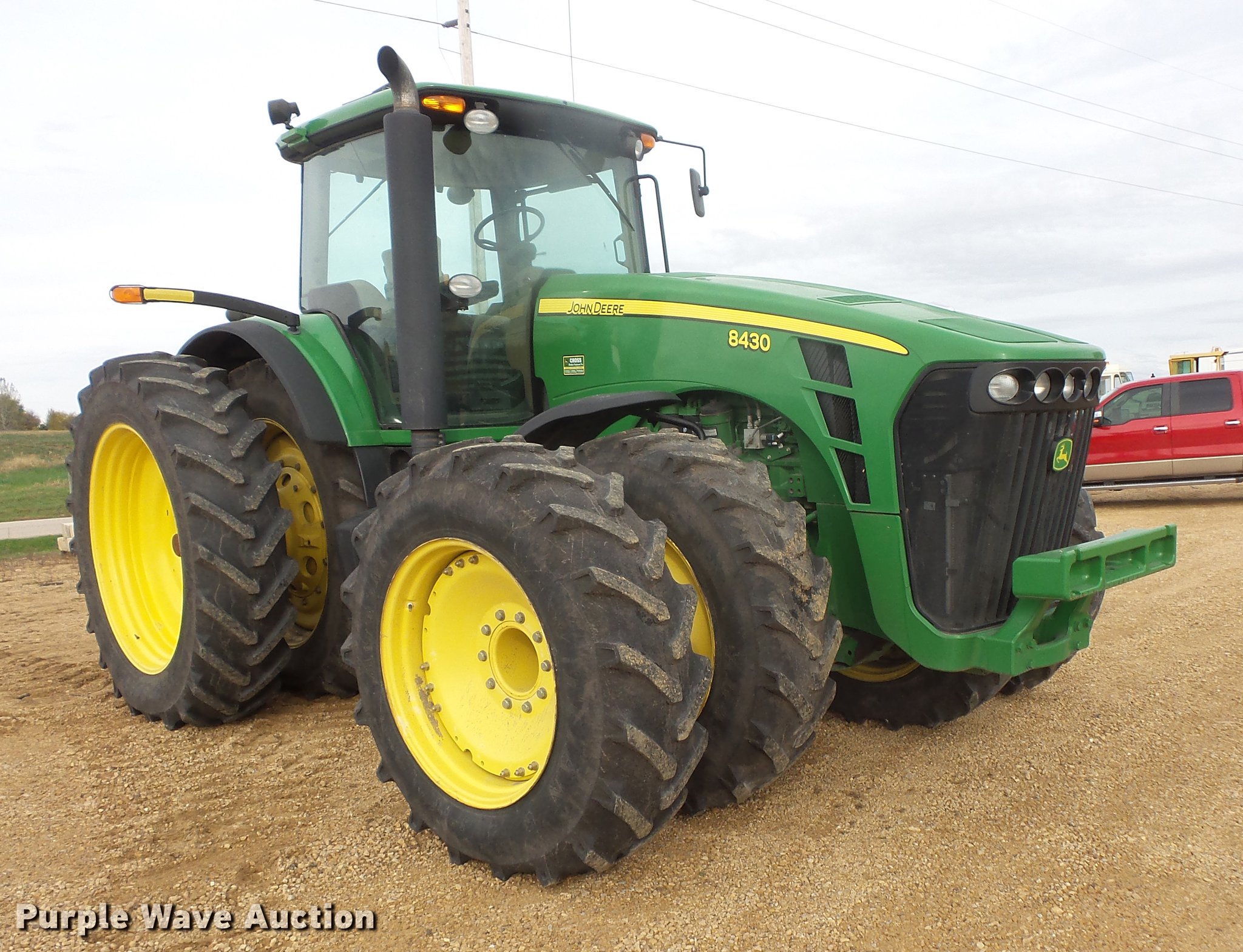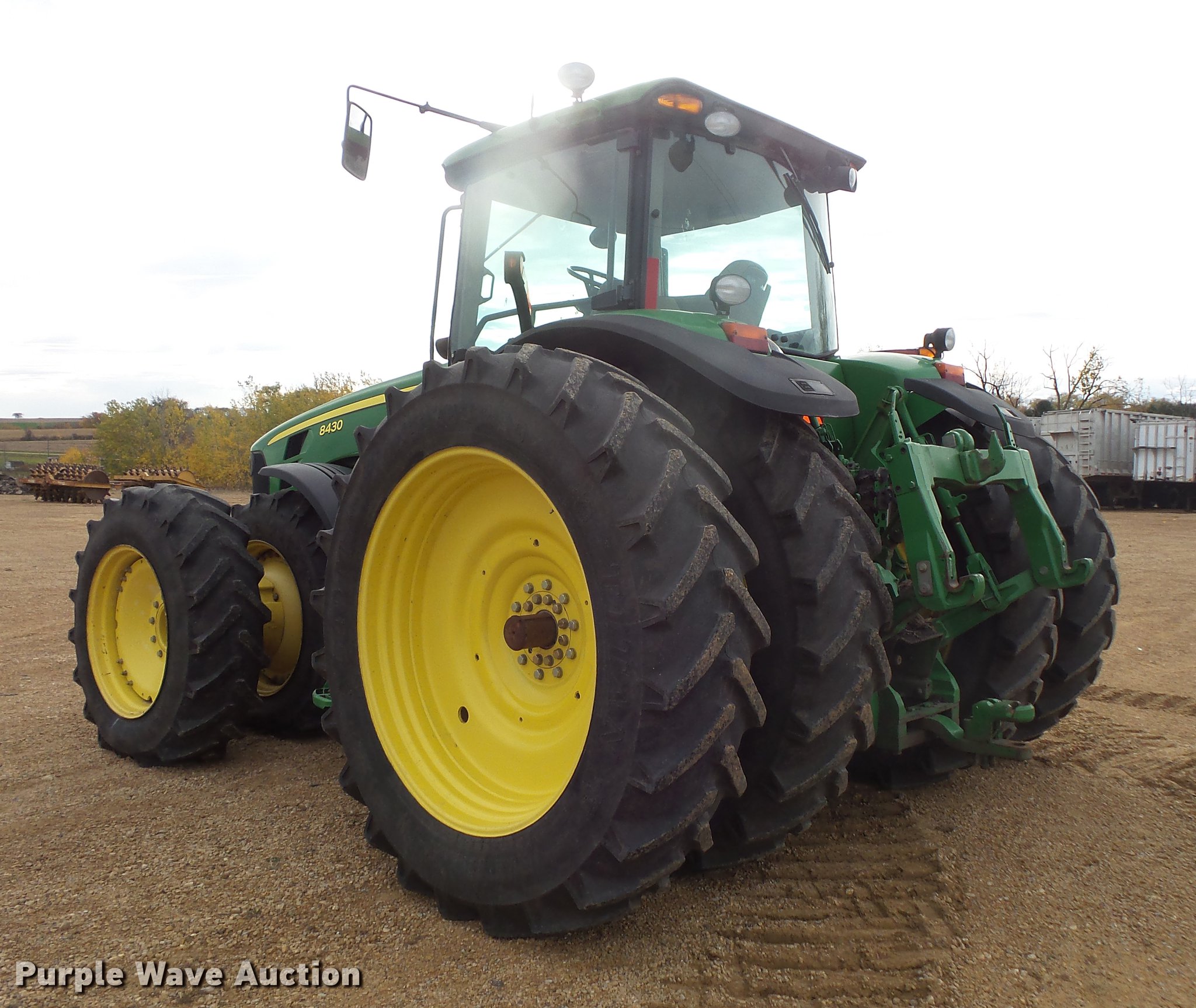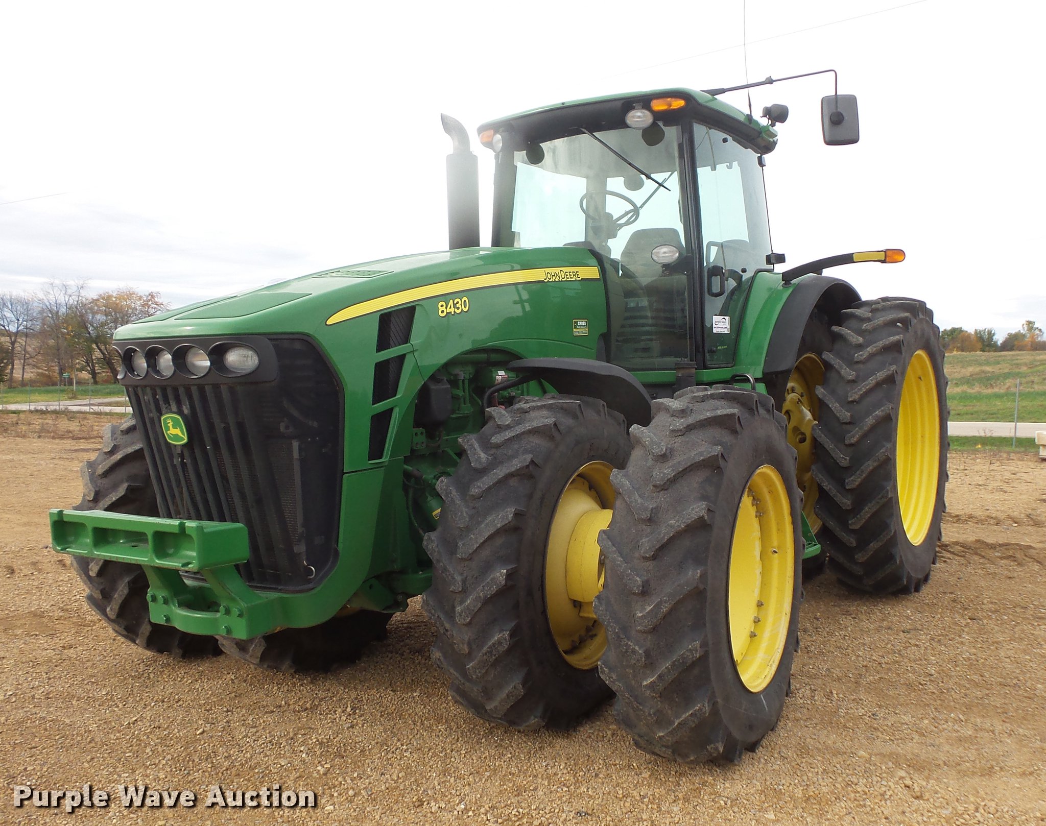 Purple Wave is selling a used Tractor in Wisconsin. This item is a 2008 John Deere 8430 MFWD tractor with the following: 3,442 hours on meter, John Deere 9.0L six cylinder turbo diesel engine, Serial RG6090L037558, IVT transmission, AC and heat, Tilt steering wheel, AM/FM, Suspension seat, Instructor's seat, GreenStar ready, Three point, Quick attach, Seven pin outlet, 1000 PTO, (4) rear hydraulic remotes, 420/85R34 dual front tires, 480/80R50 dual rear tires, Rear wheel weights, Serial RW8430D024718