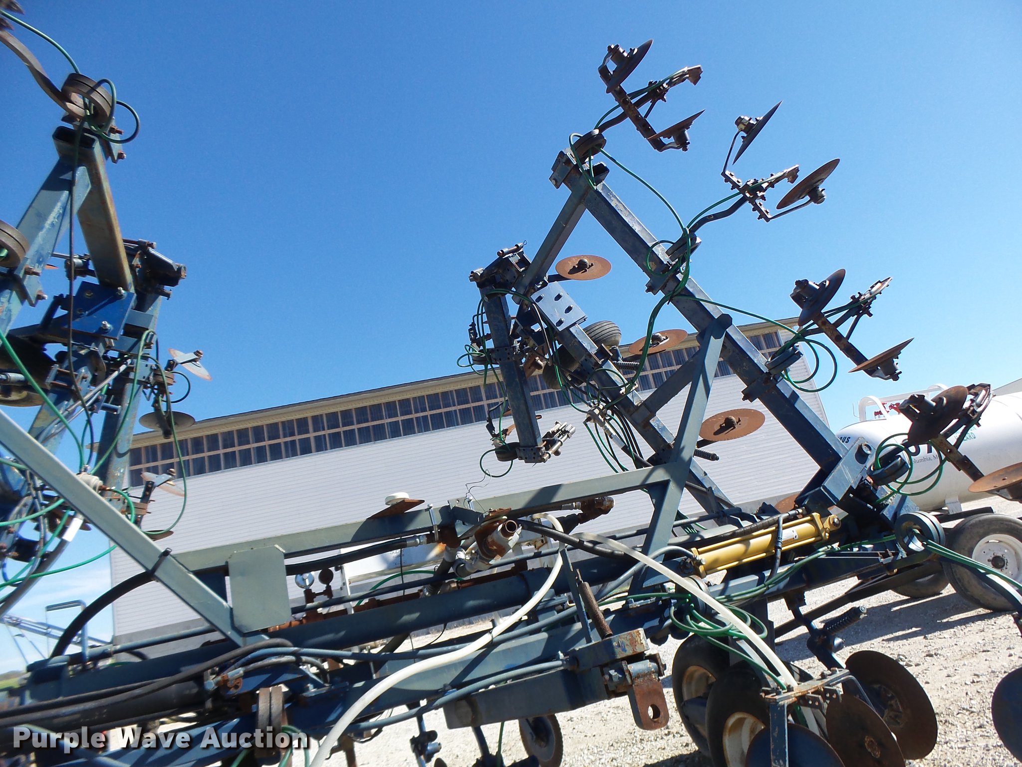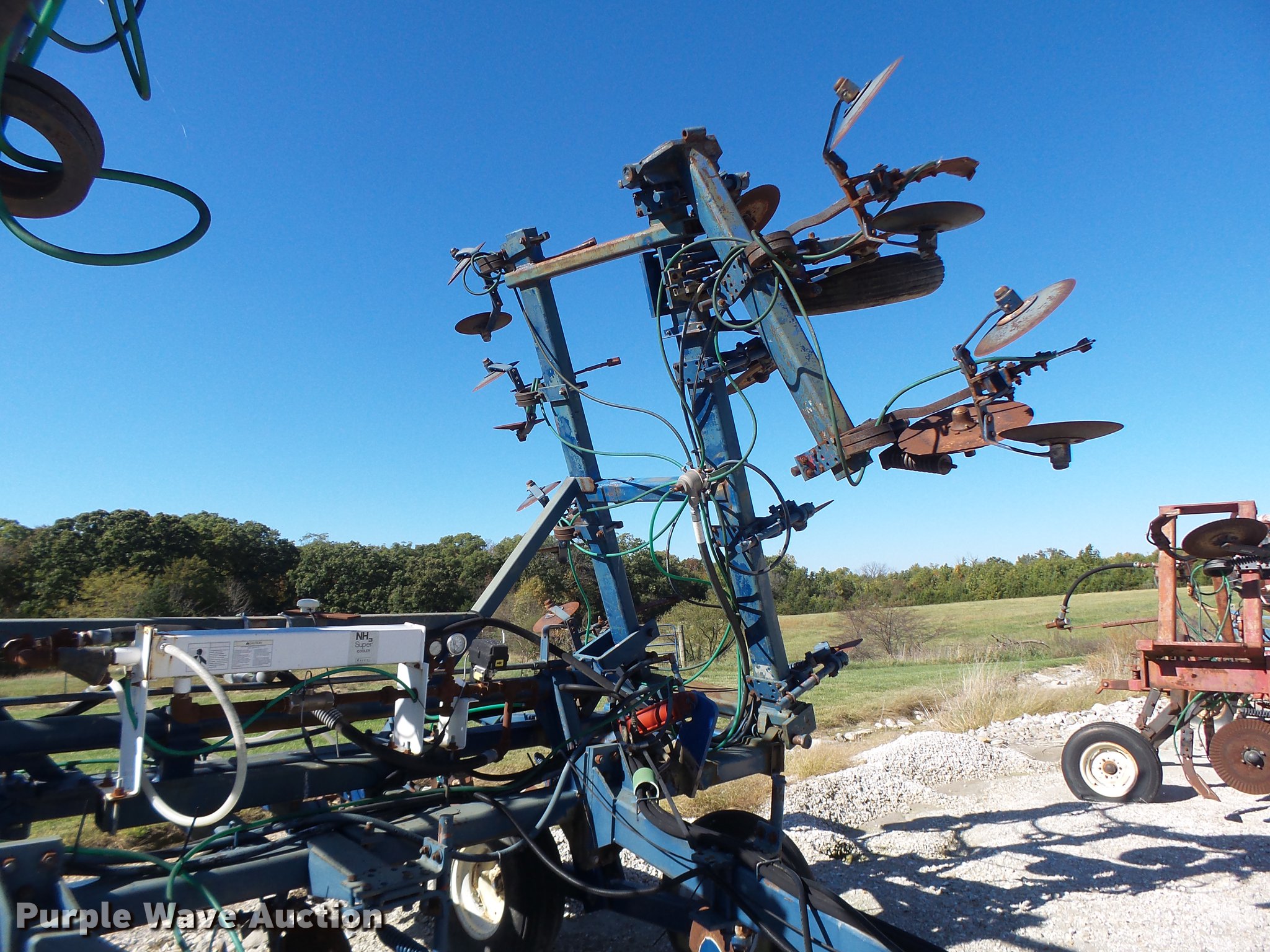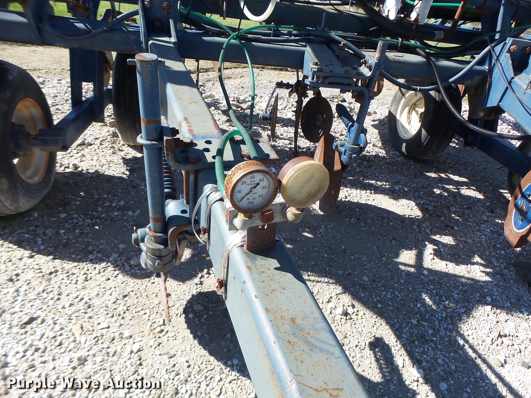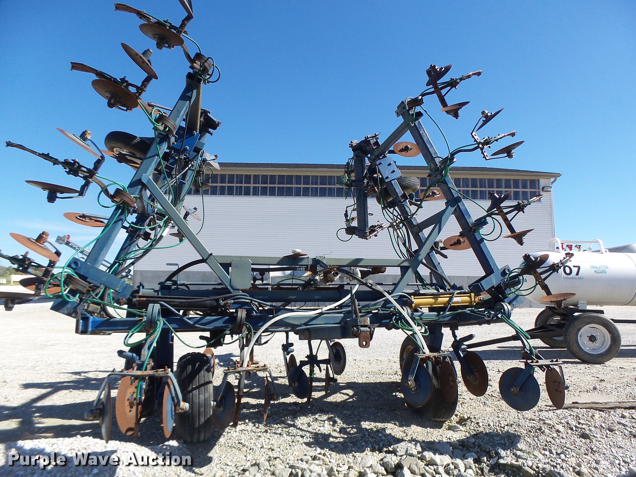 Purple Wave is selling a used Applicator Pull Type in Missouri. This item is a Anhydrous ammonia toolbar with the following: 40'W, 18" diameter front blades, 30" spacing, (17) shanks, 30" spacing, Hydraulic lift and fold, NH3 cooler, Anhydrous hookups, Pin/clevis hitch, 11L-15SL tires