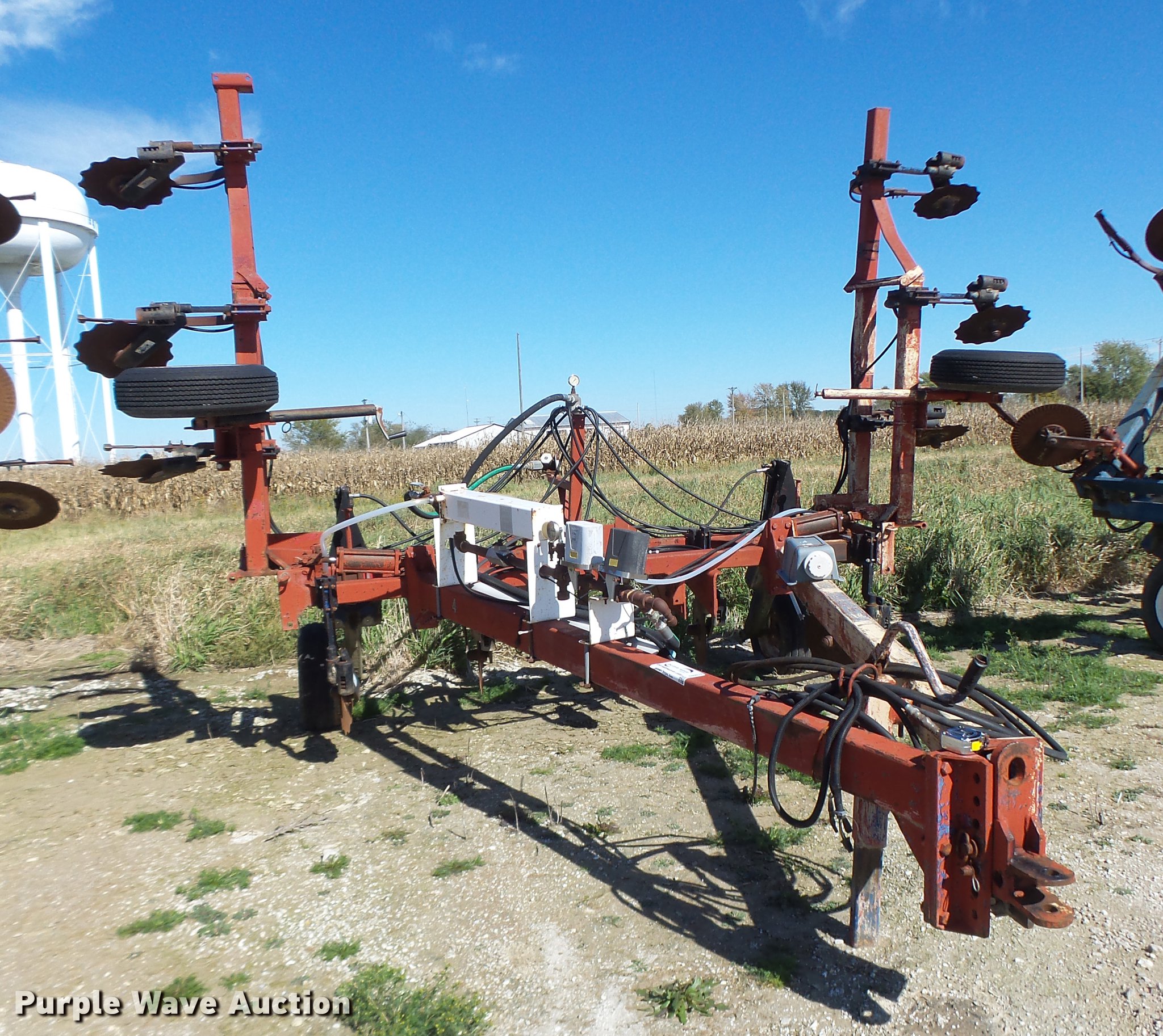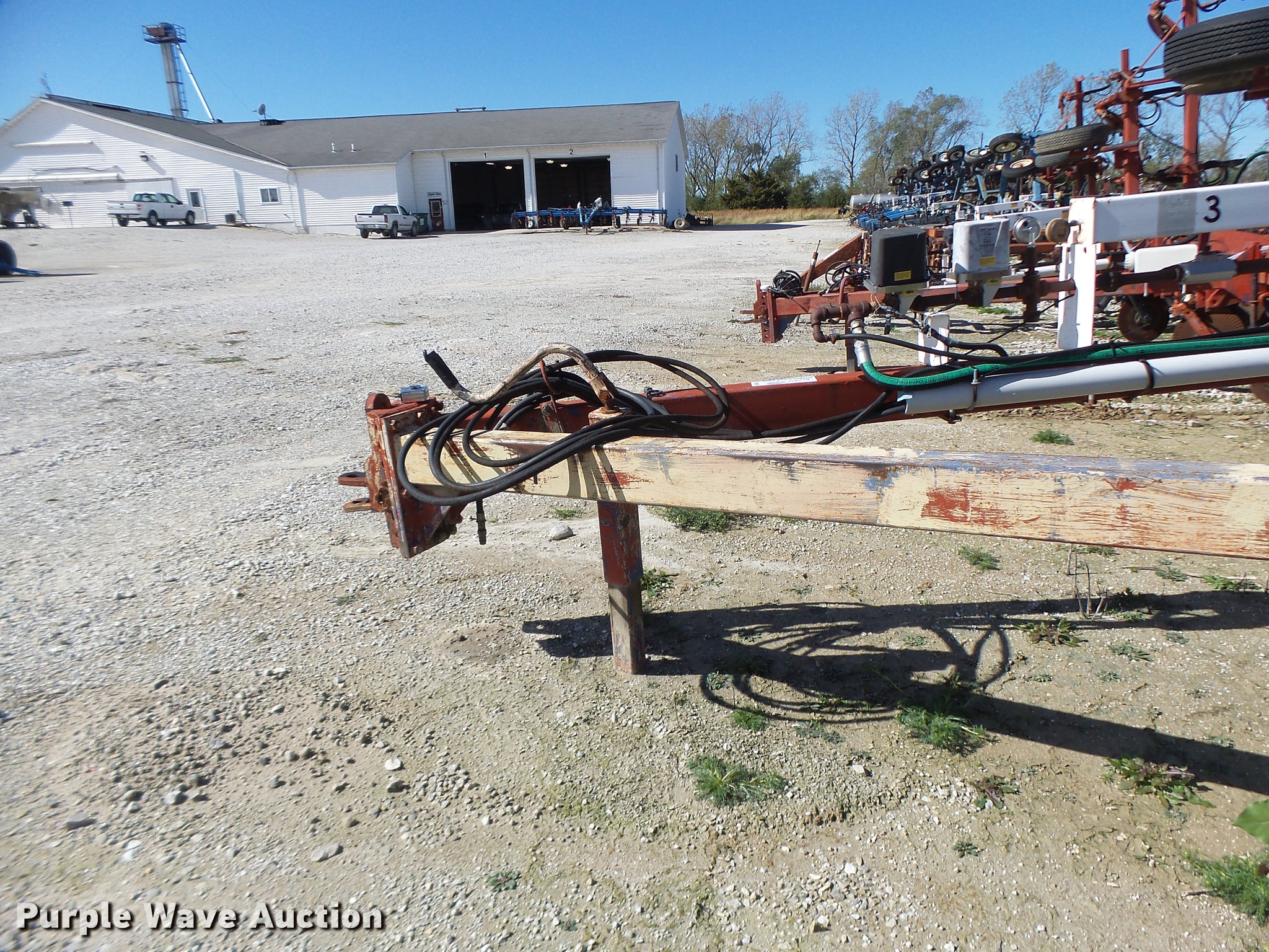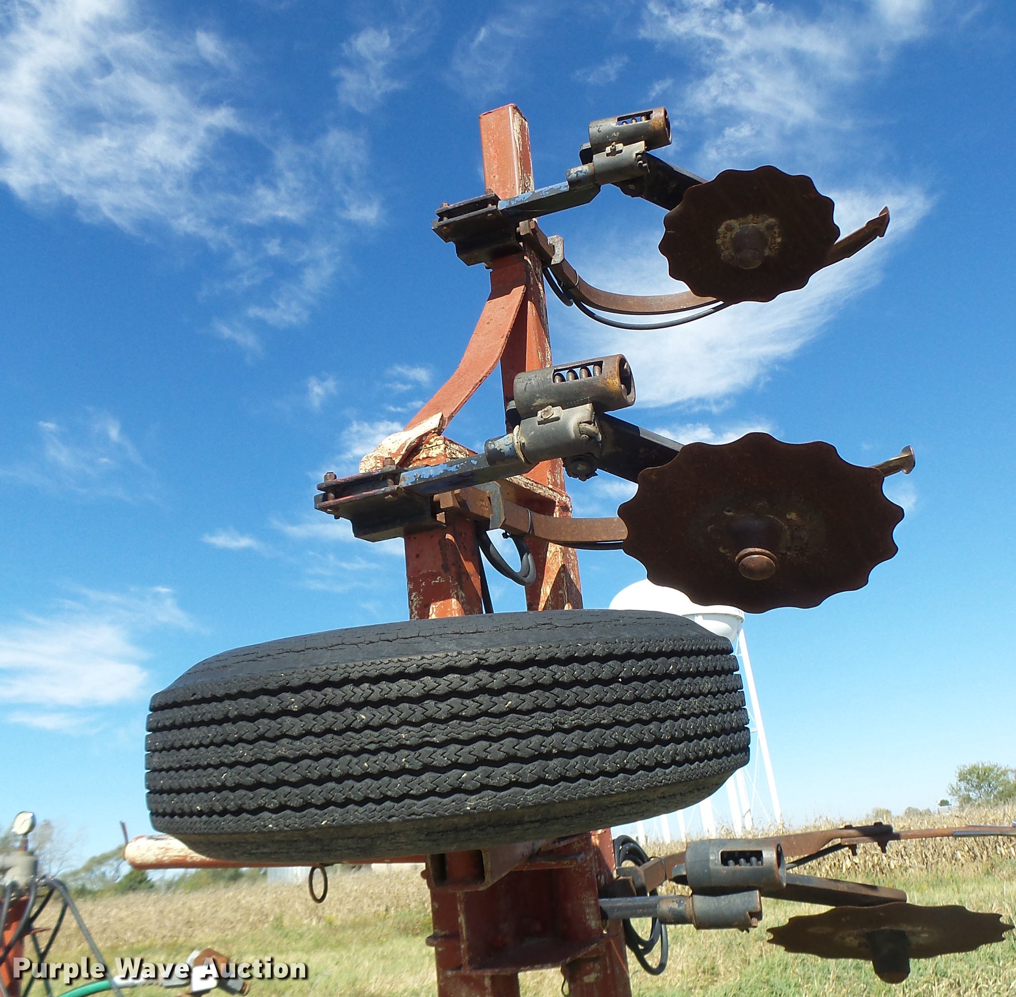 Purple Wave is selling a used Applicator Pull Type in Missouri. This item is a Anhydrous ammonia toolbar with the following: 28'W, 19" diameter front blades, 30" spacing, (11) shanks, 30" spacing, Hydraulic lift and fold, Raven NH3 cooler, Anhydrous hookups, Pin/clevis hitch, 9.50-15 tires, Unit# 4