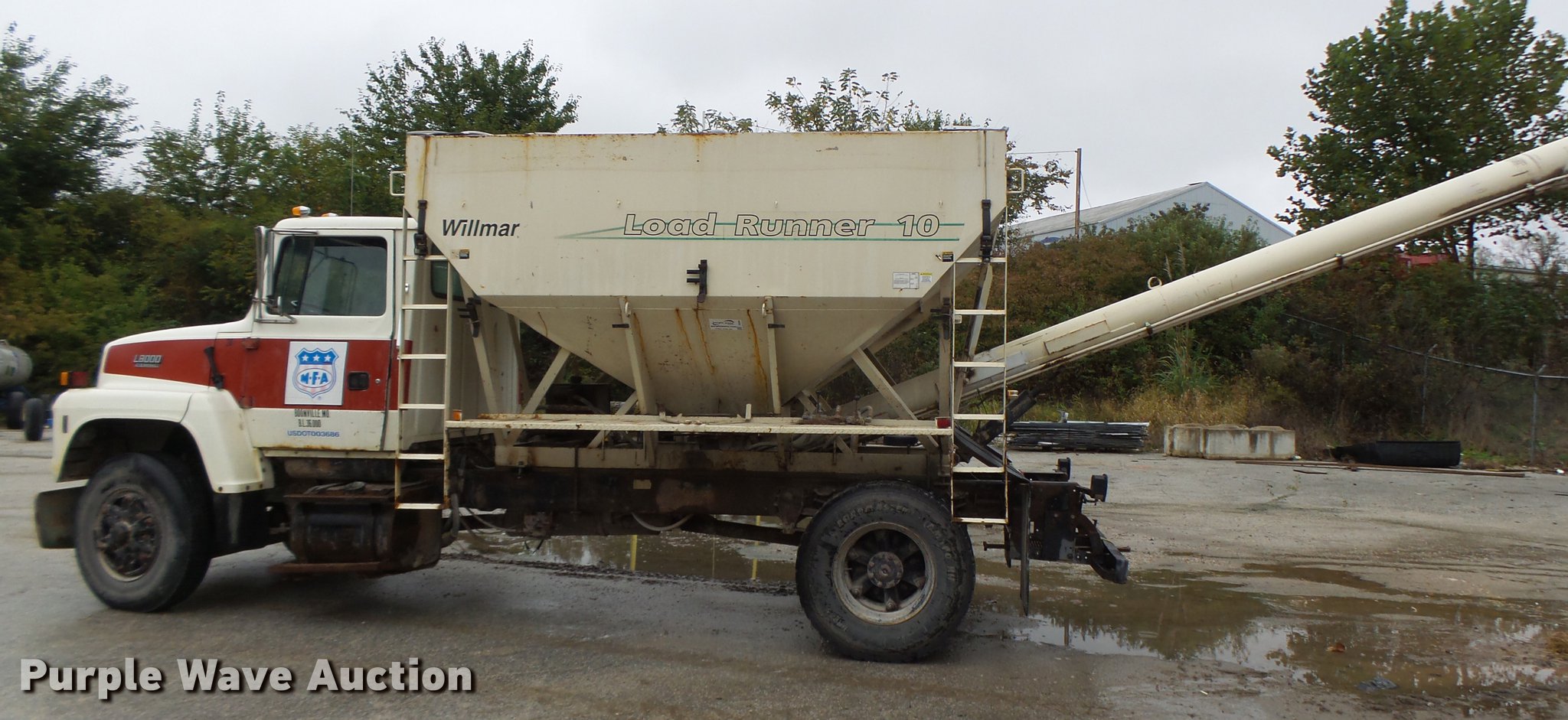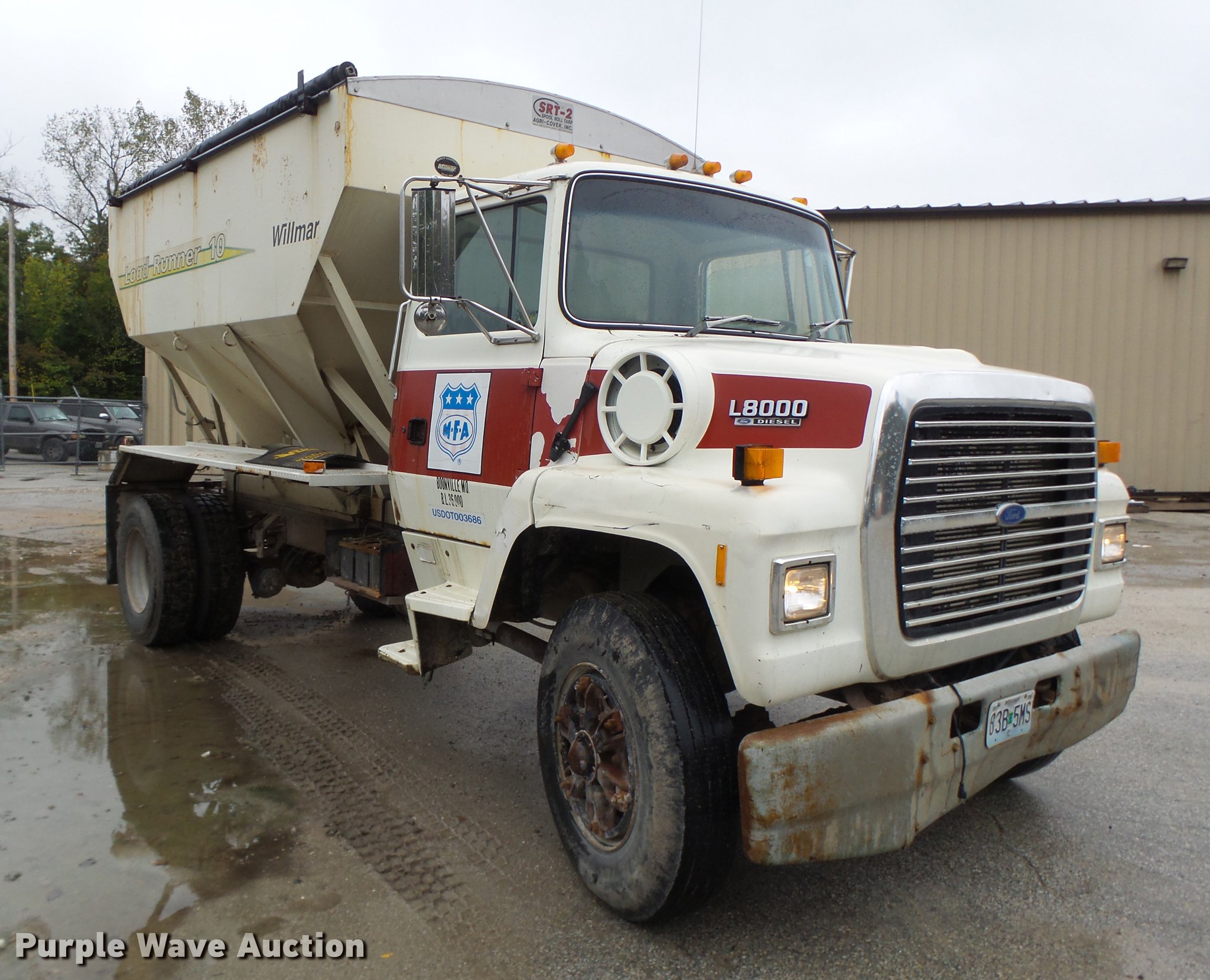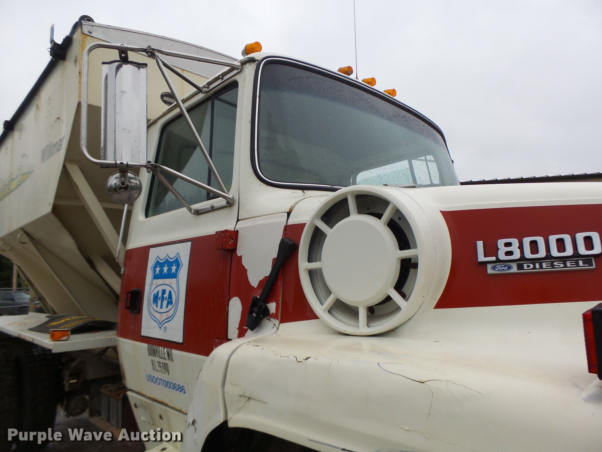 Purple Wave is selling a used Fertilizer or Feed Delivery Truck in Missouri. This item is a 1993 Ford L8000 fertilizer tender truck with the following: 177,726 miles on odometer, 7.8L L6 turbo diesel engine, Six speed manual transmission, Heat, AM/FM, Air suspension seat, PTO, Willmar Load Runner 10 tender bed, 340 cu.ft. struck capacity, Tarp, Single fuel tank, Spring suspension, Air brakes, 11R22.5 tires