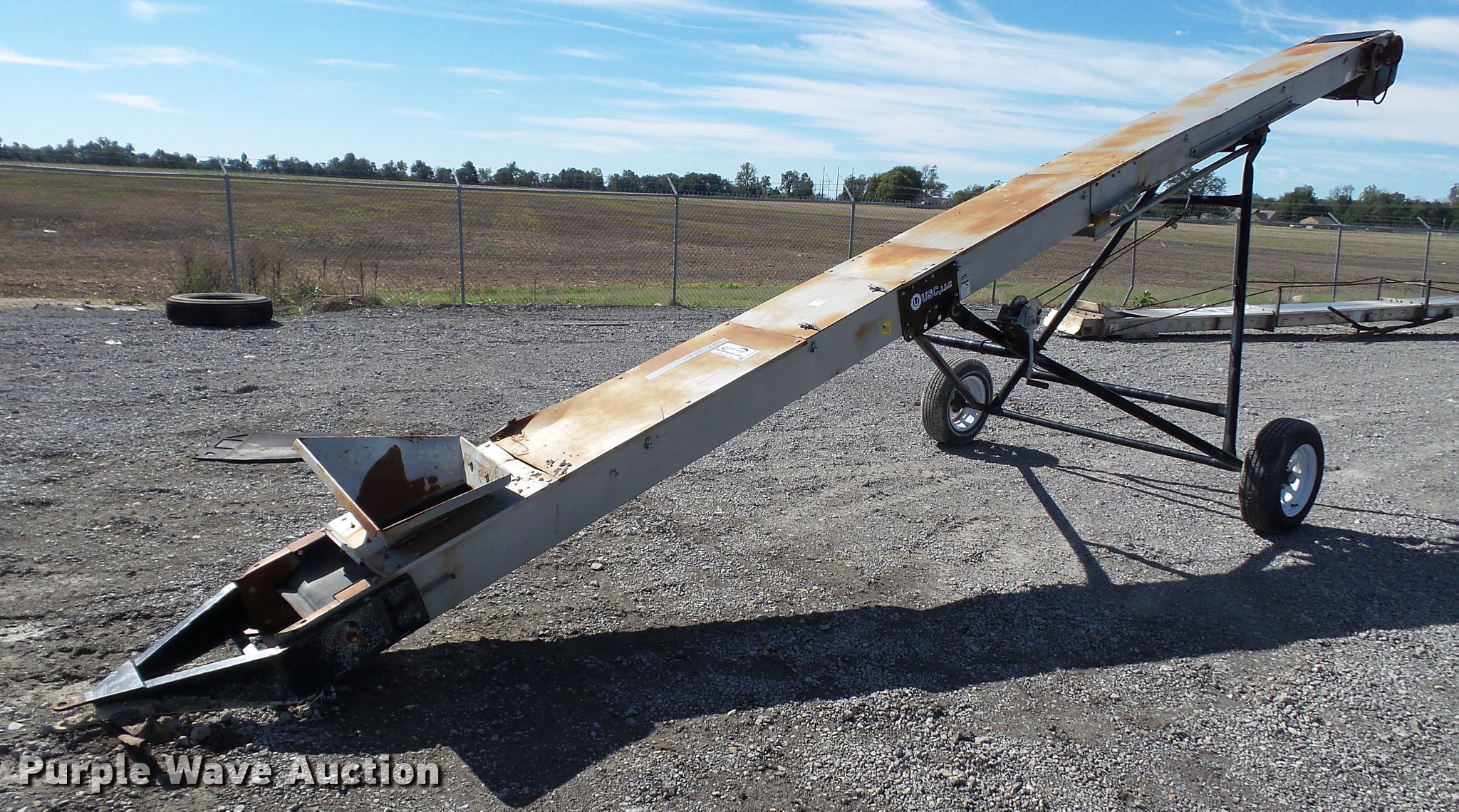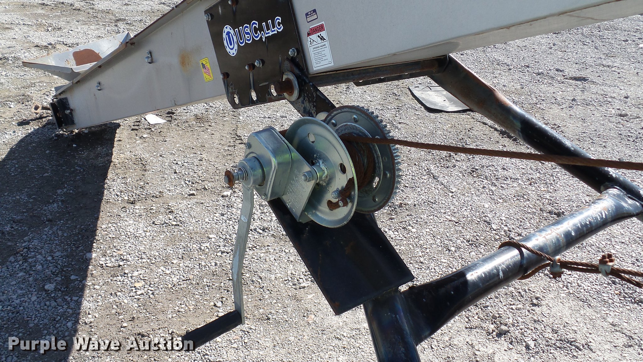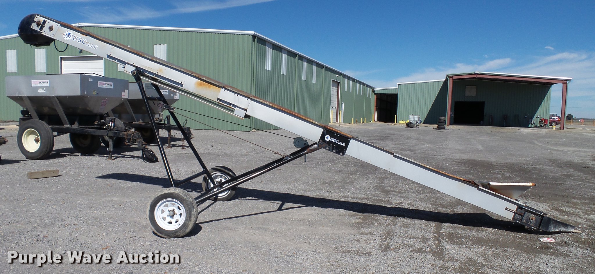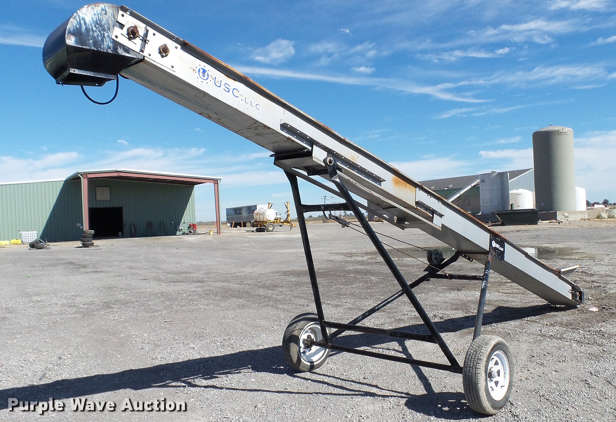 Purple Wave is selling a used Auger or Conveyor in Arkansas. This item is a USC stainless steel conveyor with the following: 25'L x 16"W belt, Manual height adjust, Pin hitch, 185/75R14 tires, Unit may be bent, No motor, Unknown operating condition, Serial 03747, Unit# 100625
