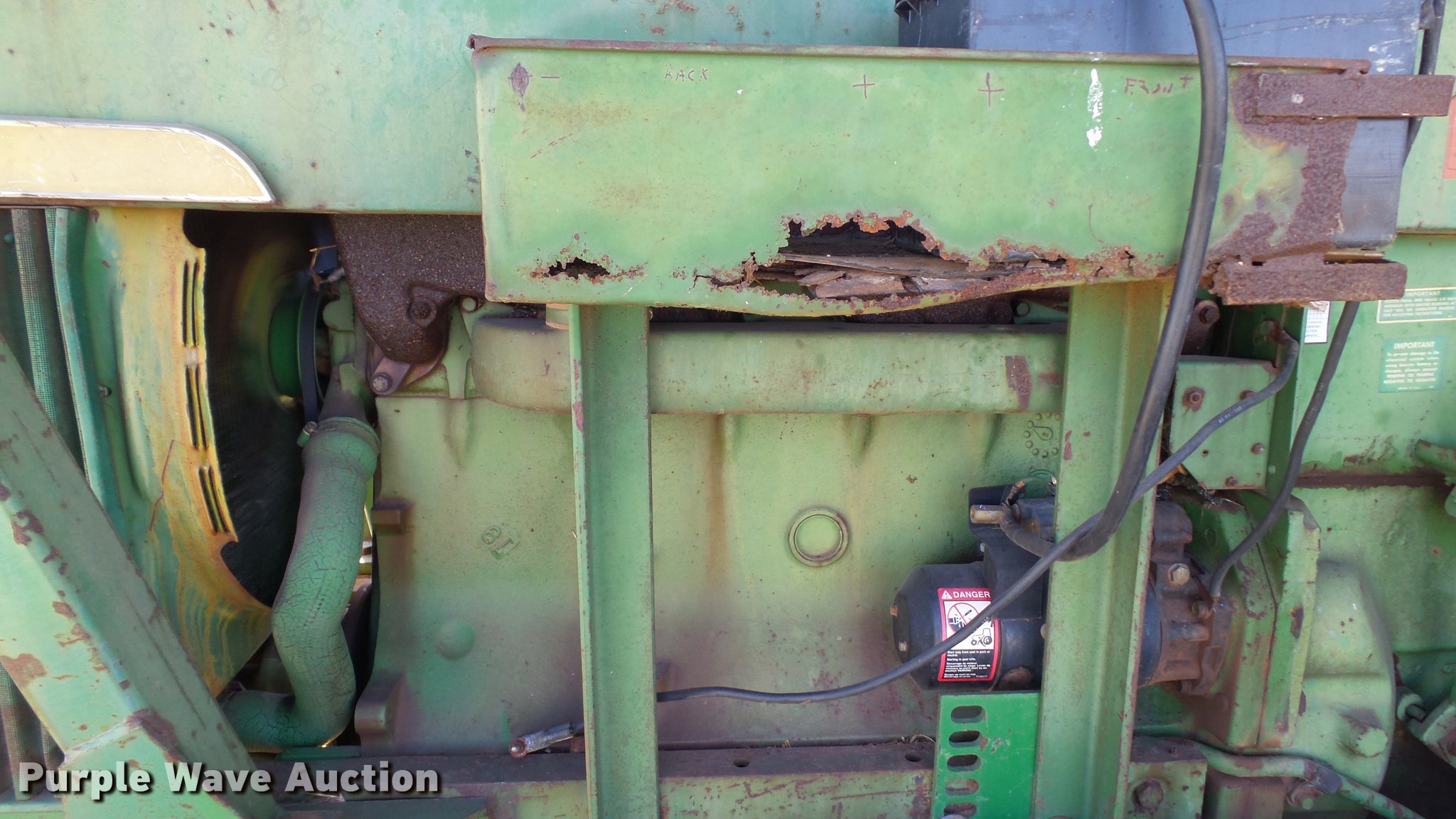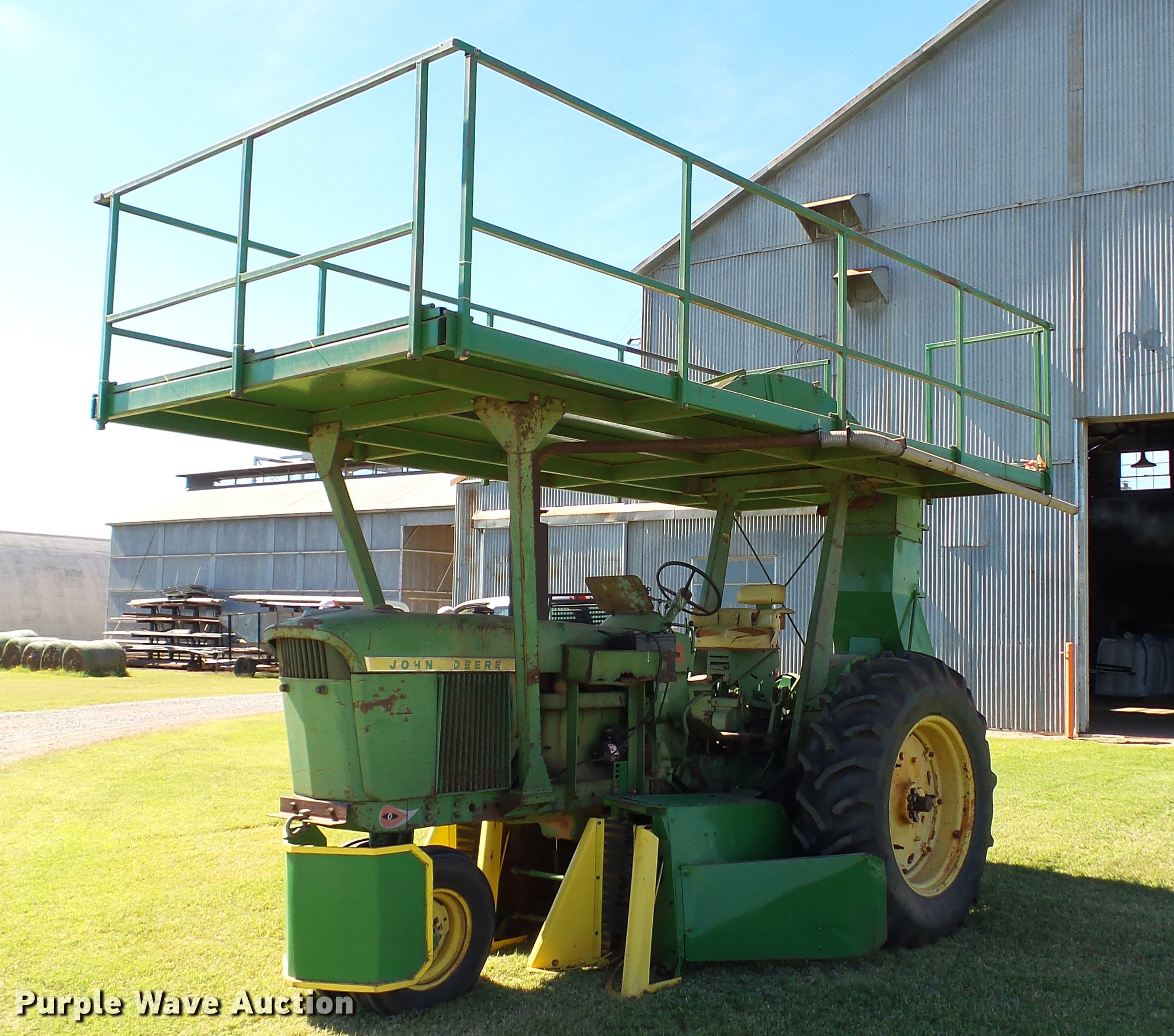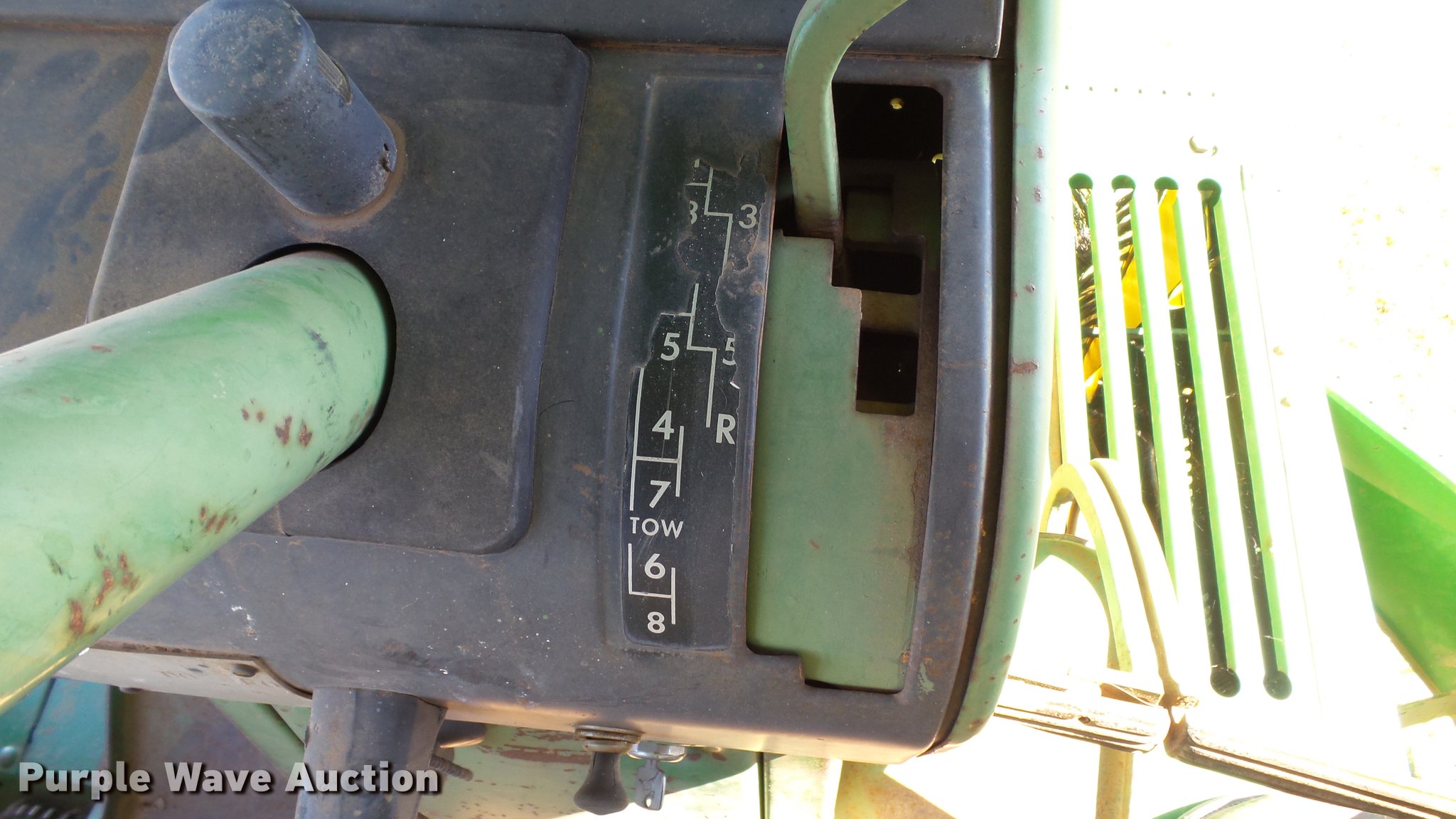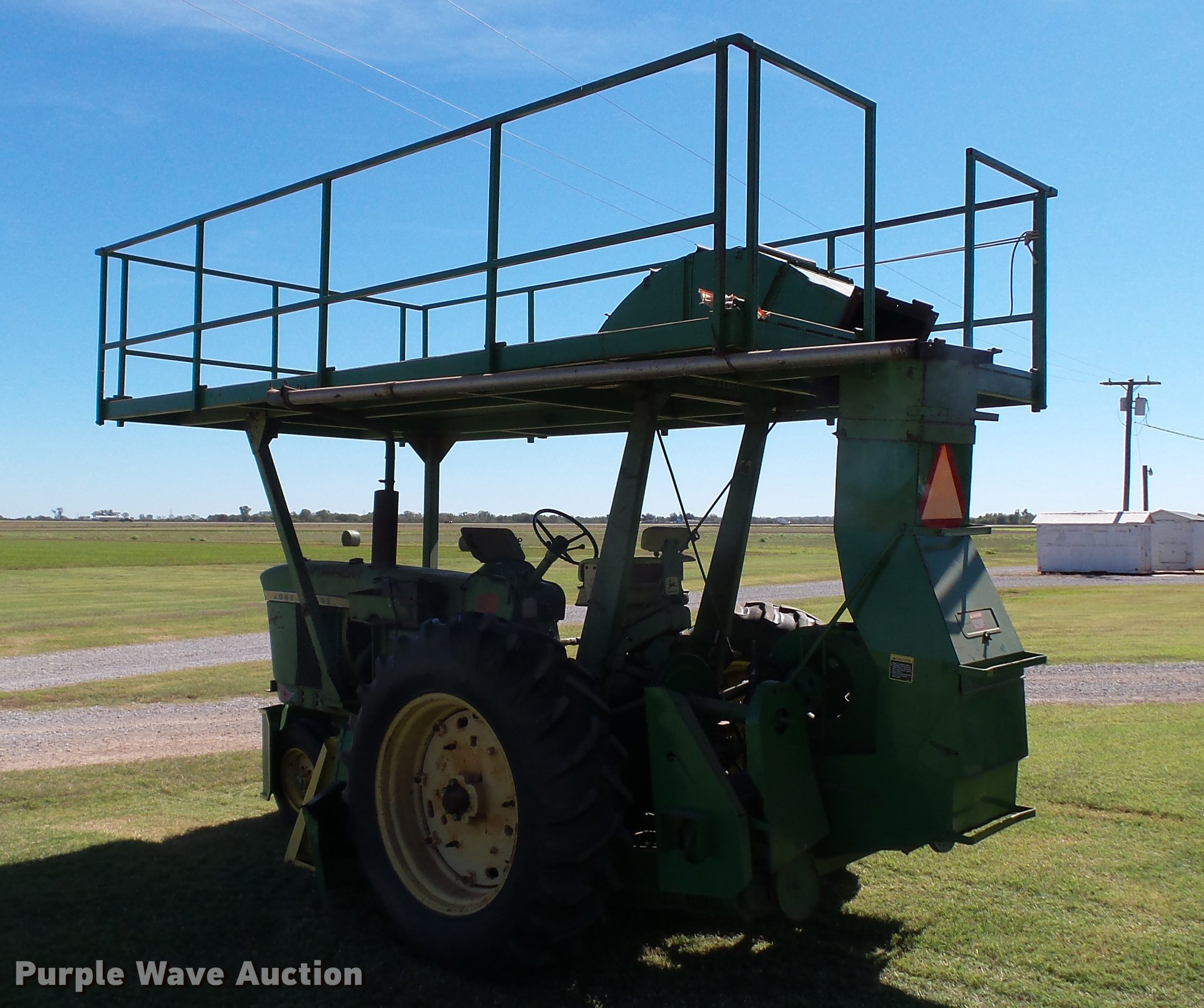 Purple Wave is selling a used Tractor in Oklahoma. This item is a 1972 John Deere 4000 tractor with the following: 2,617 hours on meter, John Deere 6404DR-01 six cylinder diesel engine, Serial 318233, Synchro transmission, 8F-2R gears, John Deere E0283 cotton harvester, 40" row spacing, 7" head opening, Additional pulleys, Hydraulic head level control, Dual augers on each side, Serial 002349, 188"L x 8'W top platform, Fold down railing, Three point, 1000 PTO, (2) rear hydraulic remote sets, (2) wheel weights, 7.5L-15 dual front tires, 16.0-34 rear tires, Right rear tire leaks air, Weak battery, Sale# 1816-KP, Serial 263774R, Unit# 097832