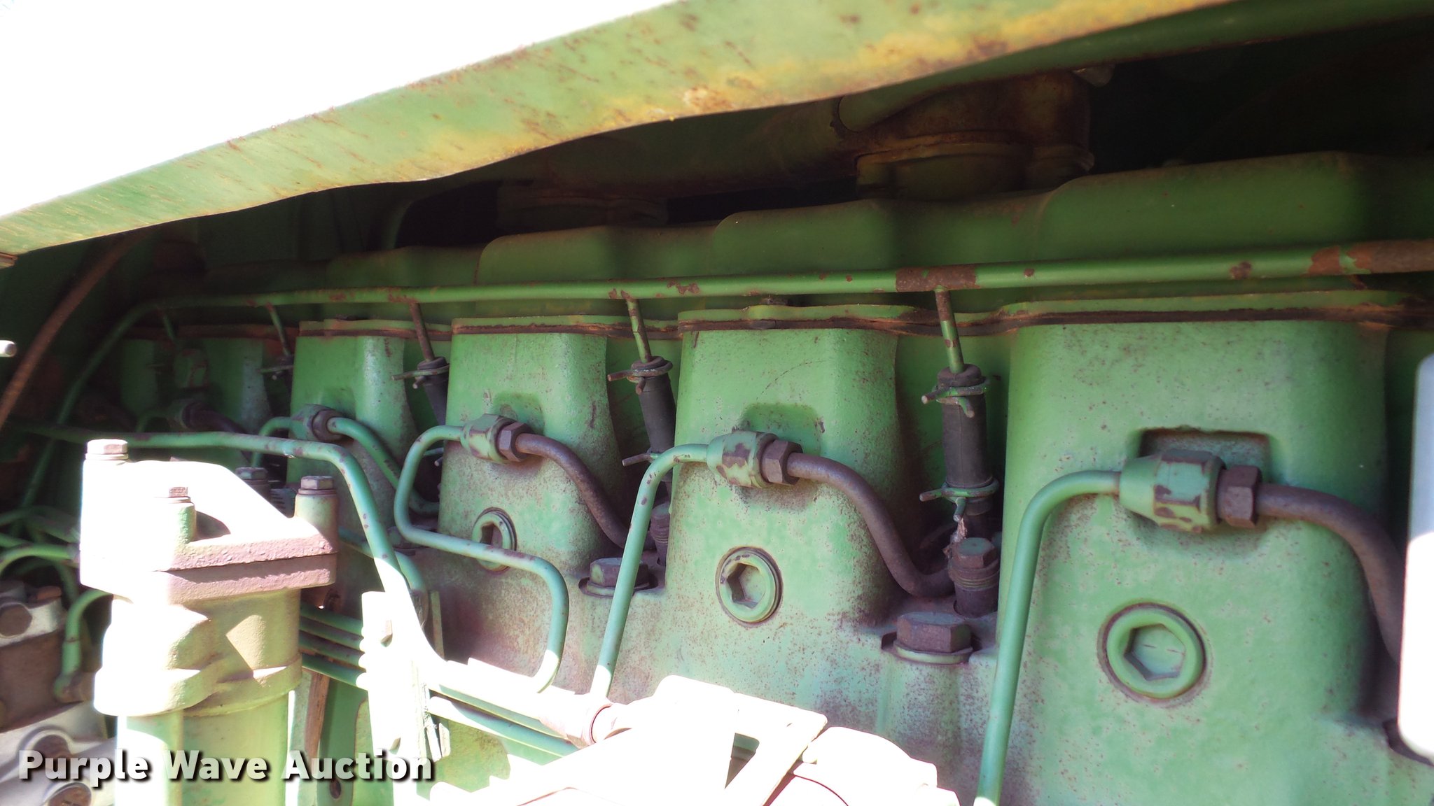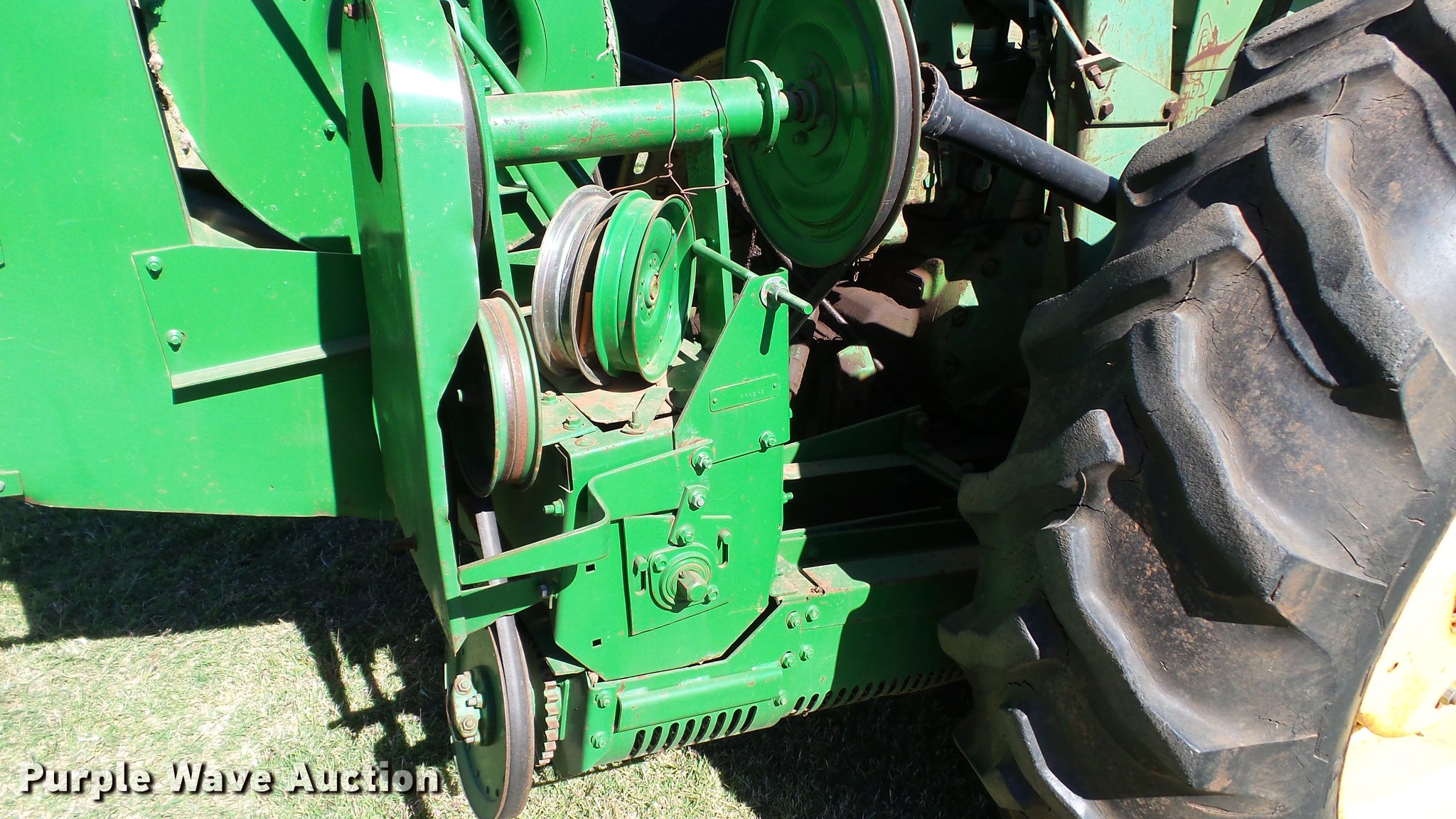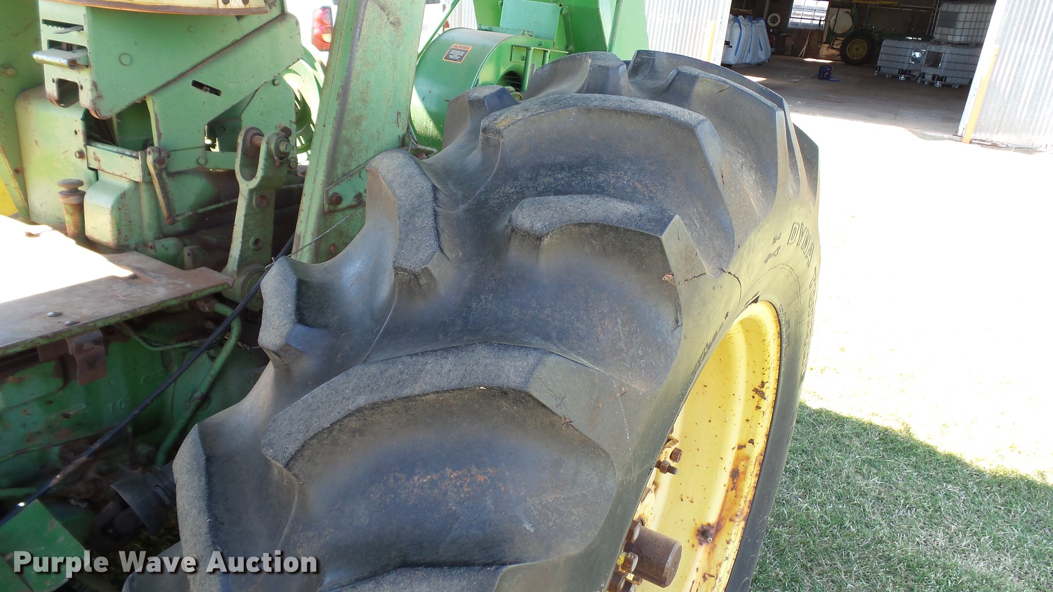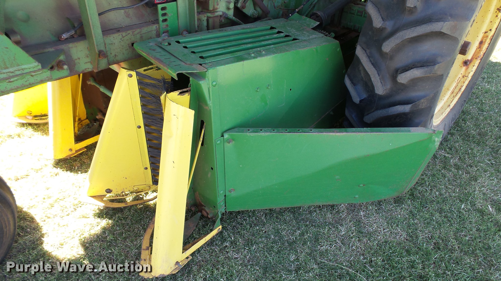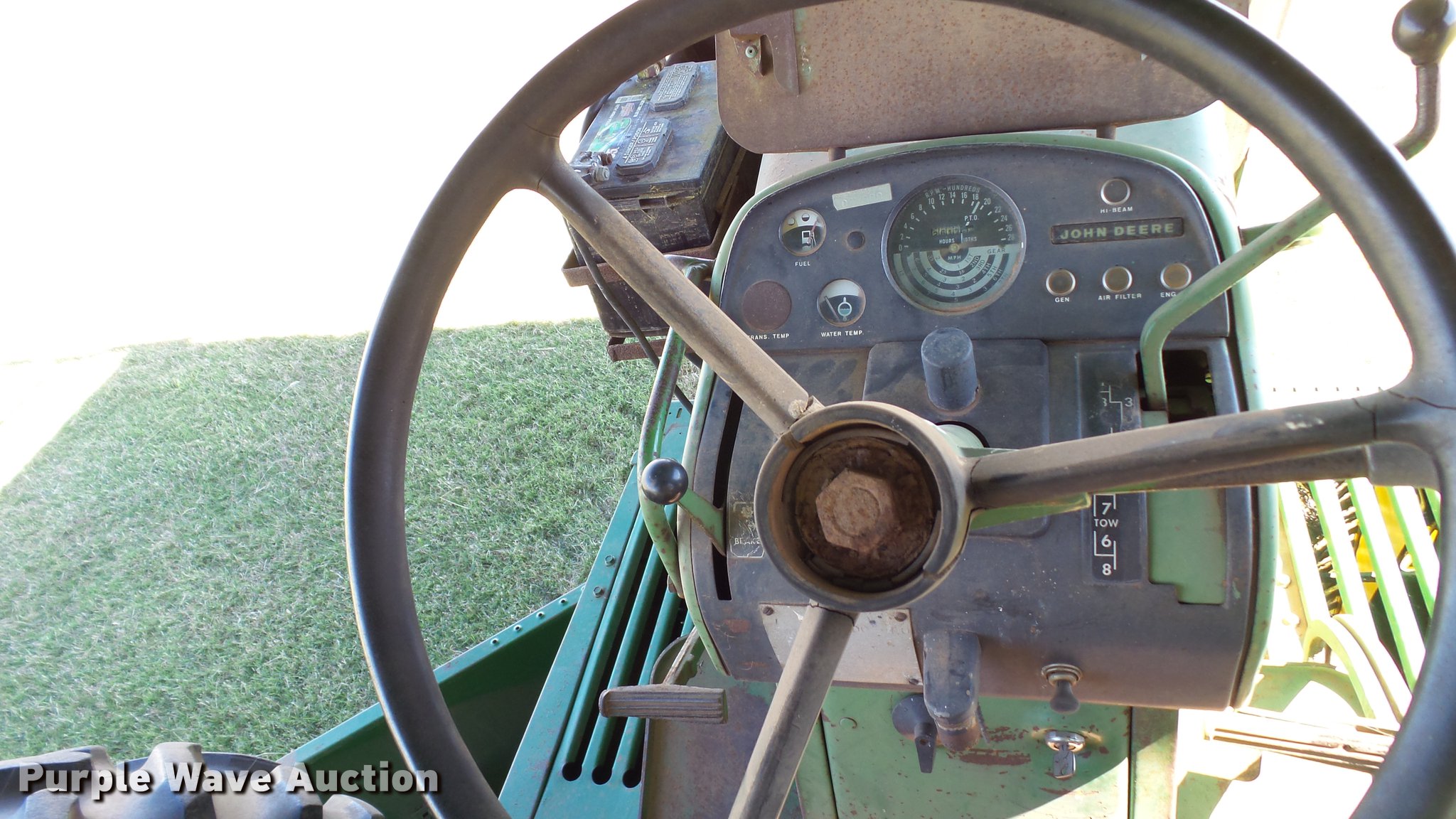 Purple Wave is selling a used Tractor in Oklahoma. This item is a 1972 John Deere 4000 tractor with the following: 2,617 hours on meter, John Deere 6404DR-01 six cylinder diesel engine, Serial 318233, Synchro transmission, 8F-2R gears, John Deere E0283 cotton harvester, 40" row spacing, 7" head opening, Additional pulleys, Hydraulic head level control, Dual augers on each side, Serial 002349, 188"L x 8'W top platform, Fold down railing, Three point, 1000 PTO, (2) rear hydraulic remote sets, (2) wheel weights, 7.5L-15 dual front tires, 16.0-34 rear tires, Right rear tire leaks air, Weak battery, Sale# 1816-KP, Serial 263774R, Unit# 097832