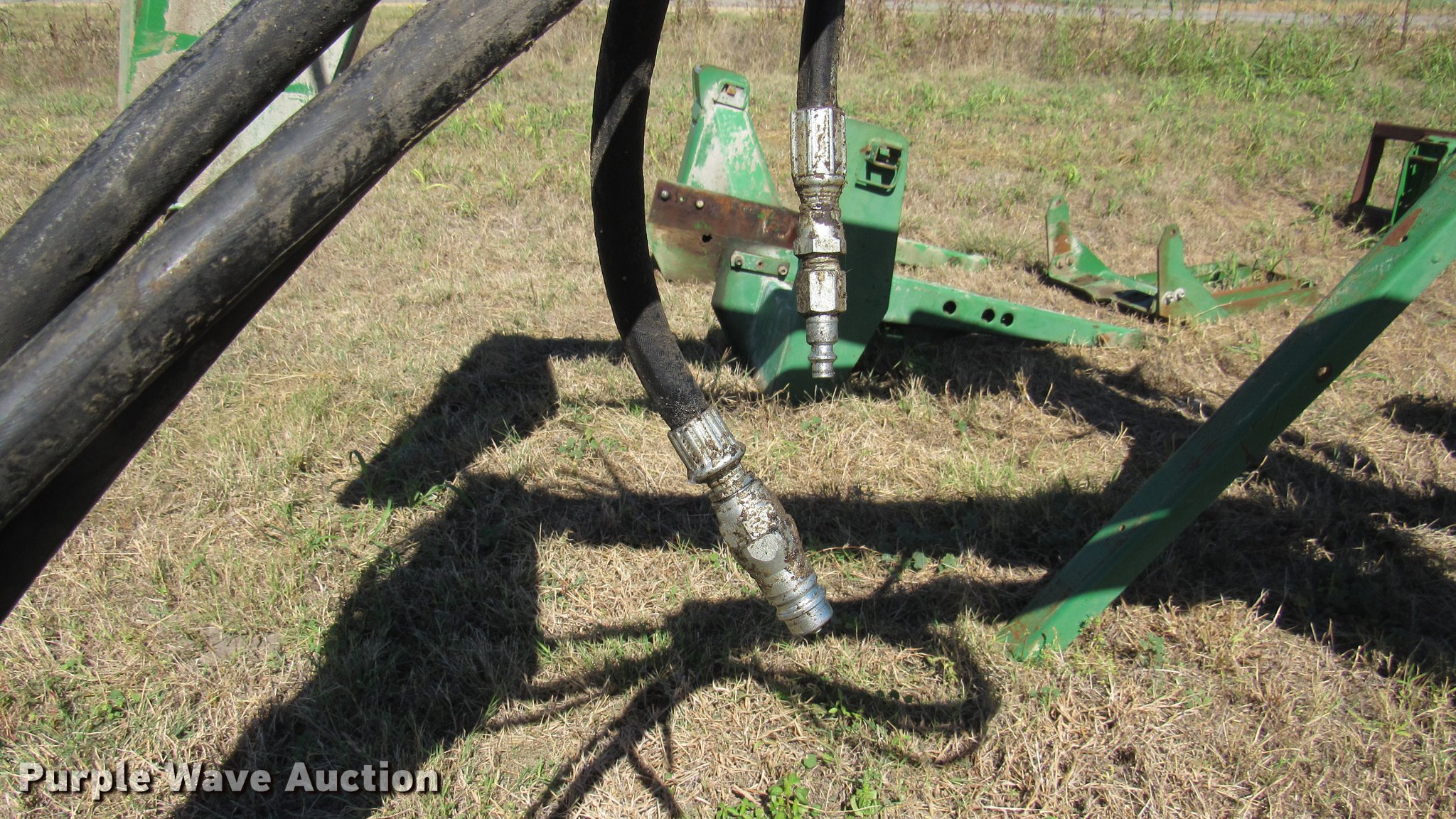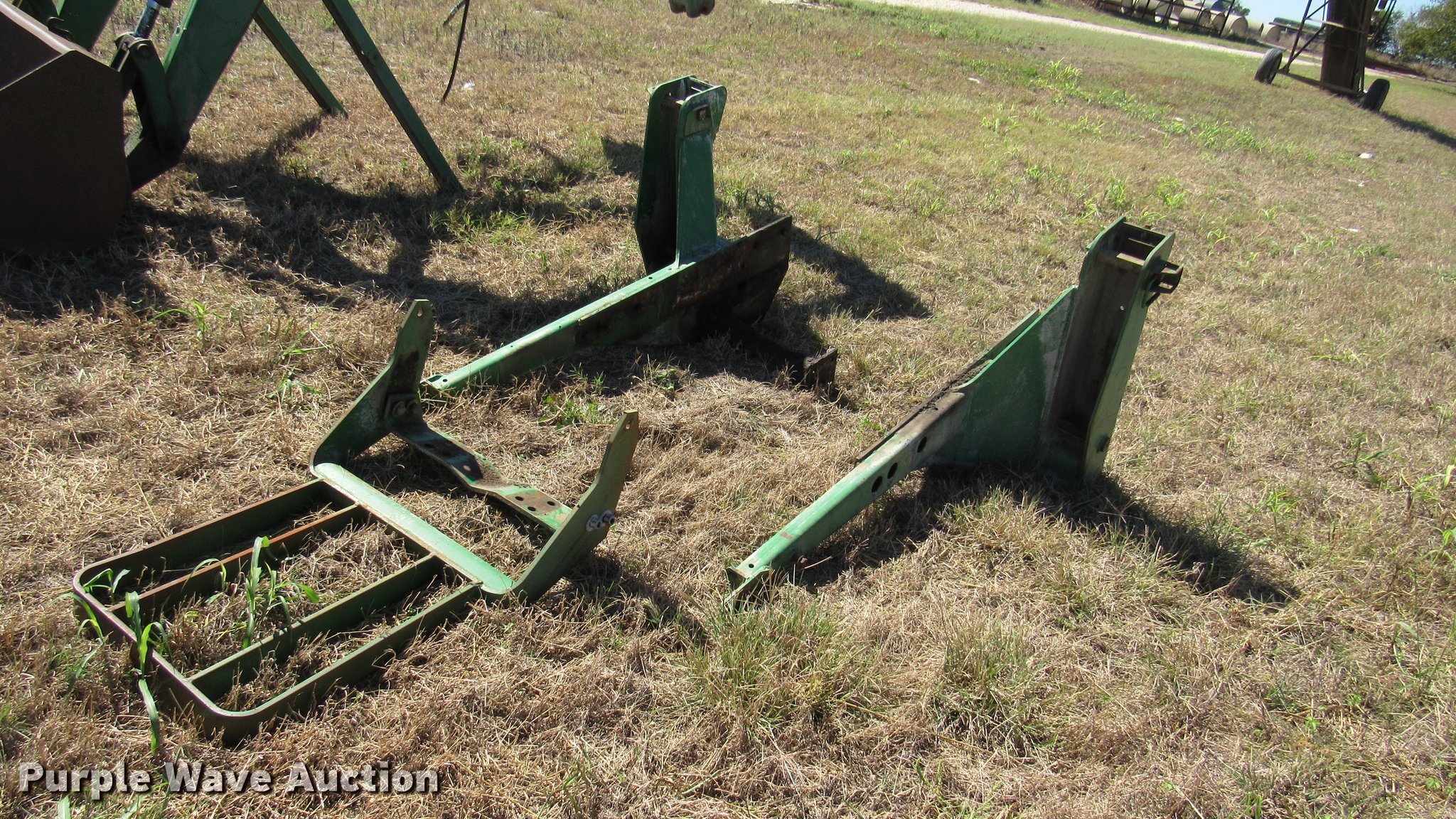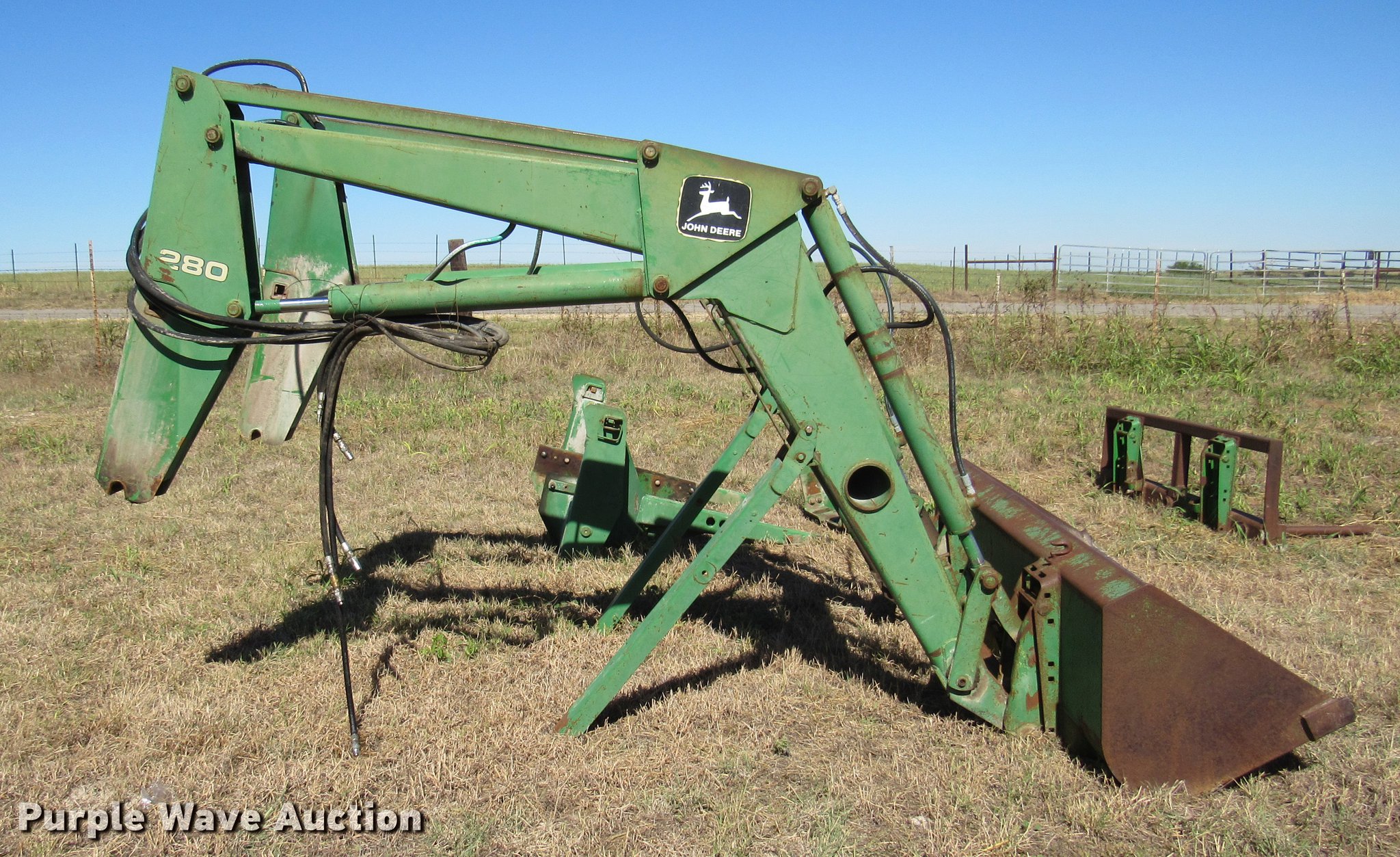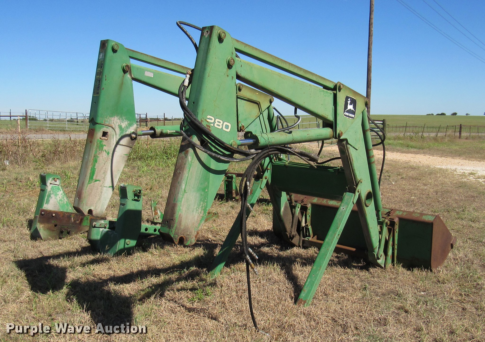 Purple Wave is selling a used Ag Tractor Loader or Attach. in Texas. This item is a John Deere 280 loader with the following: 84.5"W bucket, Weld-on cutting edge, Bale forks, 82"W, (3) 27"L tines, Frame parts, Fits John Deere 4440 tractors