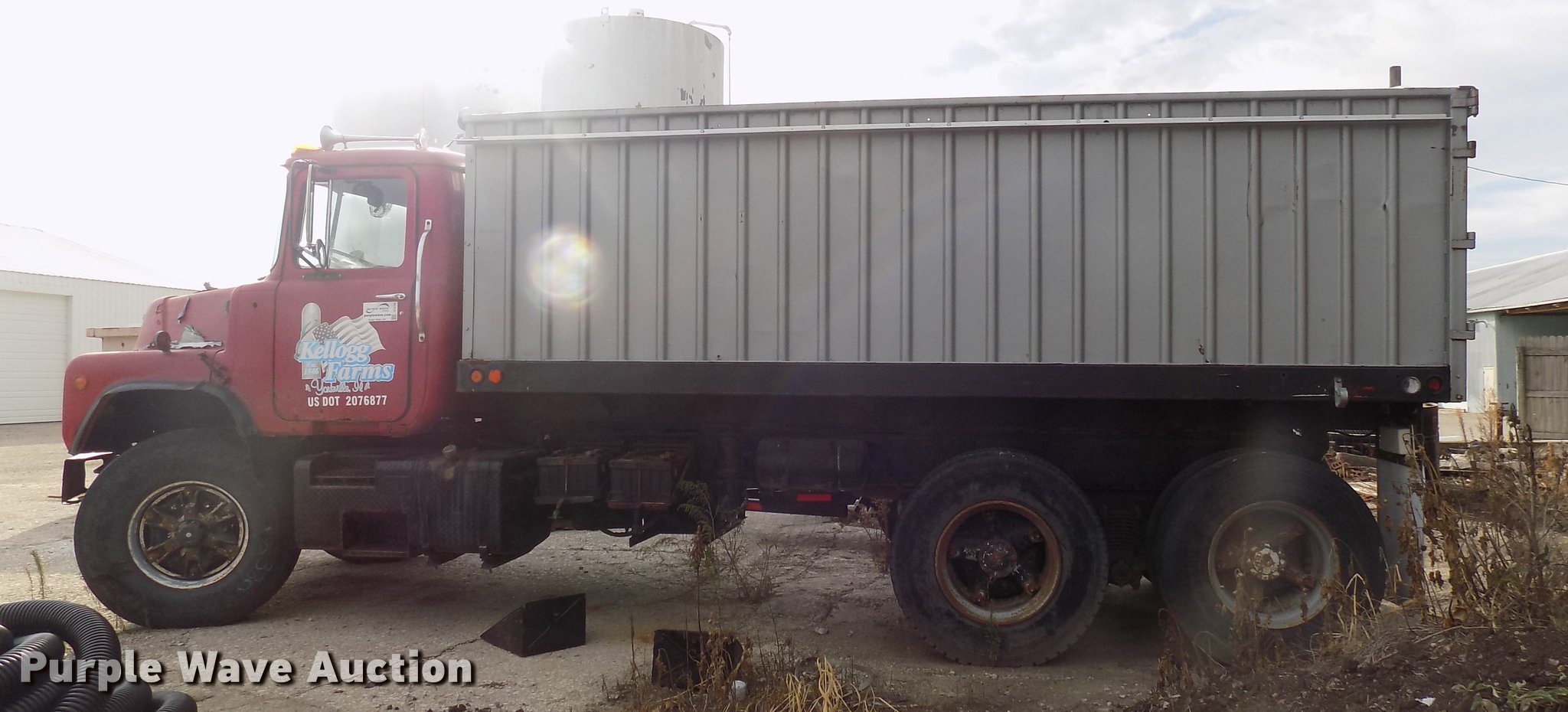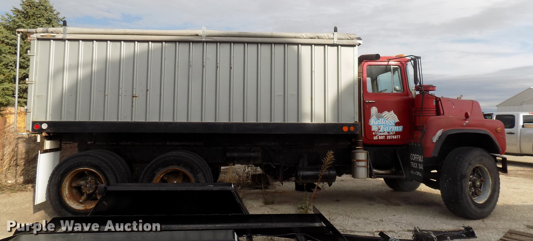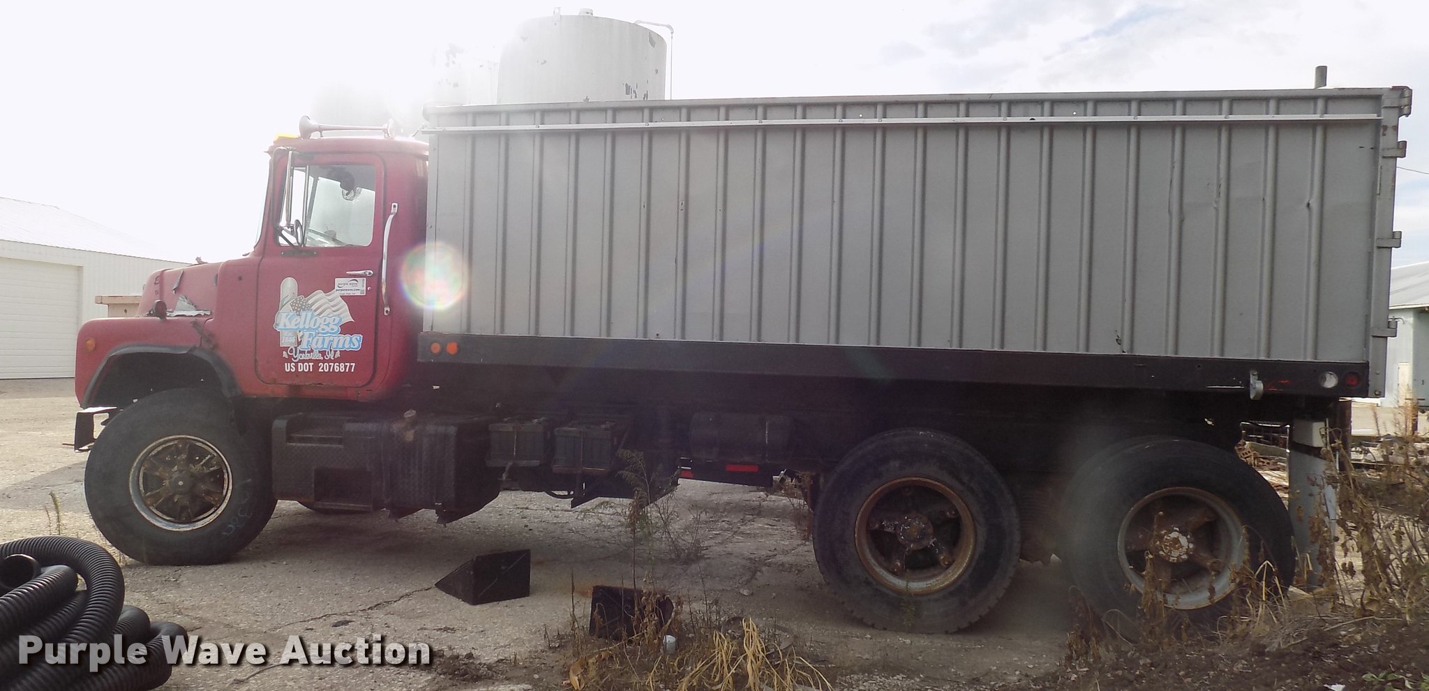Purple Wave is selling a used Grain Truck in Illinois. This item is a 1982 Mack 685S grain truck with the following: 663,668 miles on odometer, Mack six cylinder diesel engine, Five speed manual transmission, Two speed rear end, Tandem axle, Heat, 10'L x 96"W aluminum grain bed, 72" side height, Single fuel tank, Camelback suspension, Air brakes, 172" wheelbase, 425/65R22.5 tires