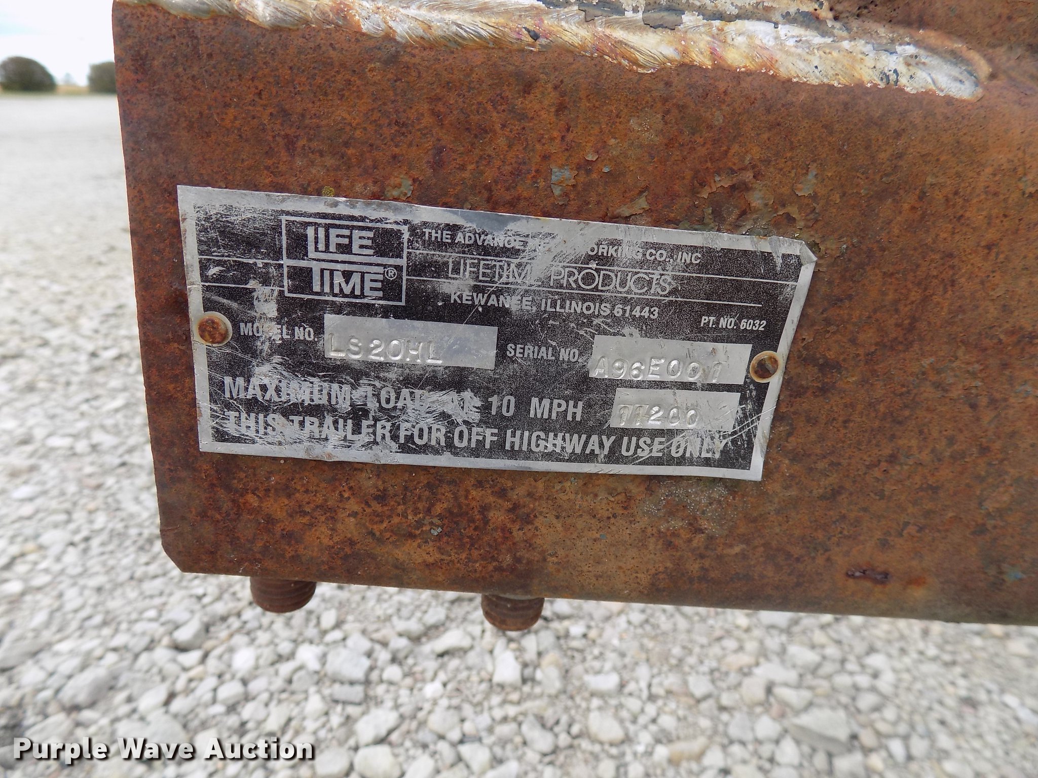 Purple Wave is selling a used Livestock Trailer in Illinois. This item is a Lifetime Trailer Products swine trailer with the following: Model LS20HL, 26'L x 6'W overall, 20' compartment length, 6'L tongue, 11,200 lbs maximum load capacity, 12.5L-16 tires, Serial A96E001