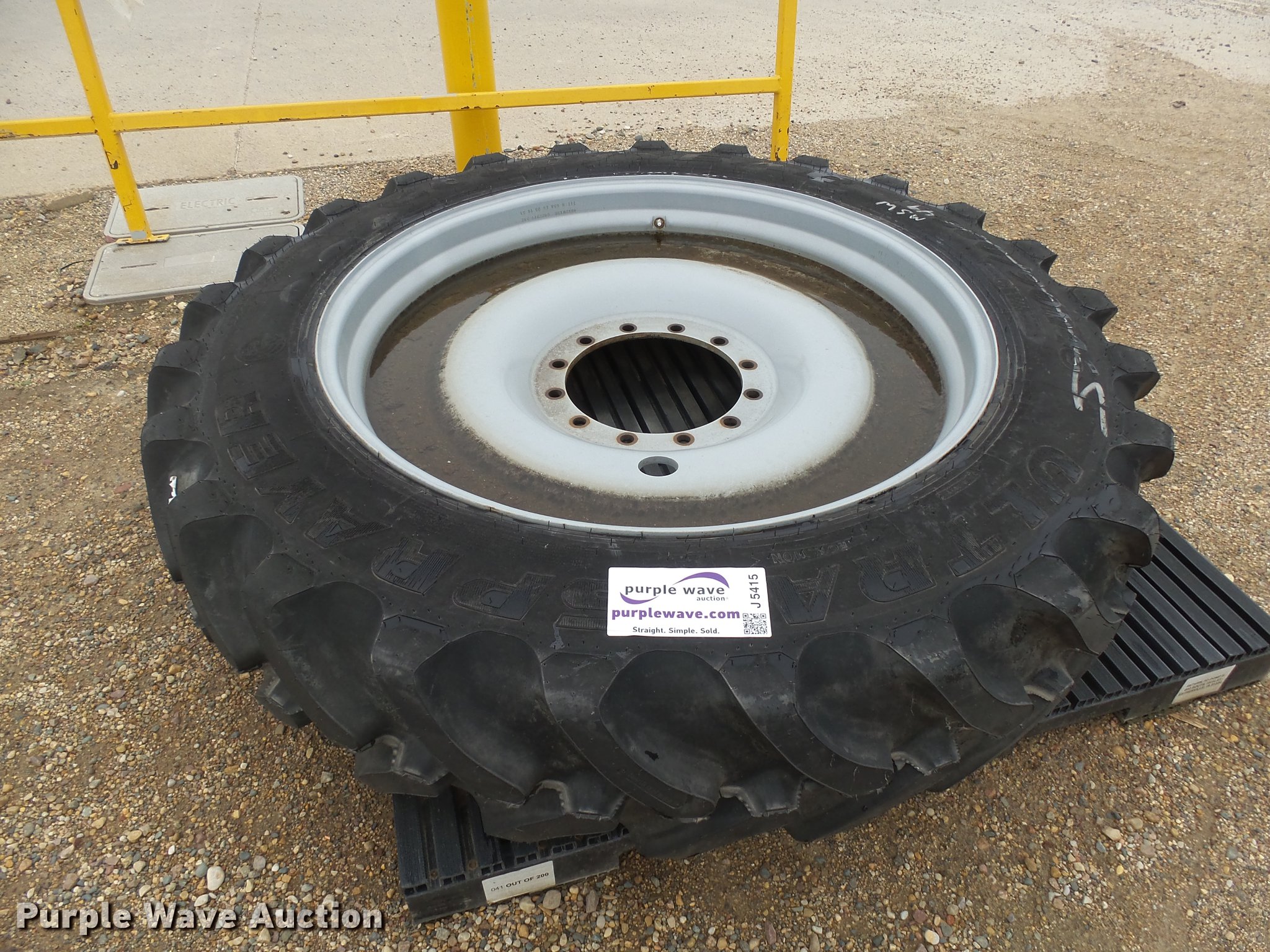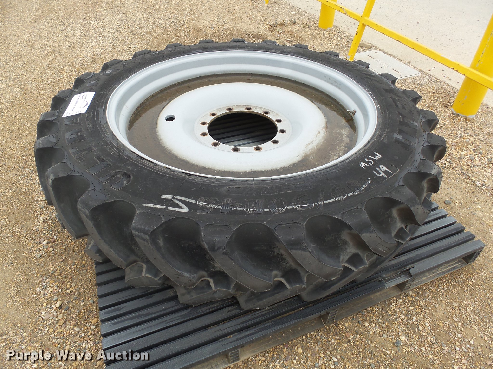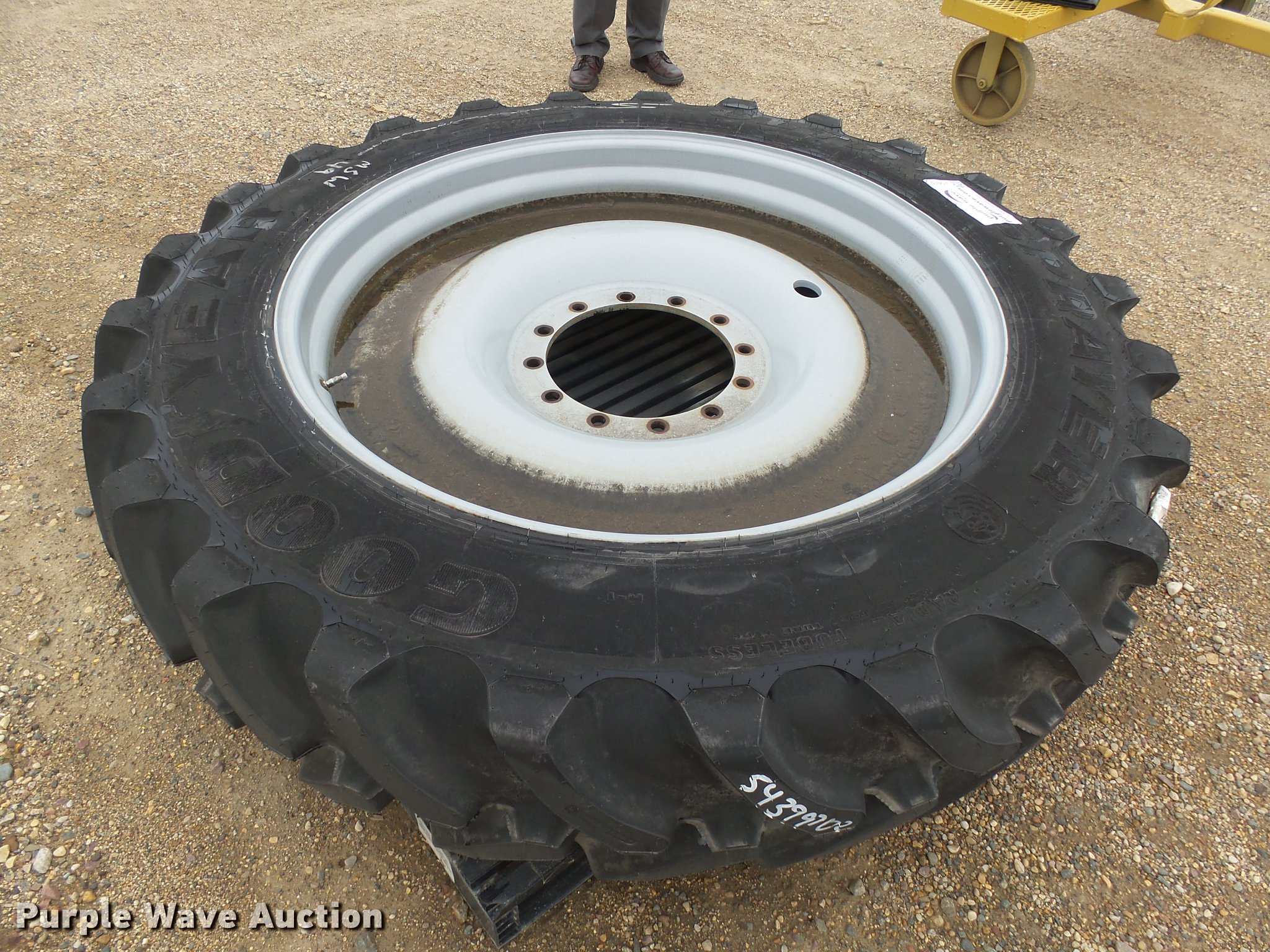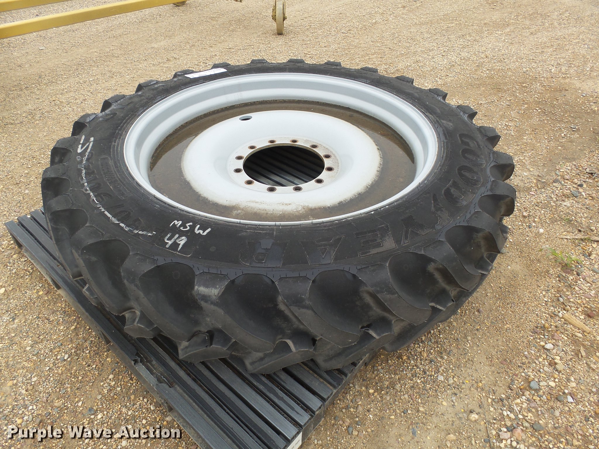 Purple Wave is selling a used Industrial Tires or Tracks in Minnesota. This item is a Goodyear 380/90R46 tire and wheel with the following: Unused, Fits RG700