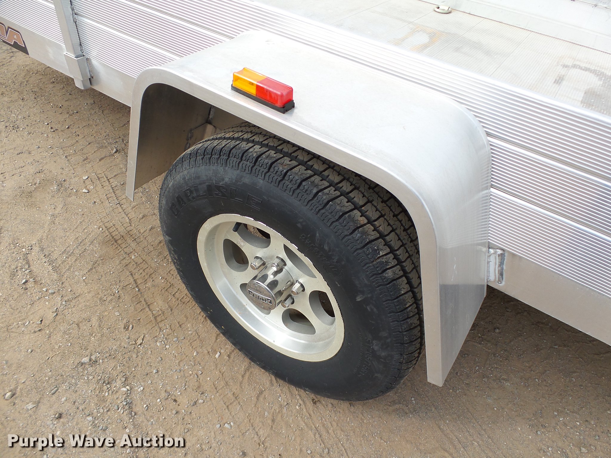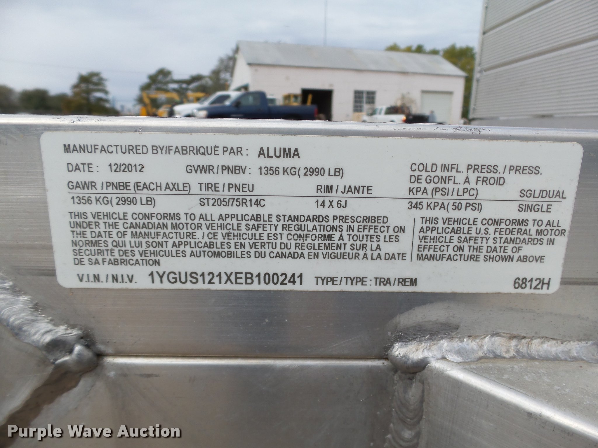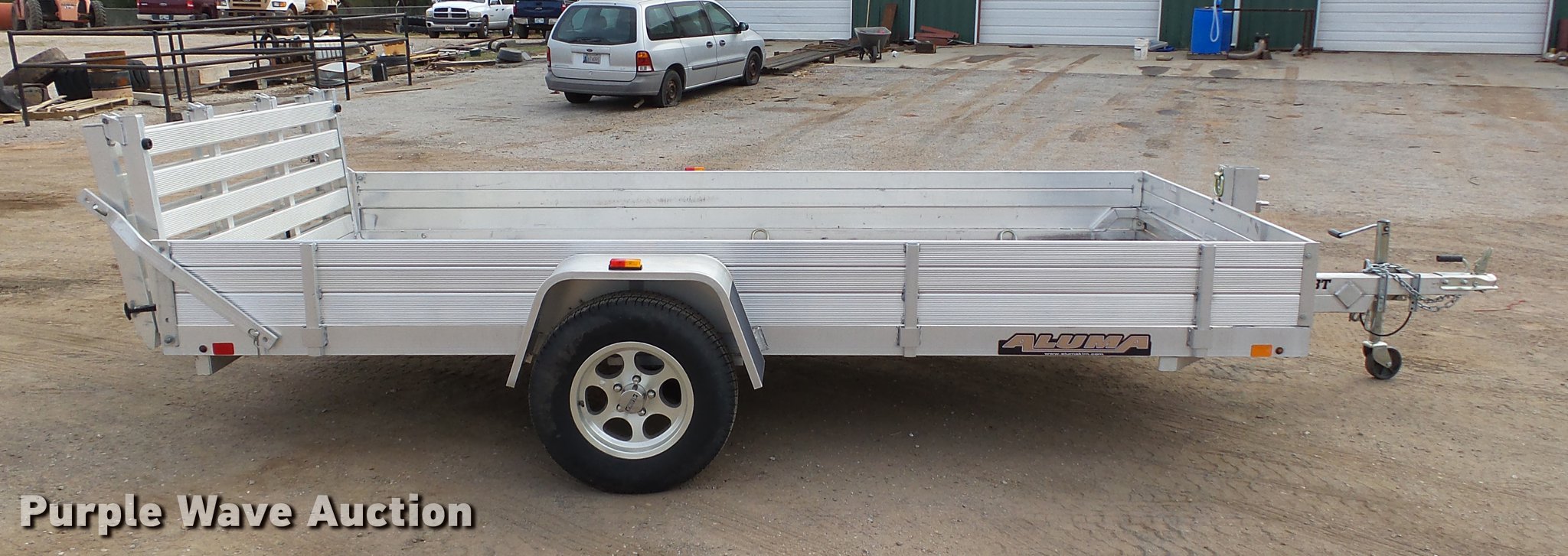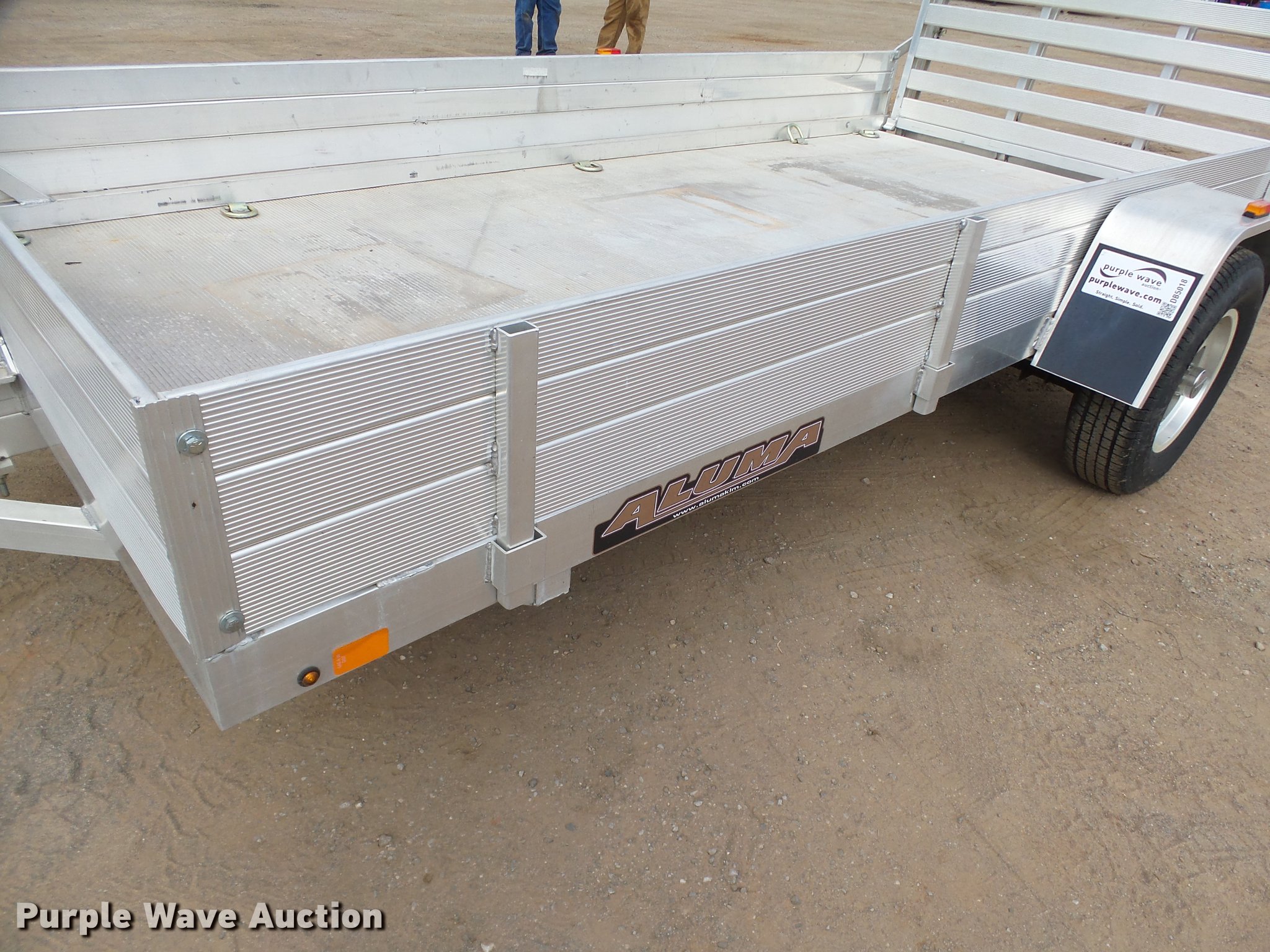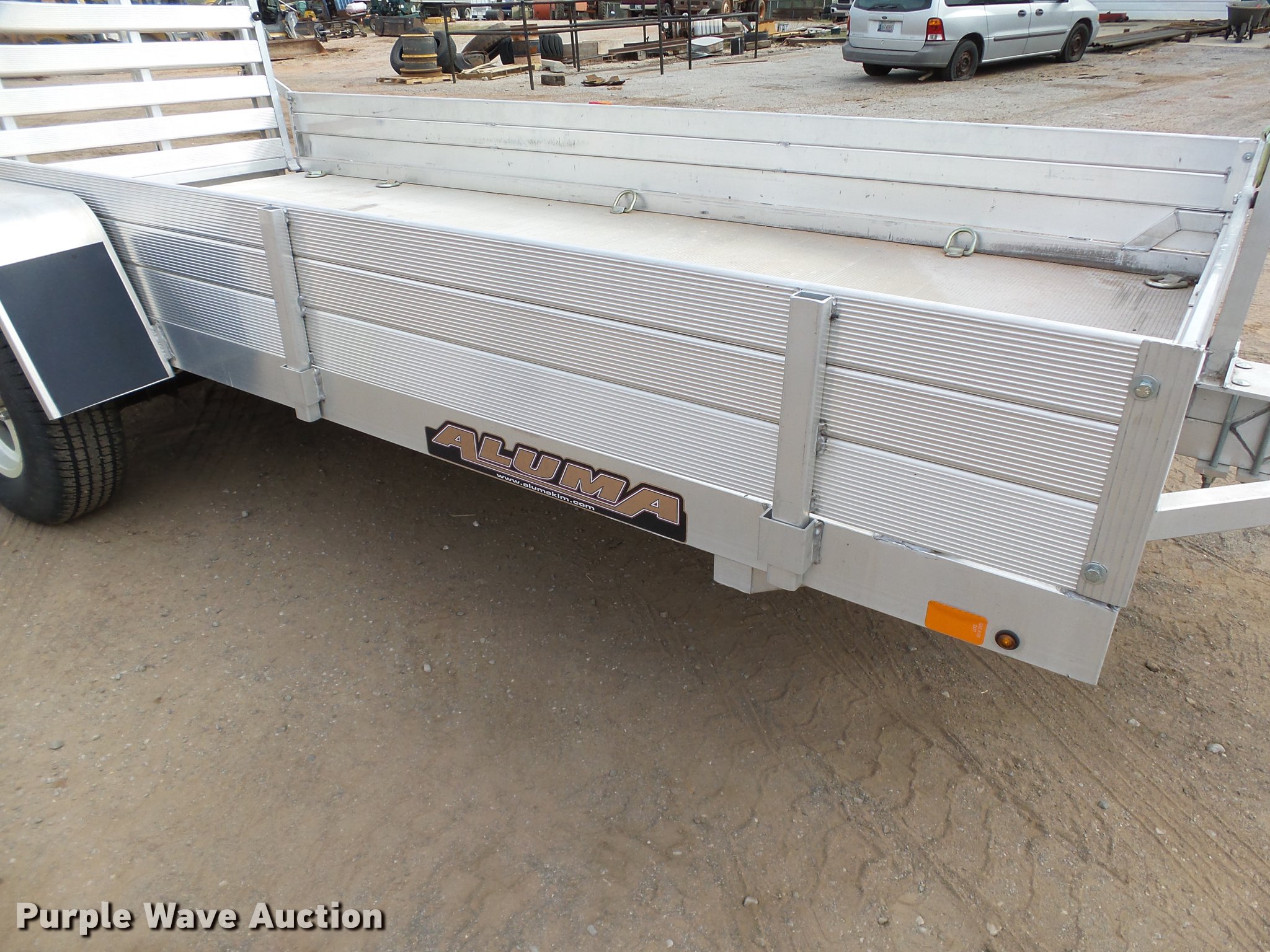 Purple Wave is selling a used Car or Utility Trailer in Oklahoma. This item is a 2012 Aluma 6812H73T utility trailer with the following: 16.5'L x 72"W, 12.5'L deck, 14" side height, 17" floor height, 5'L ramps, Aluminum deck, D-ring tie downs, Stake pockets, Removable sideboards, 2" ball hitch, Single leg landing gear, Spring suspension, Single axle, Aluminum wheels, Carlisle 205/75R14 tires, GVWR 2,990 lbs