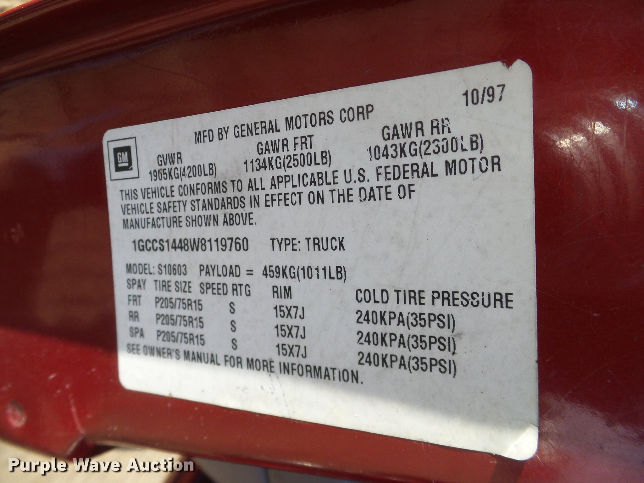 Purple Wave is selling a used Compact Pickup or Van in Oklahoma. This item is a 1998 Chevrolet S10 pickup truck with the following: 165,135 miles on odometer, 2.2L L4 OHV 8V gas engine, Automatic transmission, AC and heat, Tilt, Cruise, AM/FM/CD, Manual windows and locks, Cloth interior, Long bed, Bed liner, 205/75R15 tires