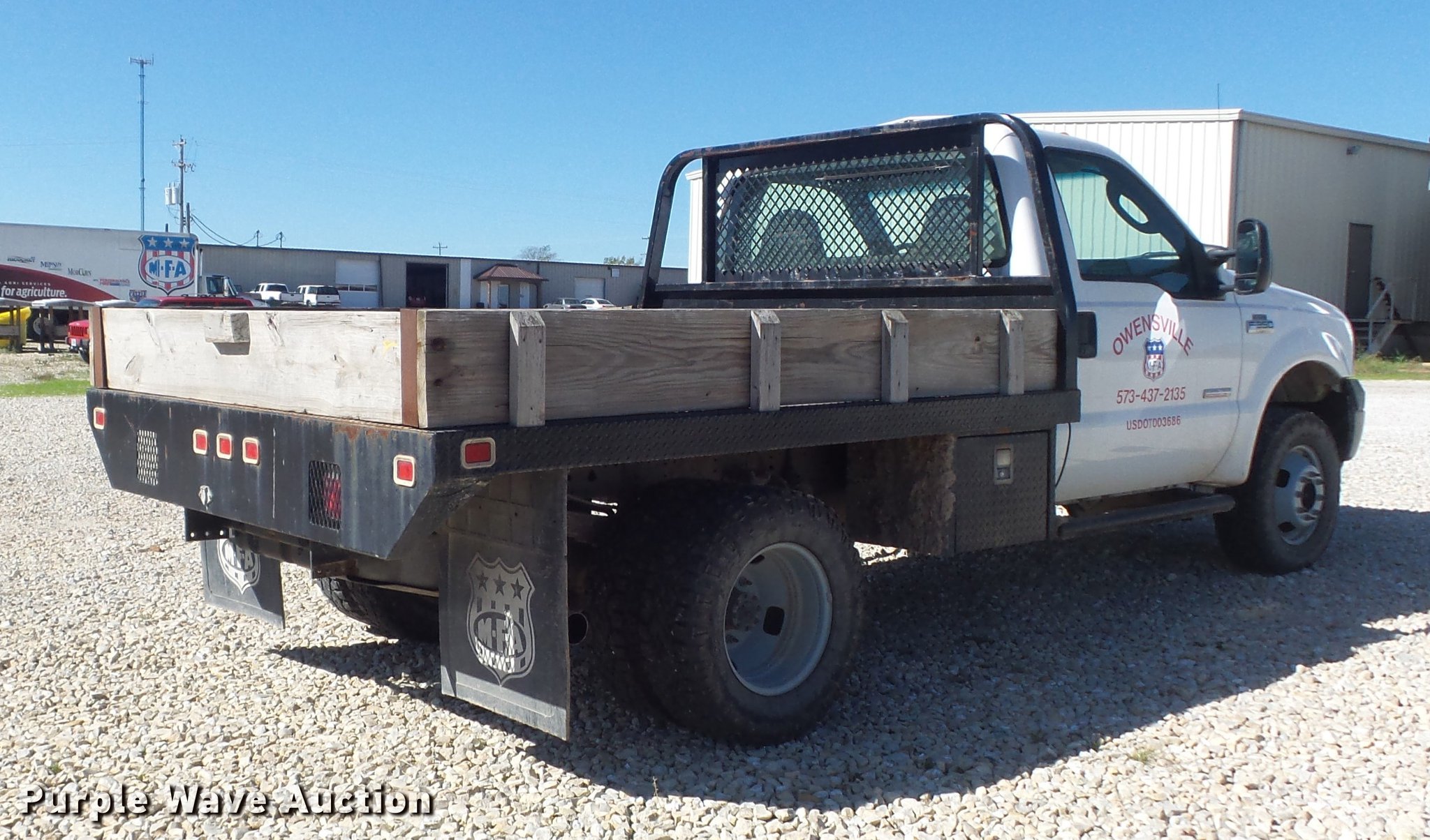 2006 Ford F350 Super Duty XL flatbed pickup truck. 120,753 miles on odometer, 6.0L V8 OHV 32V turbo diesel engine, Automatic transmission, Four wheel drive, AC and heat, Tilt, Cruise, AM/FM, Manual windows and locks, Vinyl interior, Running boards, 9'L x 94"W flatbed Toolbox, Gooseneck ball, Trailer wiring, LT245/75R17 tires, Check engine light on, Engine issues, cylinder head gasket blown, Coolant being forced out of radiator. Missouri title. 1FDWF37PX6EC74861. MFA, Inc.. 1312 Highway 28 West. Owensville, MO 65066