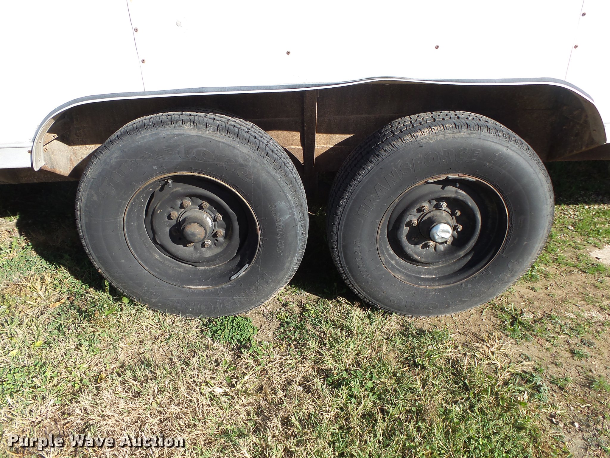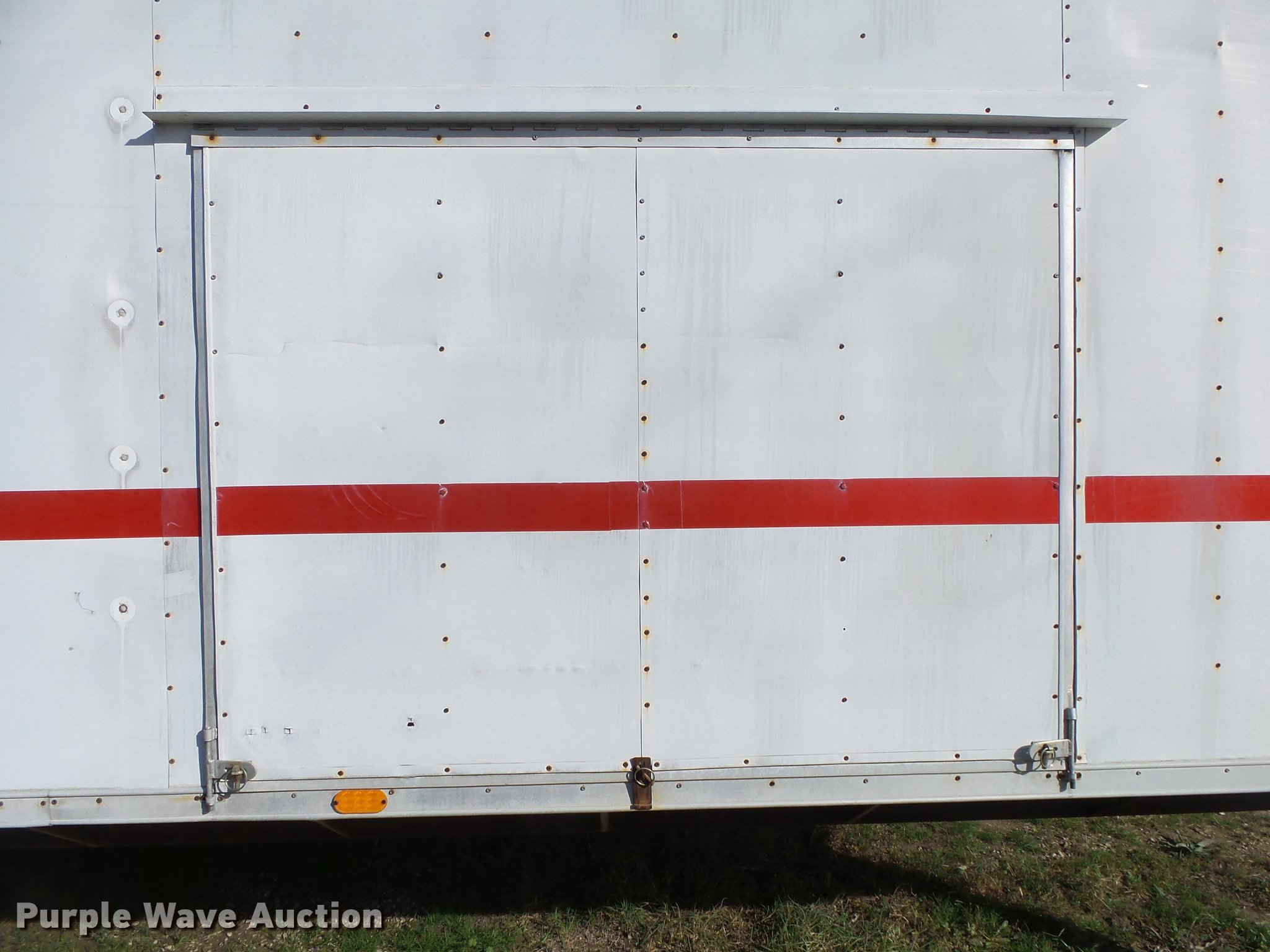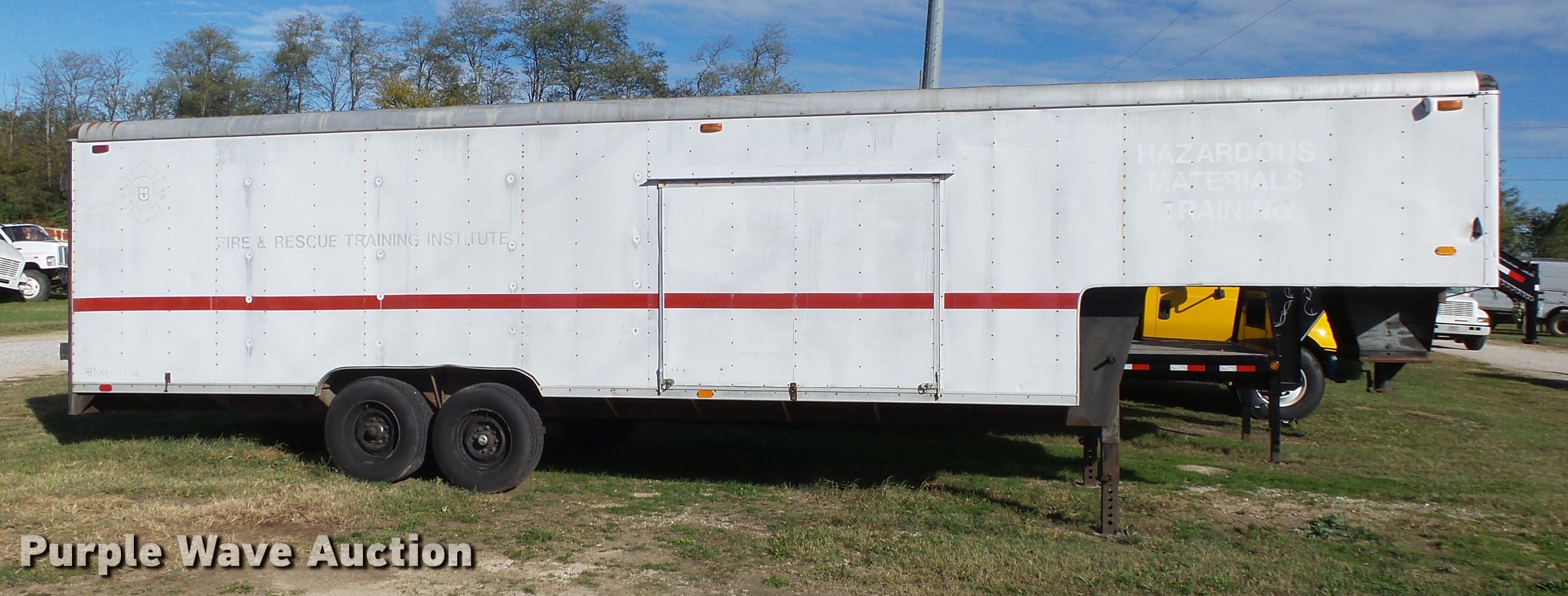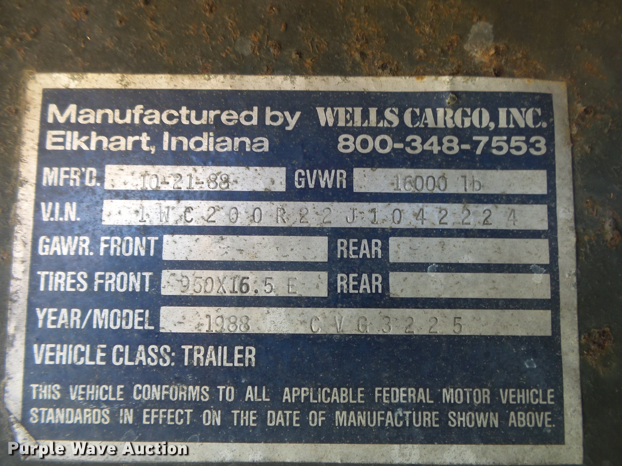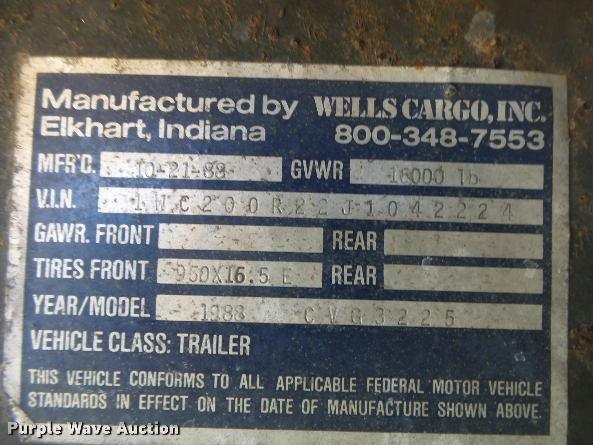 Purple Wave is selling a used Enclosed Cargo Trailer in Missouri. This item is a 1988 Wells Cargo CVG3225 enclosed cargo trailer with the following: 32'L x 93"W, Wood deck, Swinging rear doors, Left and right side doors, Gooseneck hitch, Dual leg landing gear, Spring suspension, Electric brakes, Tandem axle, Steel wheels, 9.50R16.5 tires, GVWR 16,000 lbs