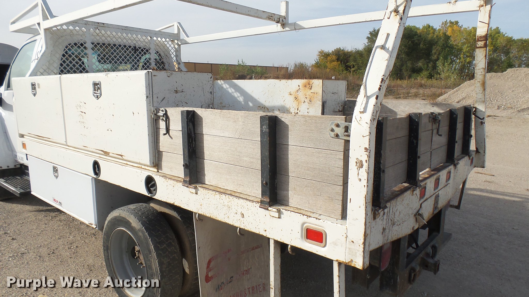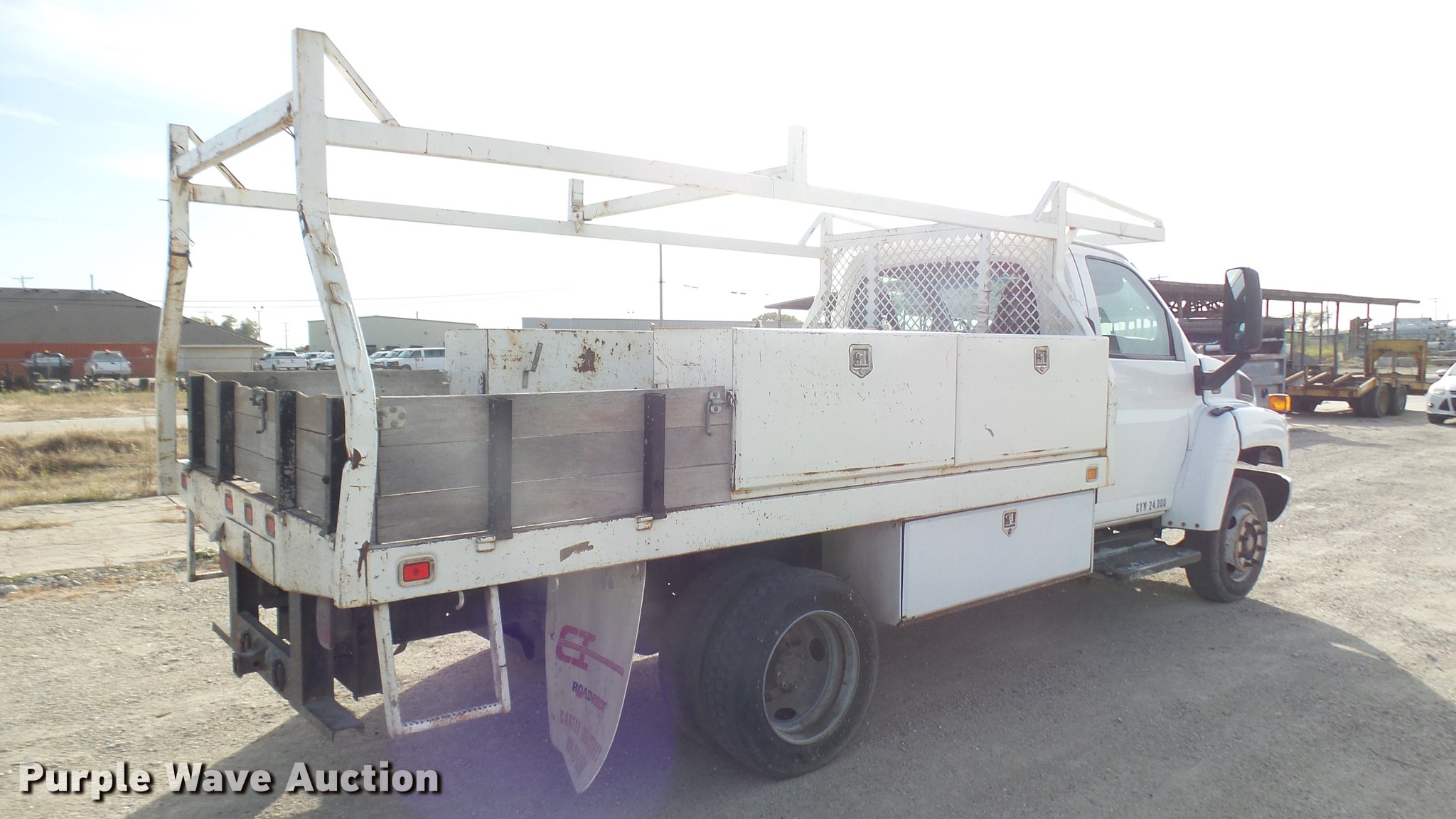 Purple Wave is selling a used Flat Bed Truck in Kansas. This item is a 2006 GMC C4500 flatbed truck with the following: 166,346 miles on odometer, 6.6L V8 turbo diesel engine, Automatic transmission, Single axle, AC and heat, AM/FM, Manual windows and locks, Power mirrors, Cloth interior, 153"L x 8'W flatbed, Wood floor, Toolboxes, Utility rack, Receiver hitch, Trailer wiring, Spring suspension, Hydraulic brakes, 225/70R19.5 tires, GVWR 17,500 lbs