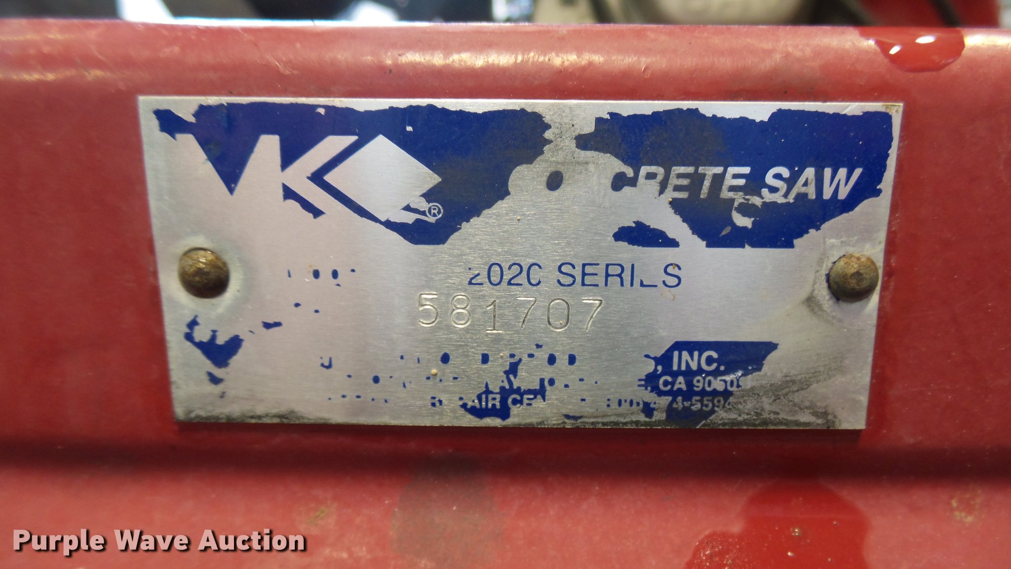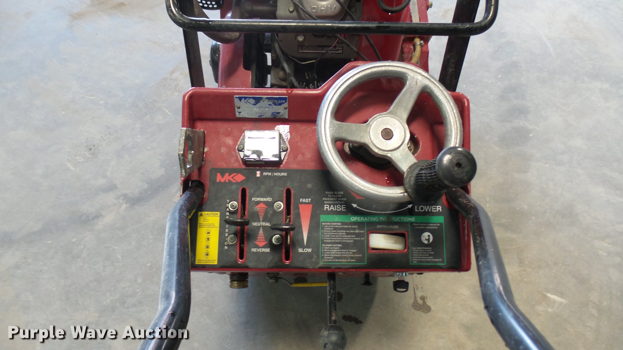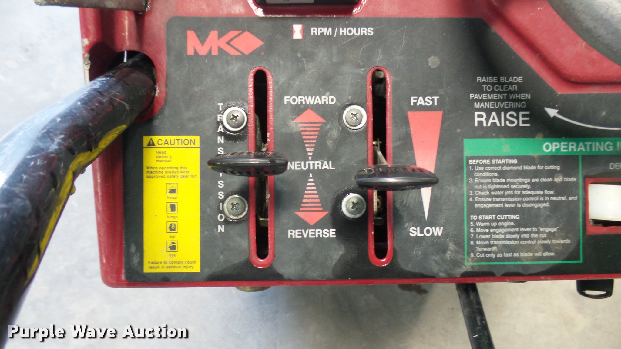 Purple Wave is selling a used Concrete Equip. or Acces. in Kansas. This item is a MK Diamond concrete saw with the following: 120 hours on meter, Honda GX620 gas engine, 20 HP, Forward/reverse, Electric start, 18" blade capacity, Depth gauge, Serial 581707