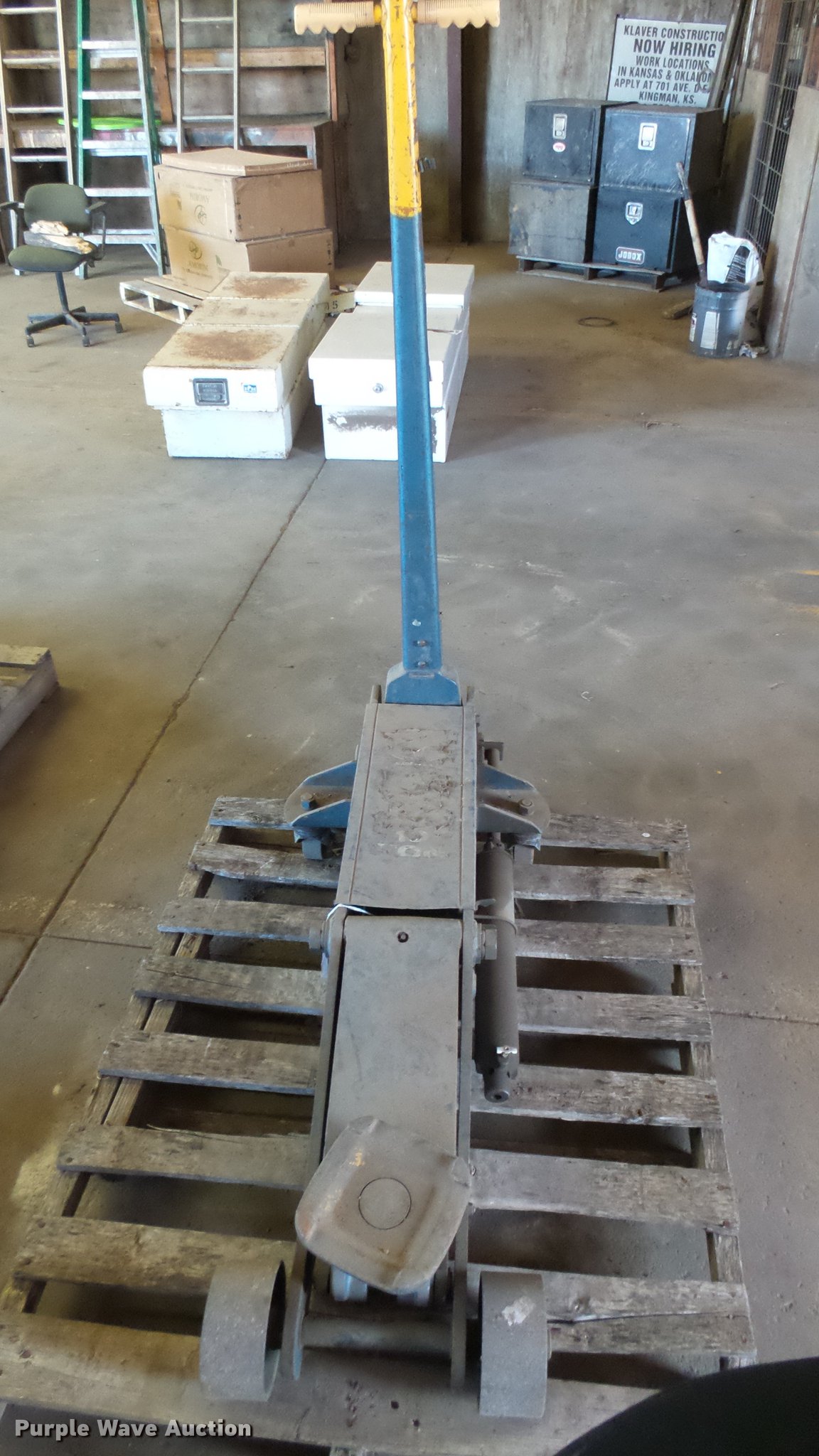 Walker 93662 floor jack. 10 ton, 5 7/8" to 25", Unknown operating condition. Klaver Construction. 701 E D Ave. Kingman, KS 67068