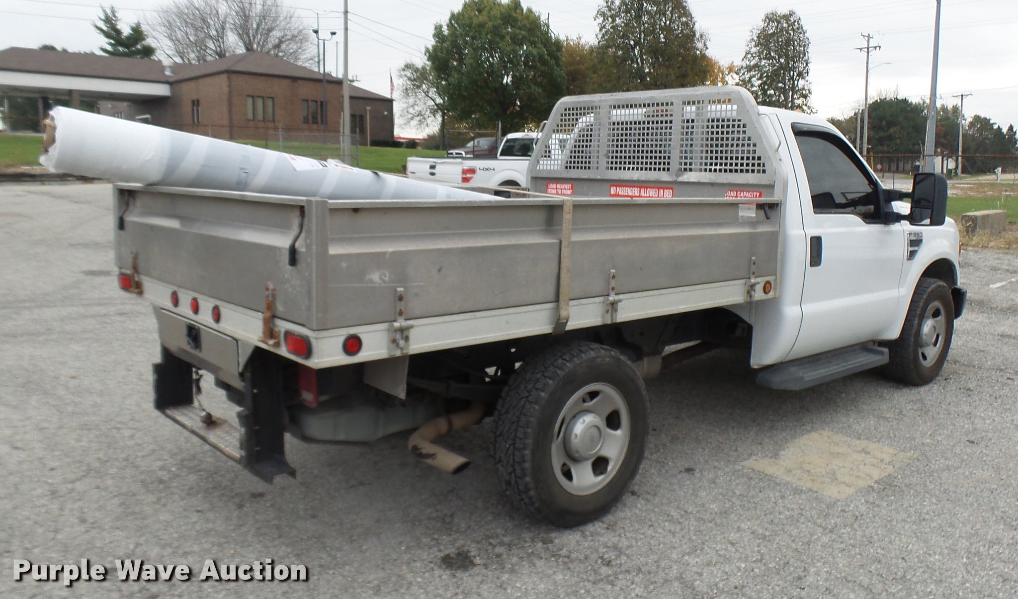 2008 Ford F350 Super Duty flatbed pickup truck. 102,419 miles on odometer, 5.4L V8 SOHC 24V gas engine, Automatic transmission, AC and heat, AM/FM, Manual windows and locks, Vinyl interior, 9'L x 81"W flatbed 16"H fold down sides, Trailer wiring, 275/85R18 tires. Missouri title. 1FDSF34538ED31986. PJM Leasing, Inc.. 144 W Markey Rd. Belton, MO 64012