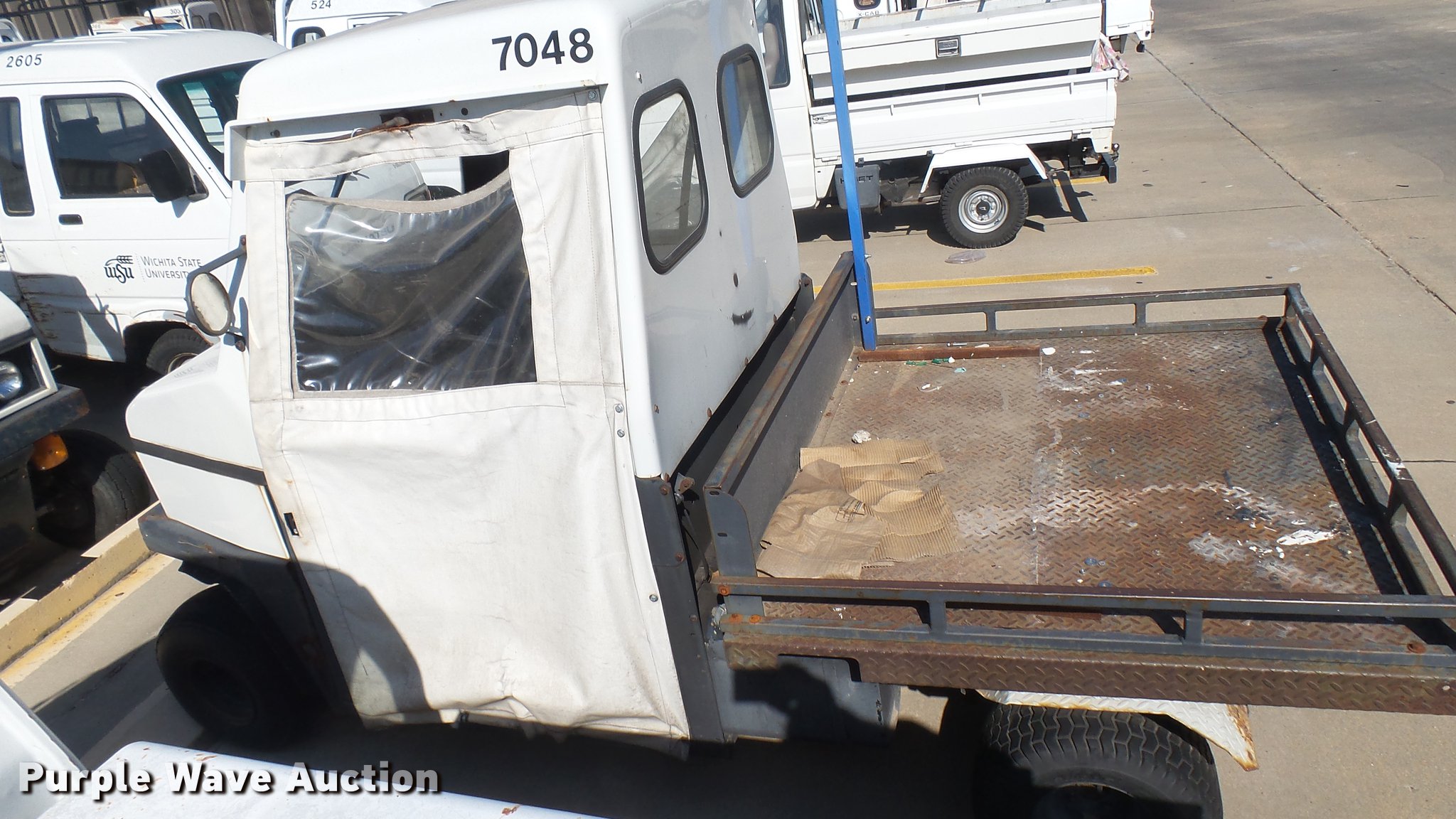 Purple Wave is selling a used Utility Vehicle in Kansas. This item is a 1988 Cushman utility vehicle with the following: 3,037 hours on meter, Two cylinder gas engine, Enclosed cab, 54" x 48" steel bed, 18x9.50-8 tires, Weak battery, Unit# 7048