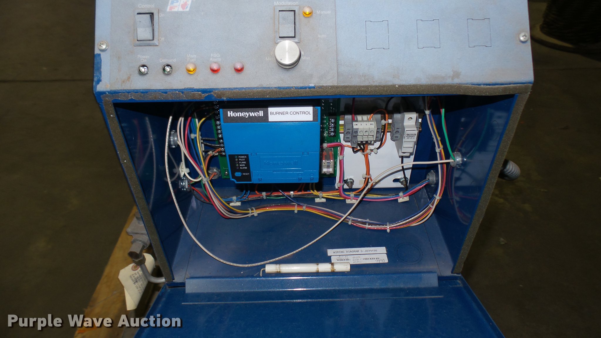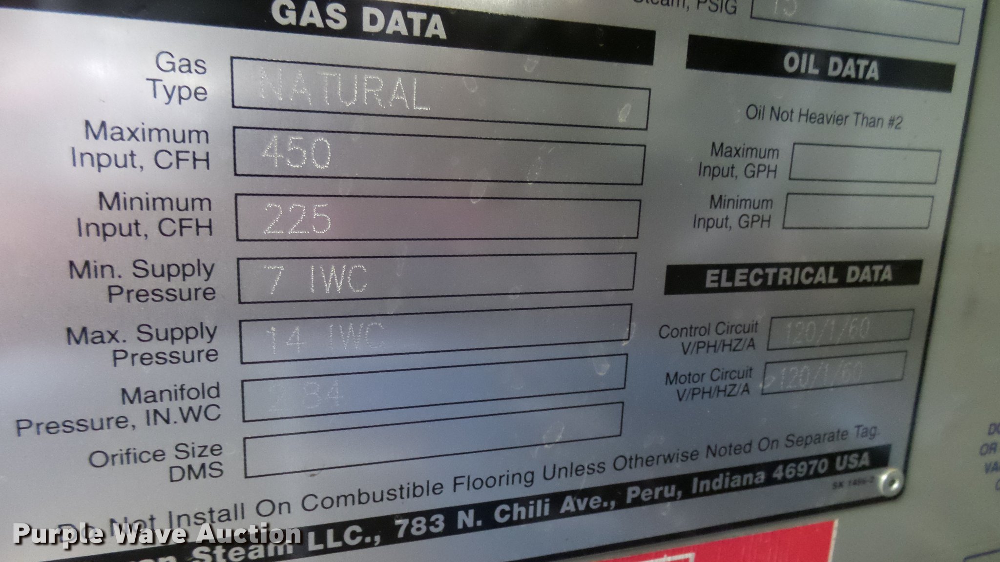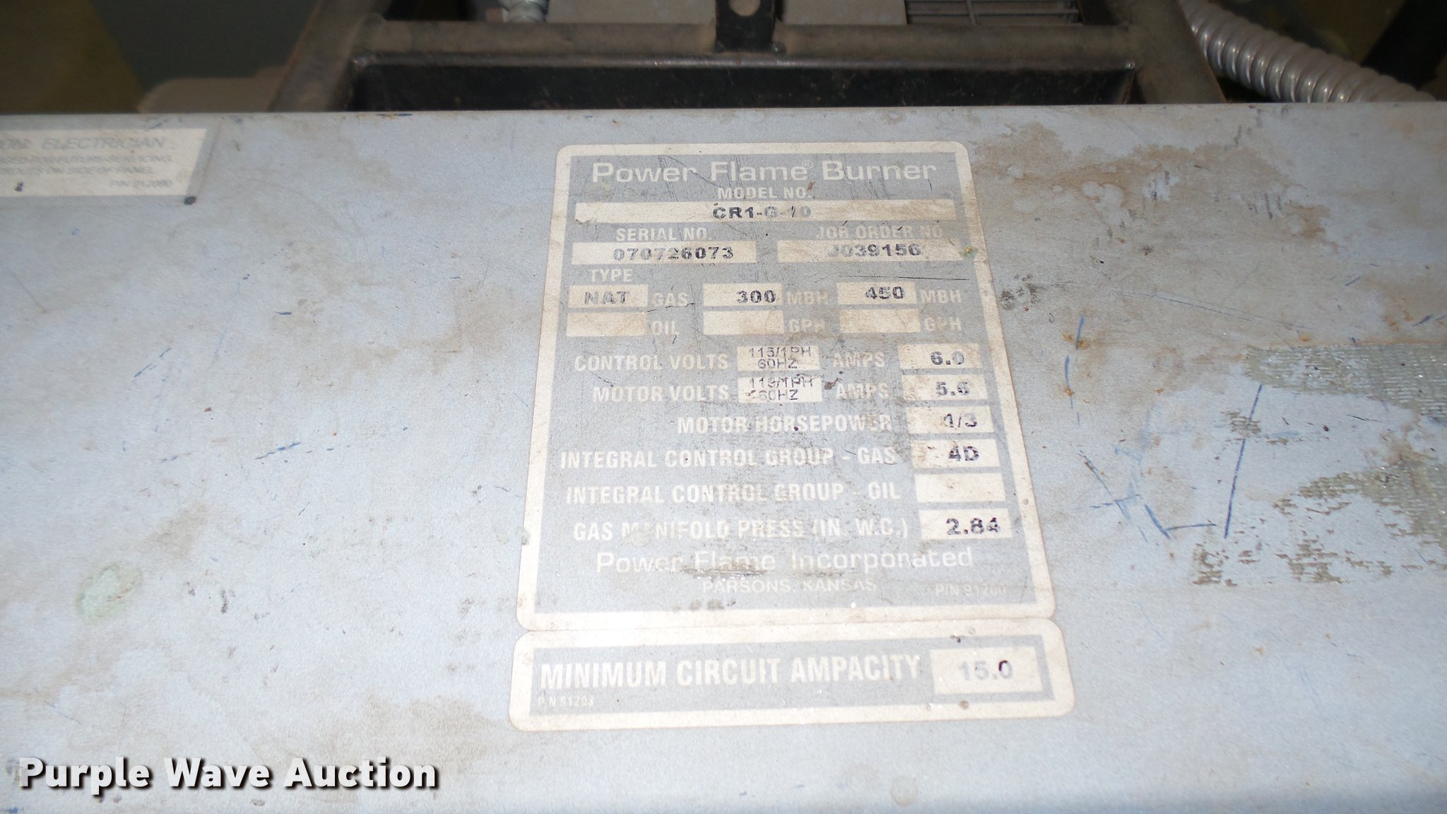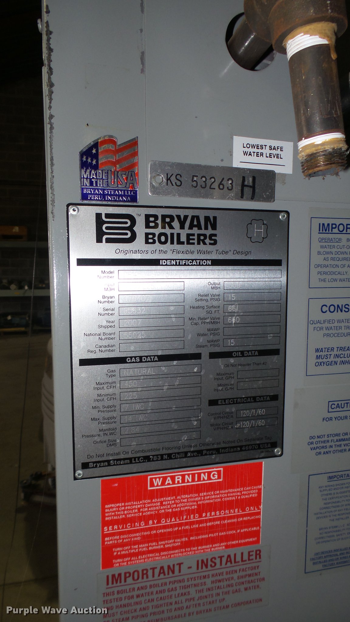 Purple Wave is selling a used Tools in Kansas. This item is a Bryan boiler with the following: Model DR450-S-15-FDG, 225/450 MBH input, 360 MBH output, 450 cfh, 120V, Power flame burner, Serial 95632