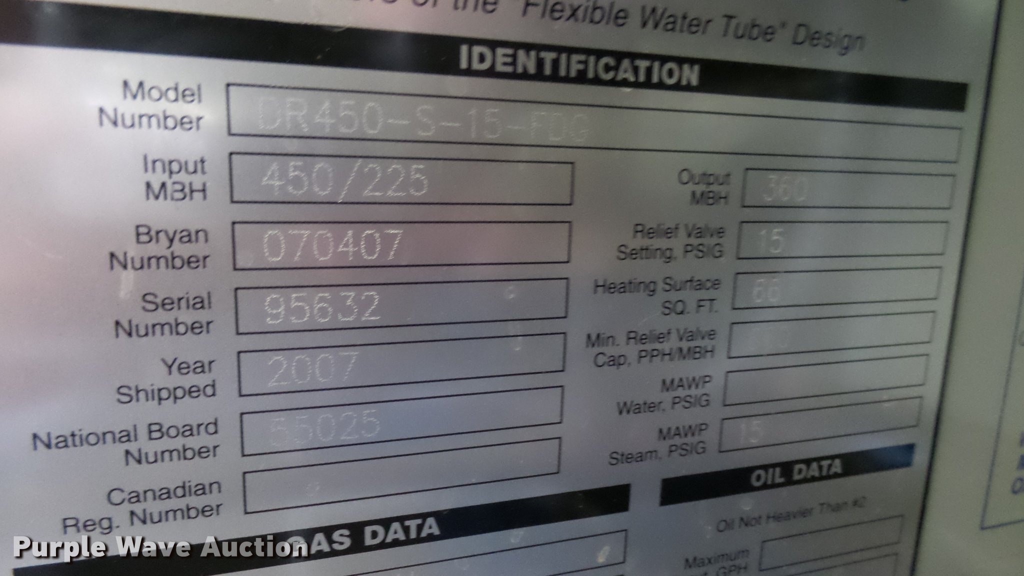 Bryan boiler. Model DR450-S-15-FDG, 225/450 MBH input, 360 MBH output, 450 cfh, 120V, Power flame burner, Serial 95632. AMR Steel & Supply. 800 E 21st St N. Wichita, KS 67214