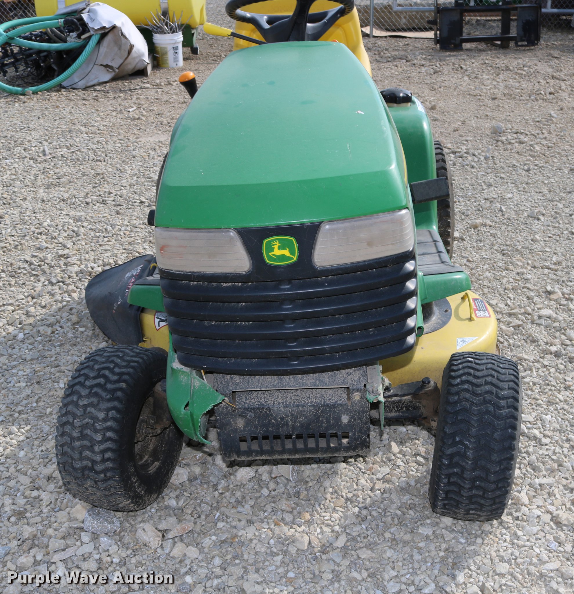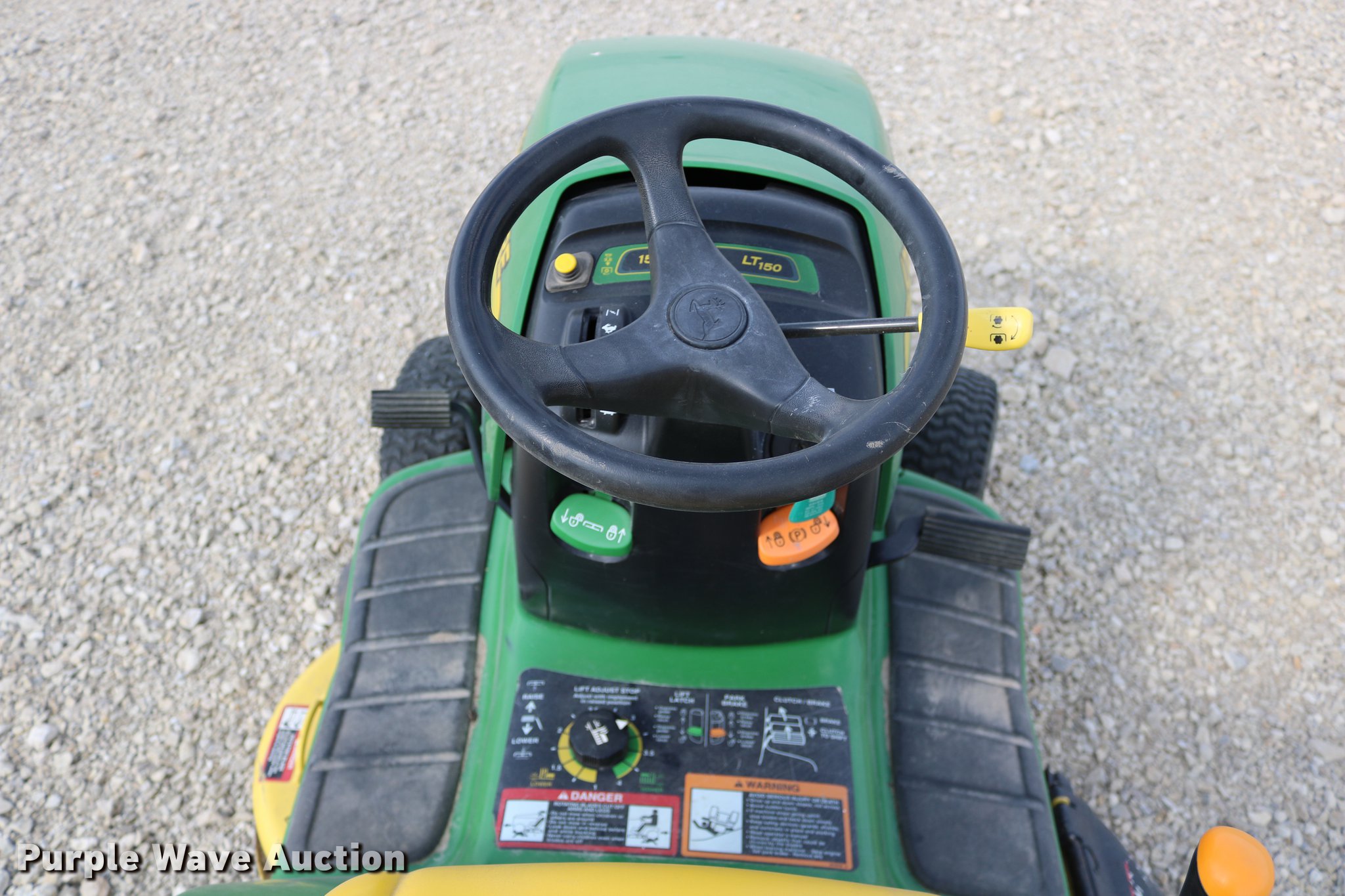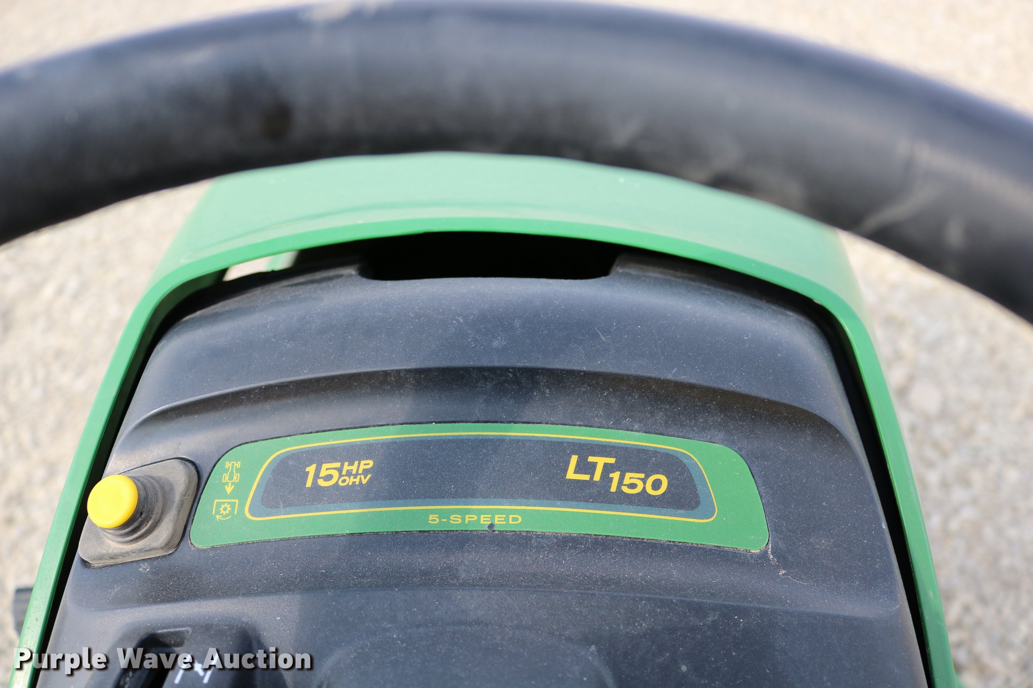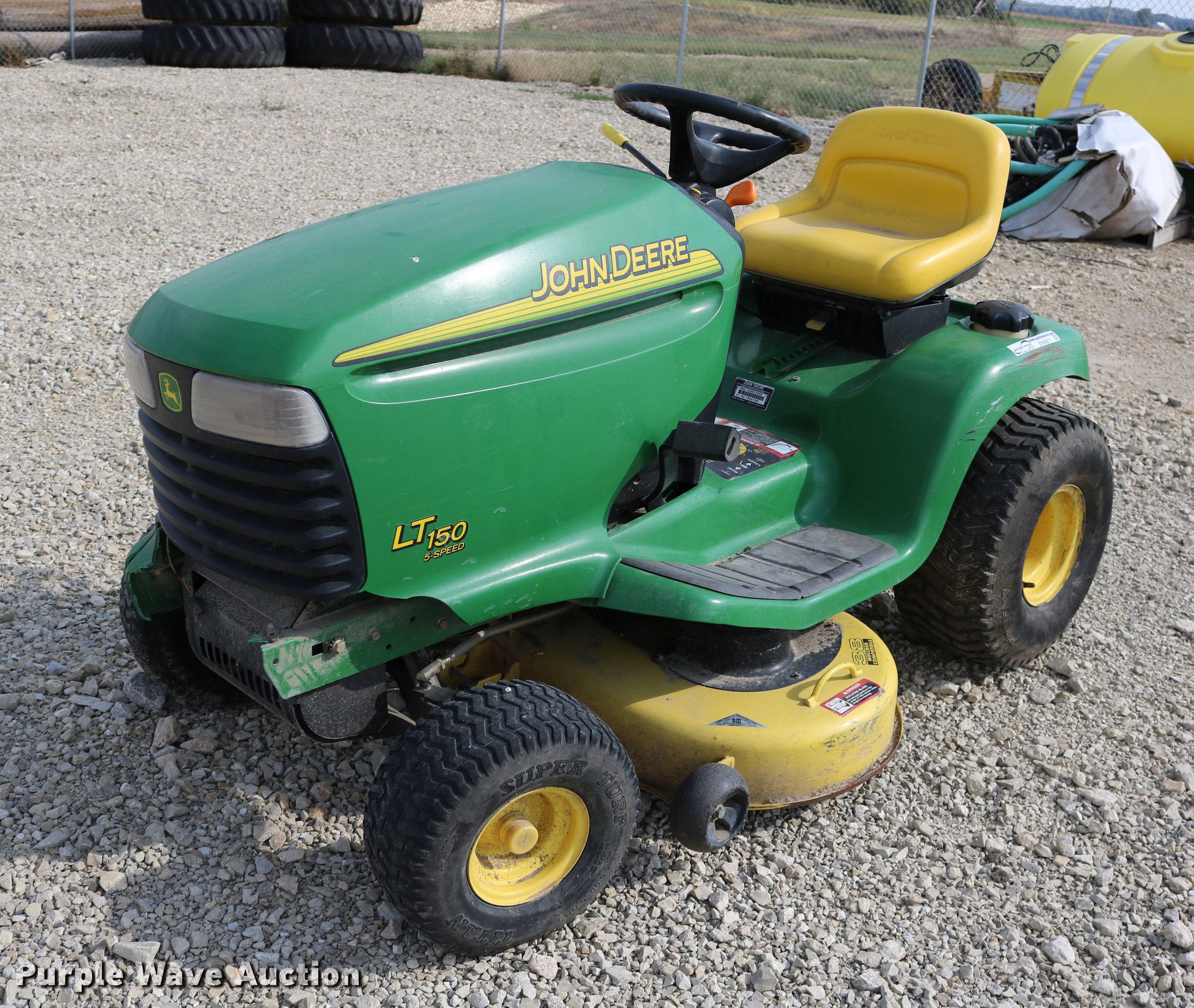 Purple Wave is selling a used Lawn Mower in Kansas. This item is a 2002 John Deere LT150 lawn mower with the following: 38" cut, John Deere 15 HP gas engine, Serial 3214209543, Manual transmission, 5F-1R gears, 15x6.00-6 front tires, 20x10.00-8 rear tires, Engine hood broken off, hinge broken off, Dead battery, Unknown operating condition, Serial M0L150A019265