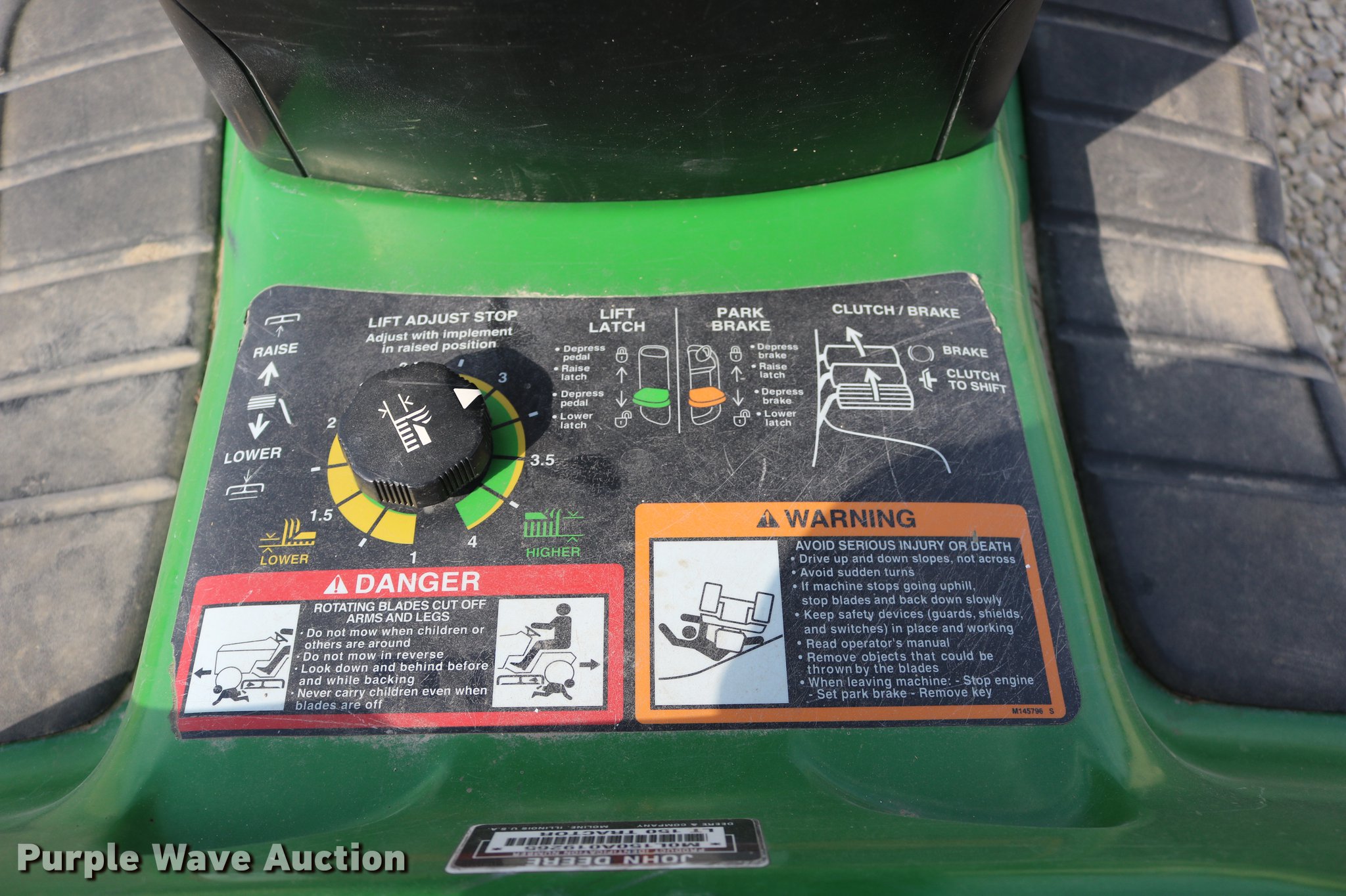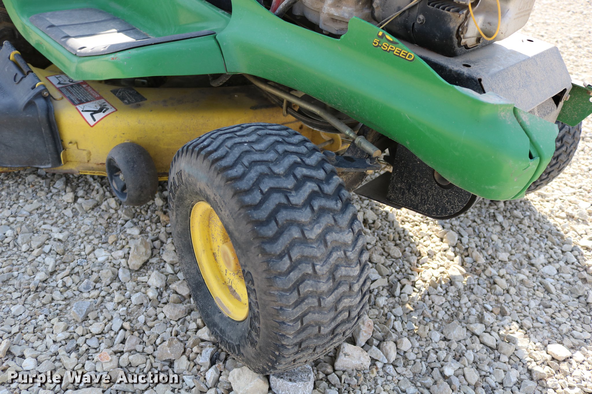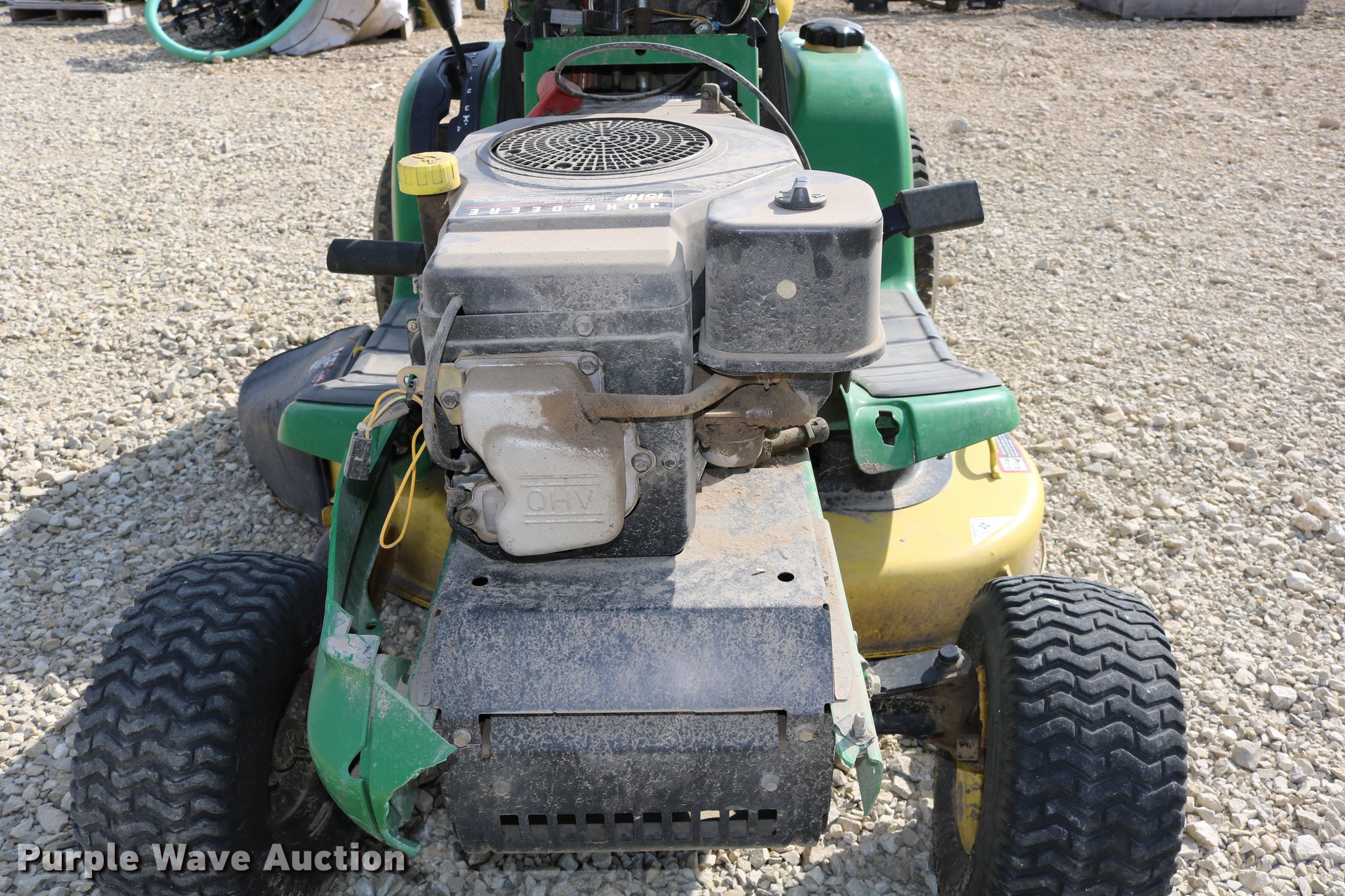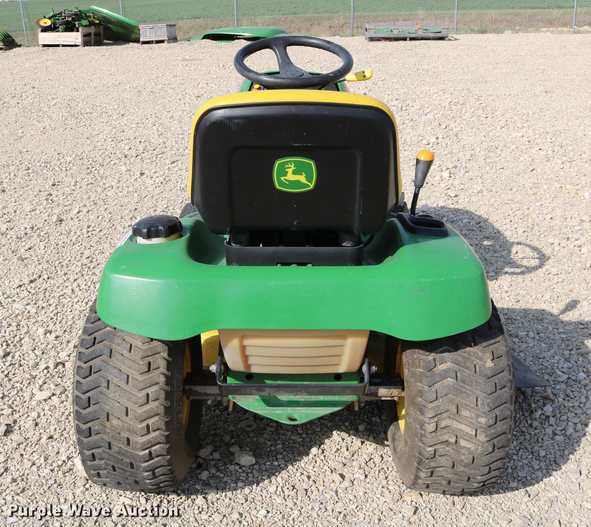 Purple Wave is selling a used Lawn Mower in Kansas. This item is a 2002 John Deere LT150 lawn mower with the following: 38" cut, John Deere 15 HP gas engine, Serial 3214209543, Manual transmission, 5F-1R gears, 15x6.00-6 front tires, 20x10.00-8 rear tires, Engine hood broken off, hinge broken off, Dead battery, Unknown operating condition, Serial M0L150A019265