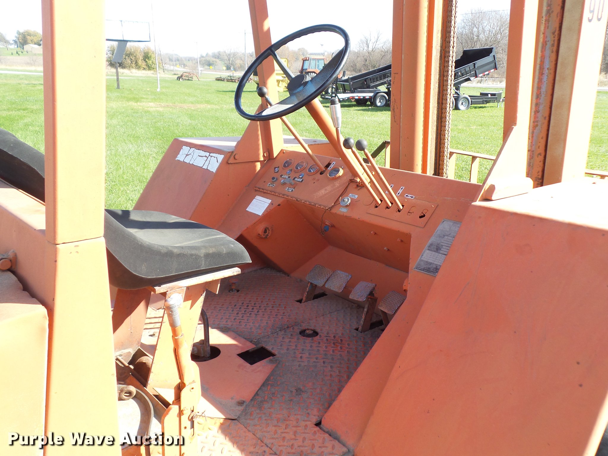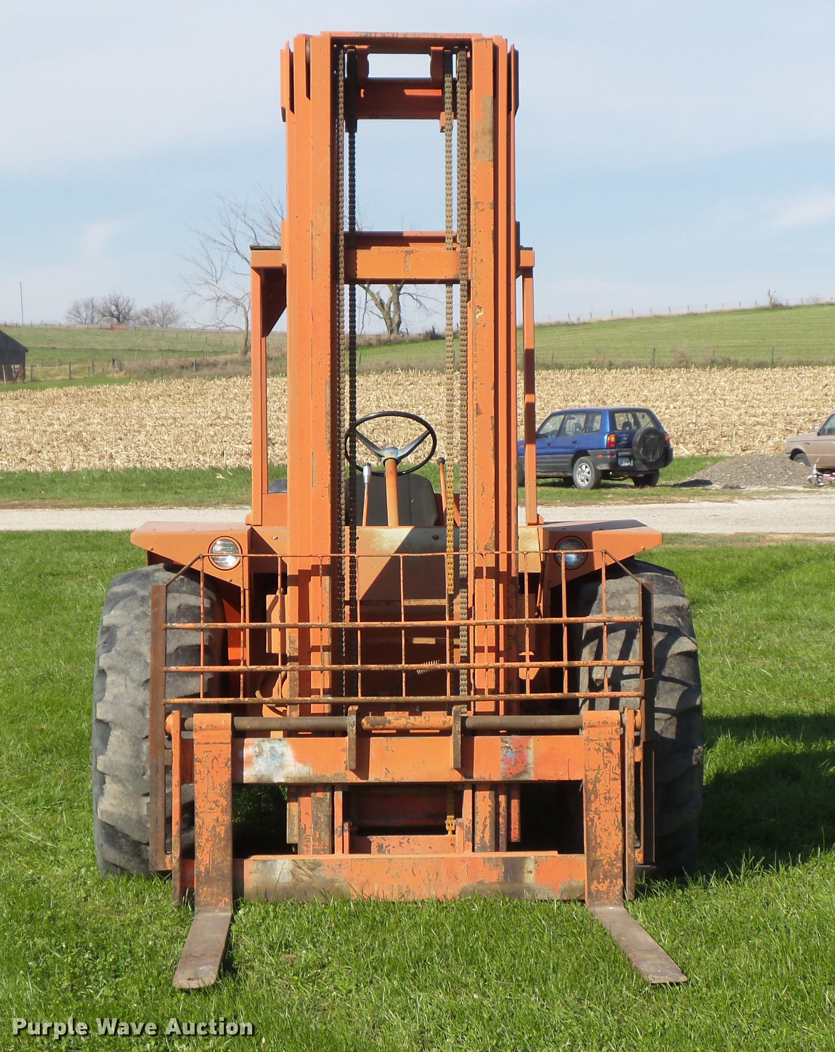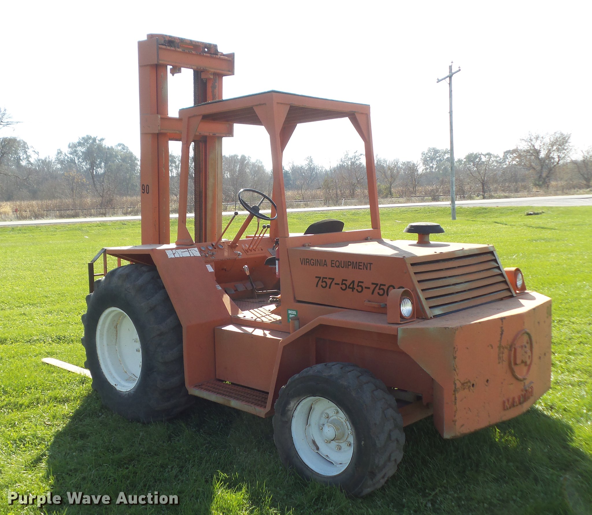 Purple Wave is selling a used Strt. Mast Rough Terr. Forklift in Iowa. This item is a 1989 Manitou T602TC-D forklift with the following: 2,035 hours on meter, Ford DD441D three cylinder diesel engine, Serial 204299H16, Powershift transmission, 3F-3R gears, 5,500 lbs max lift capacity, 22.25' max lift height, Three stage mast, Side shift, Mast tilt, 46"L x 5"W forks, 16.9-24 front tires, 12-16.5 NHS solid rear tires