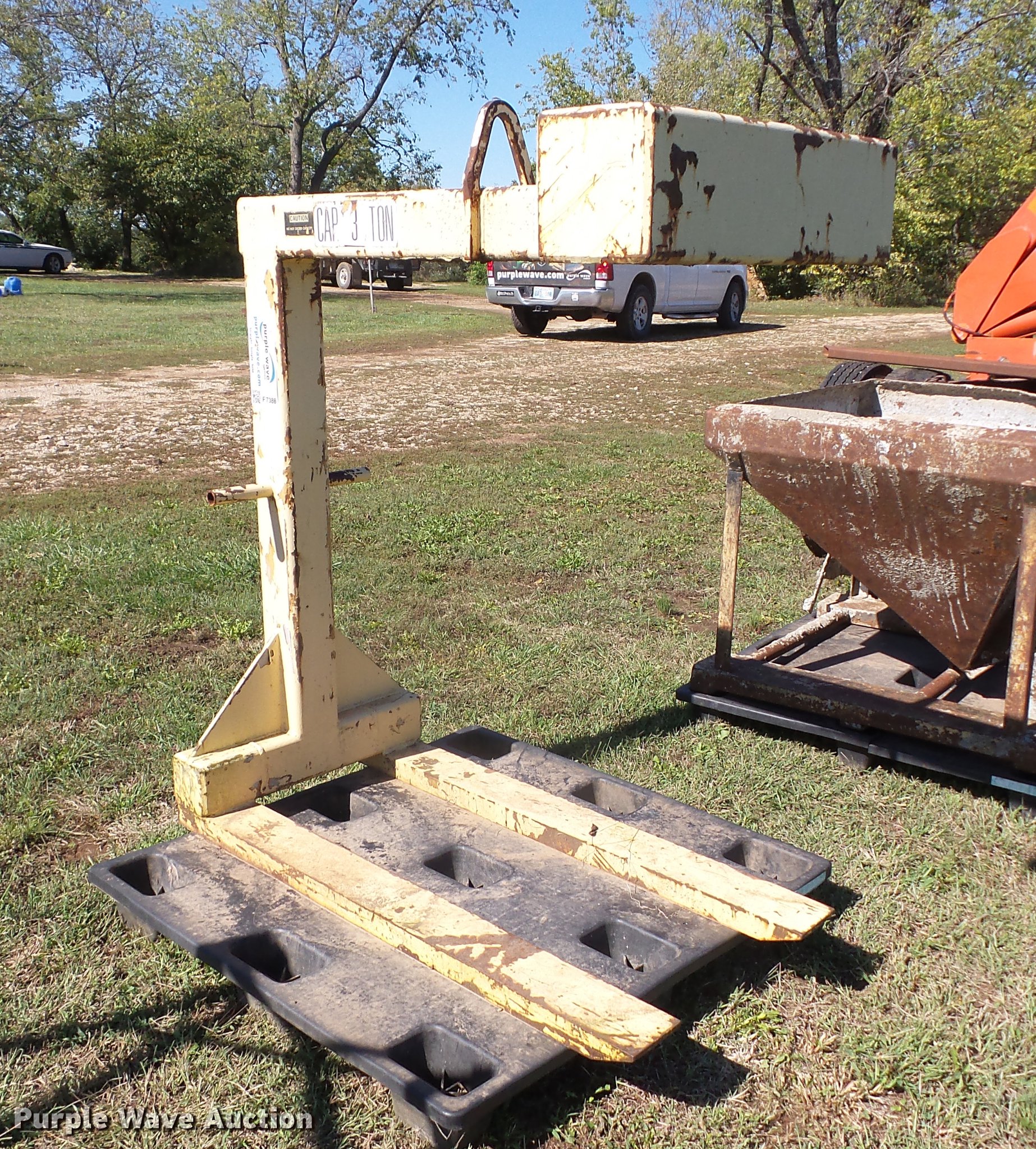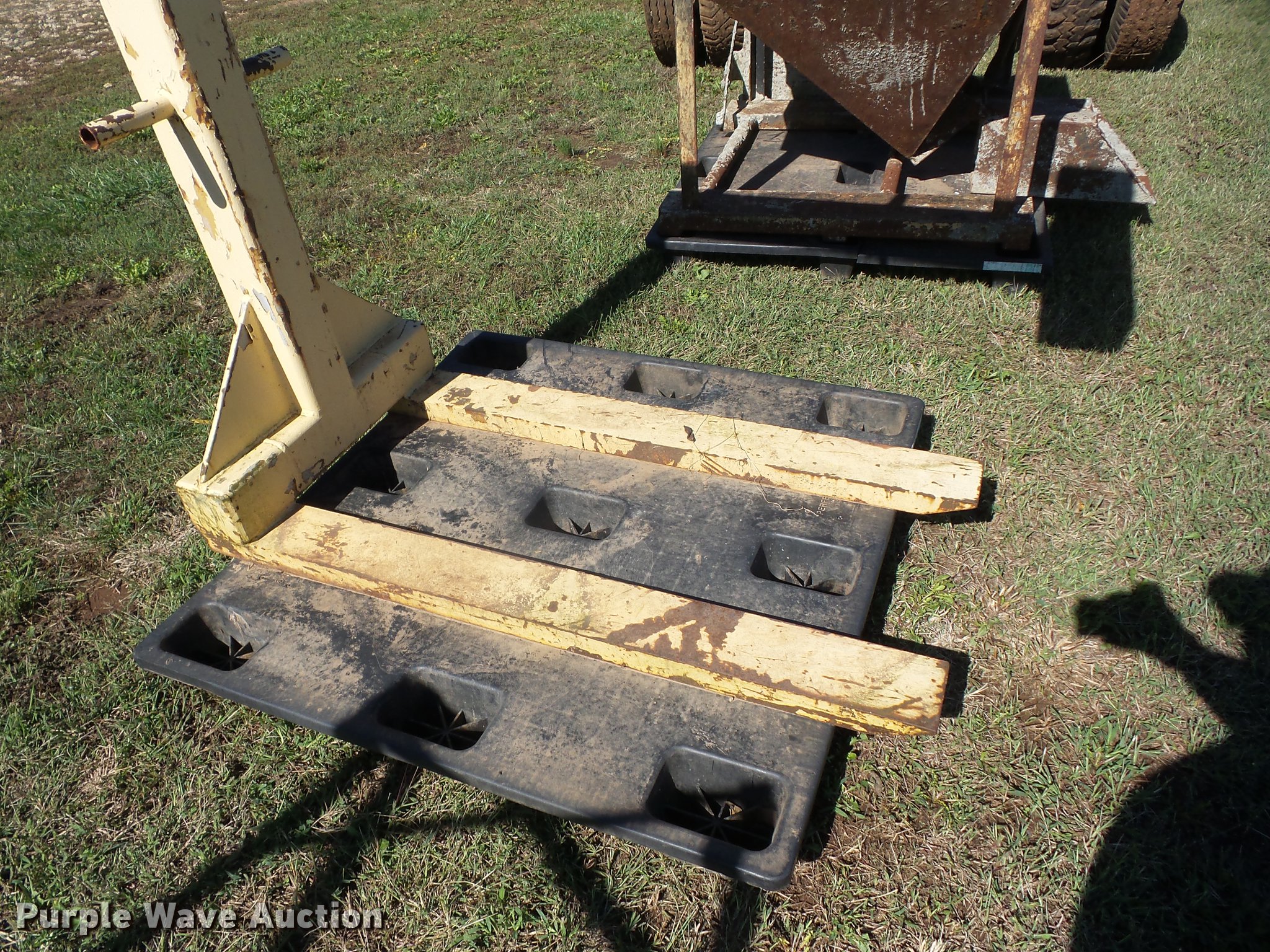 Purple Wave is selling a used Truck Part and Attach. in Kansas. This item is a Contrx fork attachment with the following: Approx. 53.5"L x 27.5"W x 61.5" O.D., 48"L x 5"W x 2"H forks, 6,000 lbs max lift capacity, Lifting eye, Top mounted counterweight, Fits boom truck