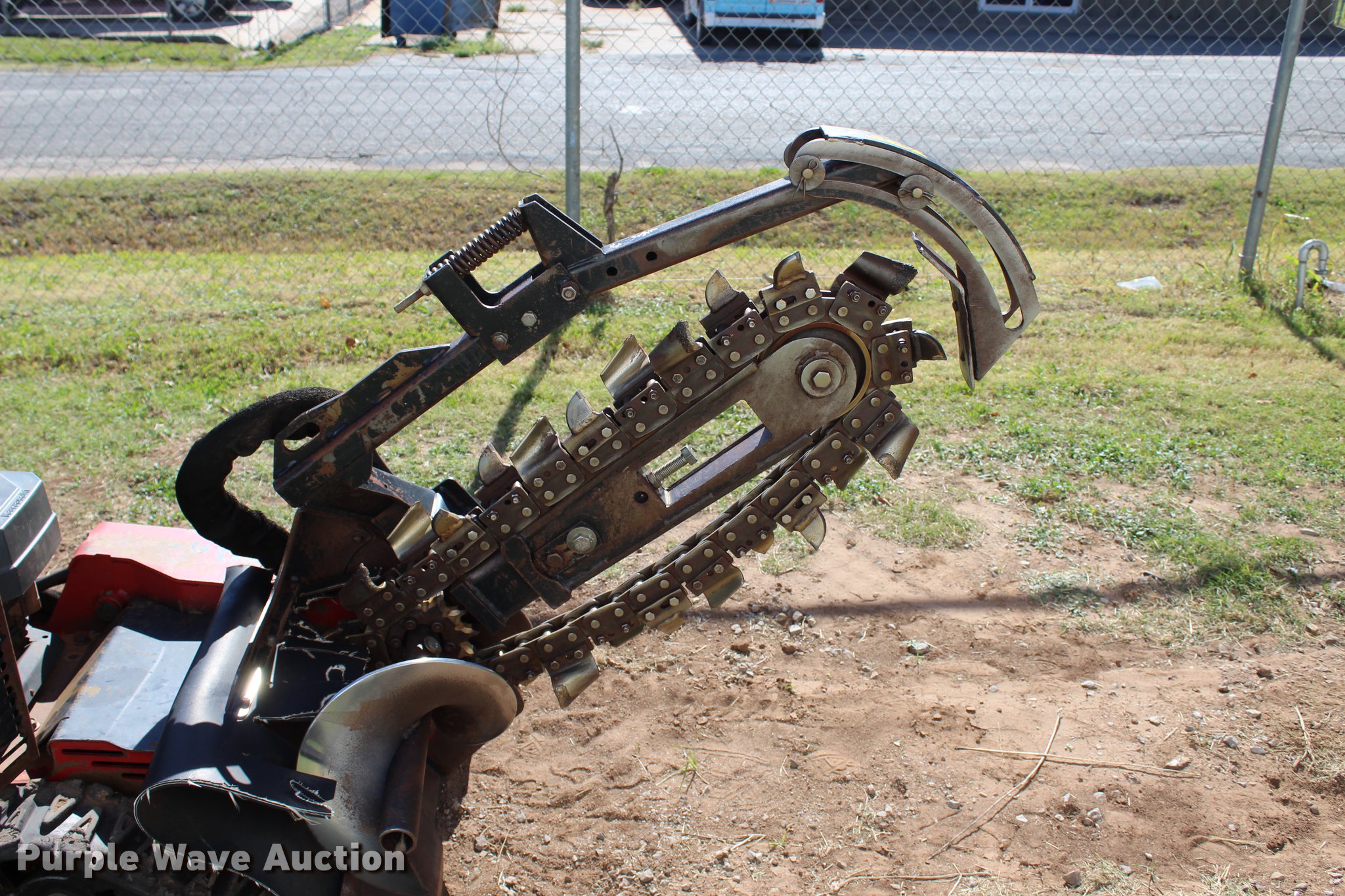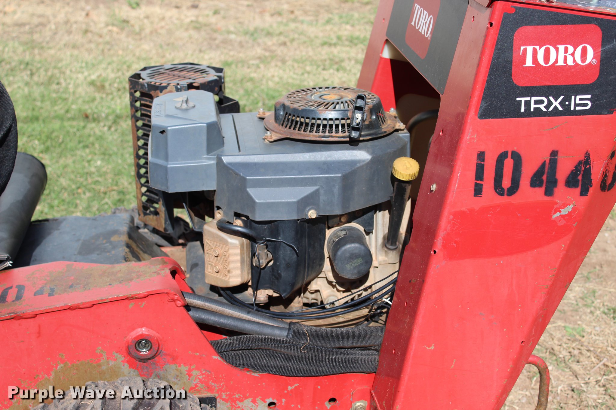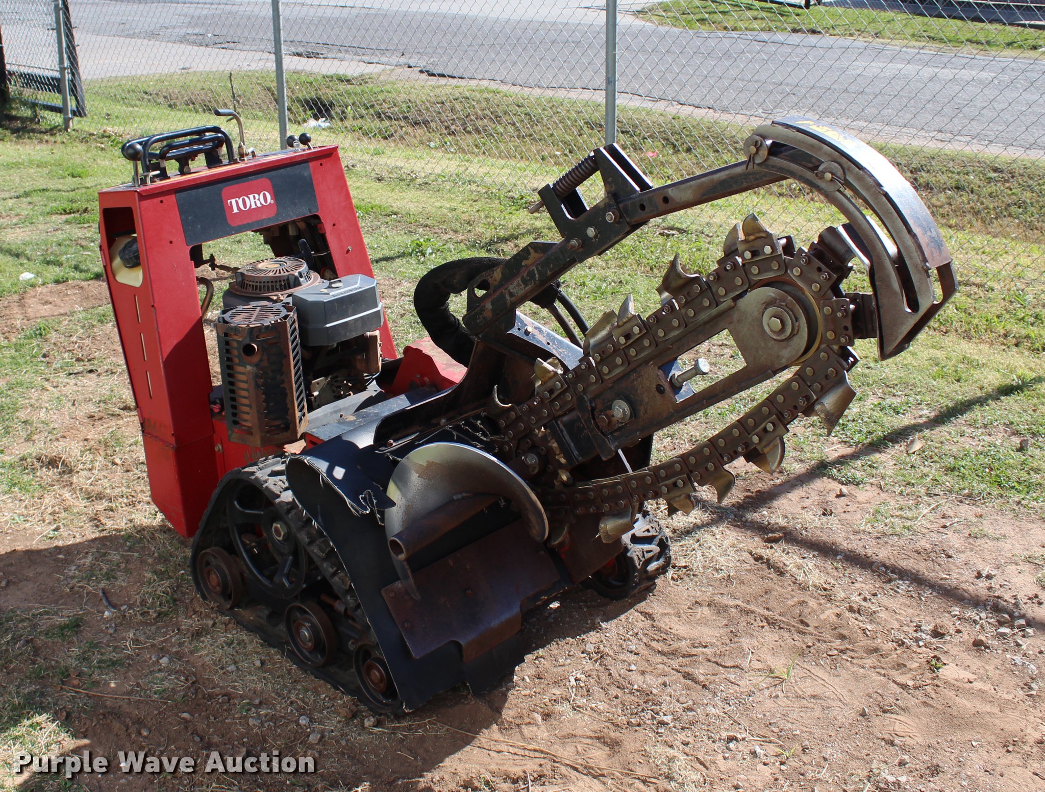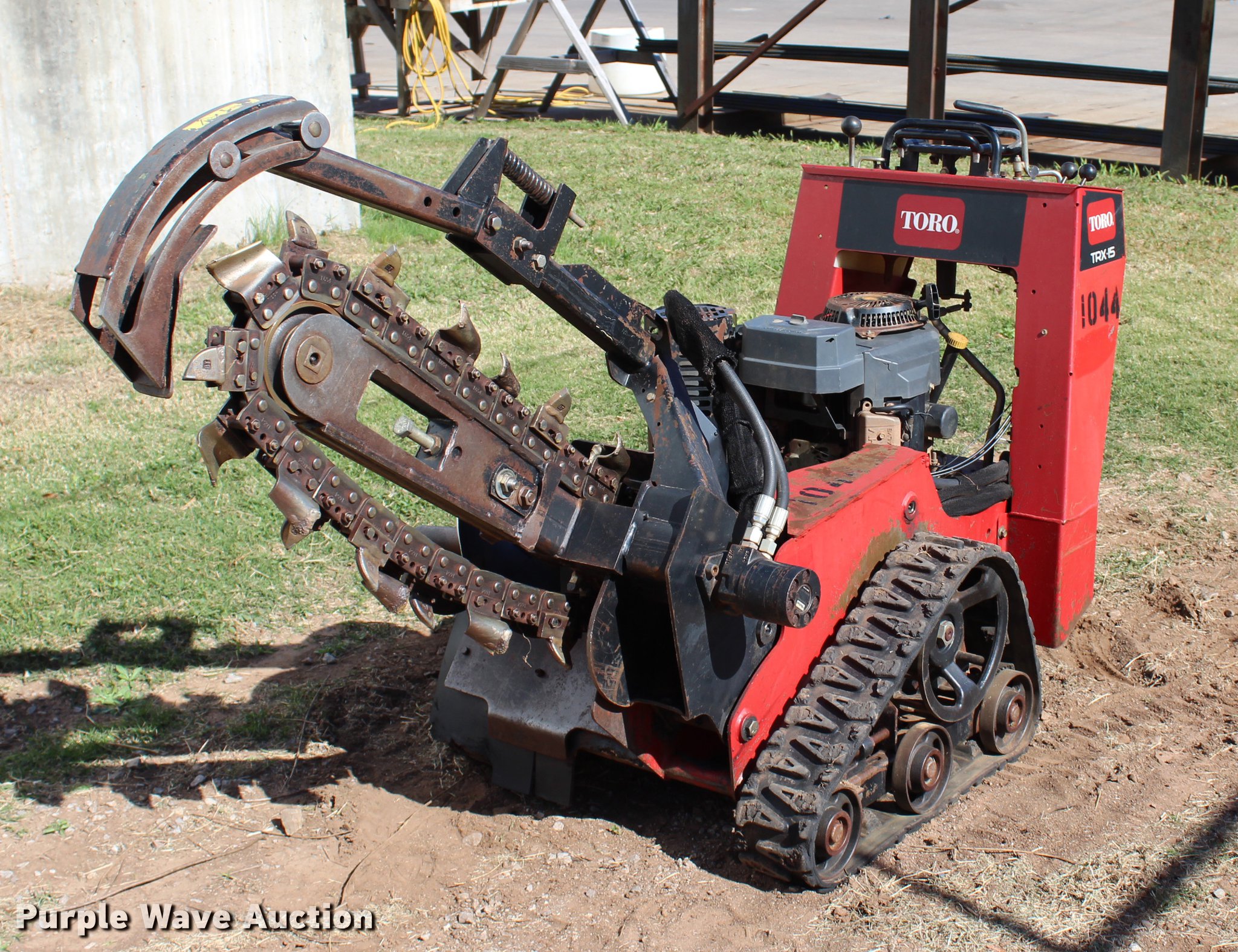 Purple Wave is selling a used Trencher or Rock Saw in Oklahoma. This item is a Toro TRX15 trencher with the following: 492 hours on meter, Model Z2970, Kawasaki FH430V gas engine, 15 HP, Hydrostatic transmission, 36" boom length, 5" cutting width, Rock and dirt teeth, Restraint bar, Crumber bridge, Manual crumber arch, 6"W rubber tracks, Trailer not included, Serial 280000228