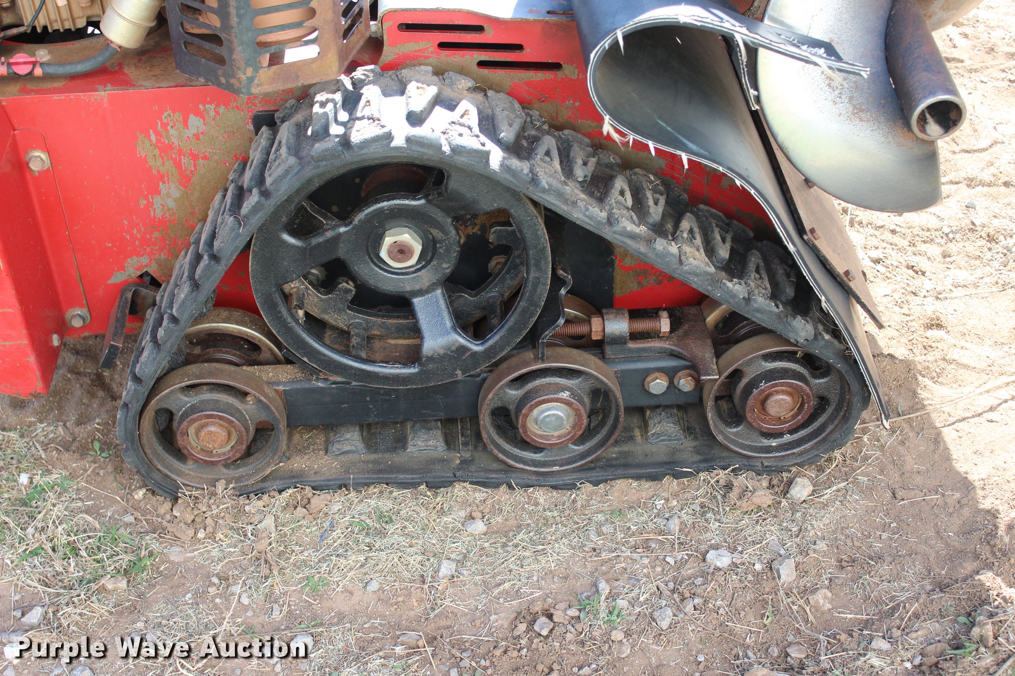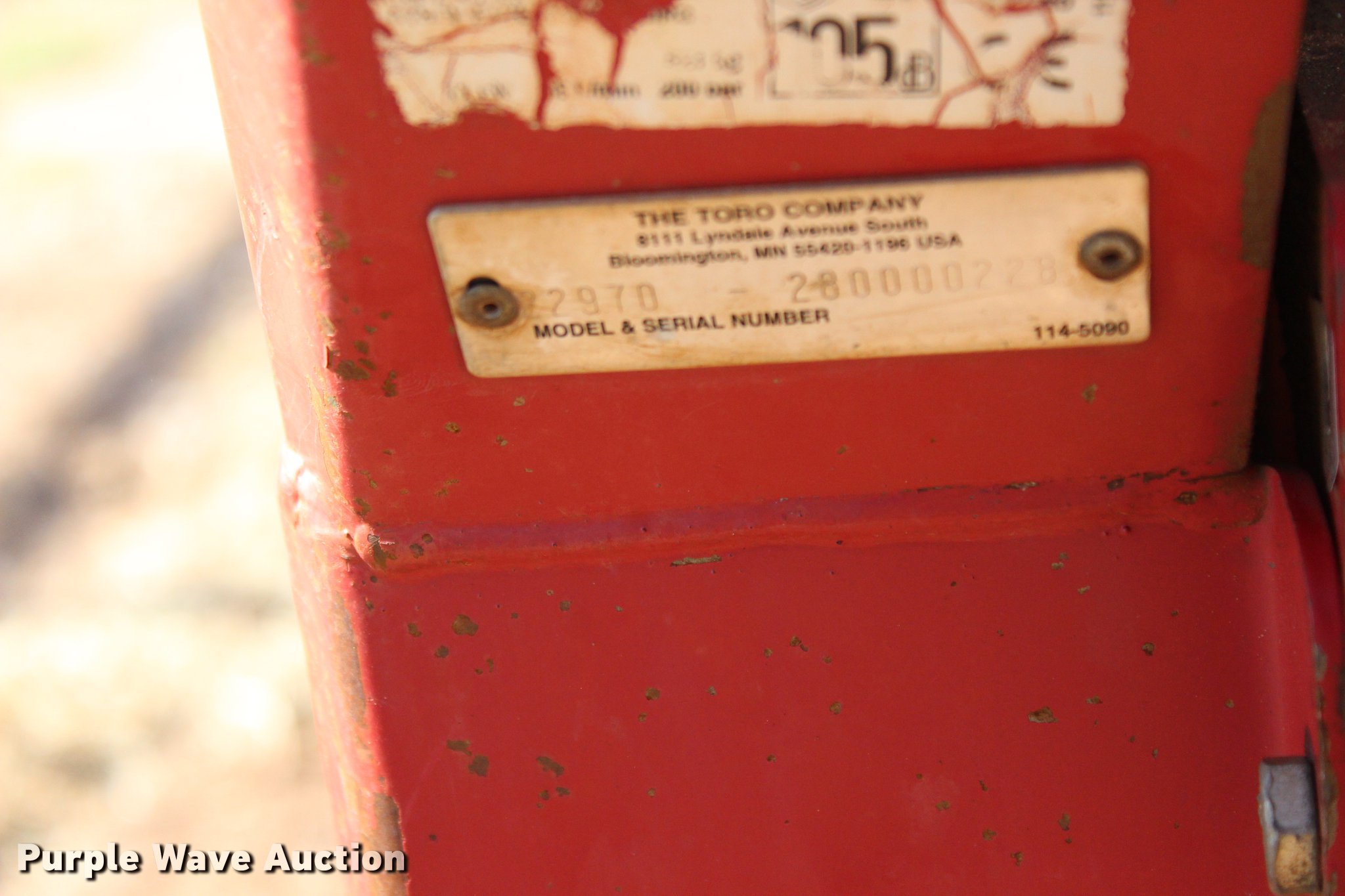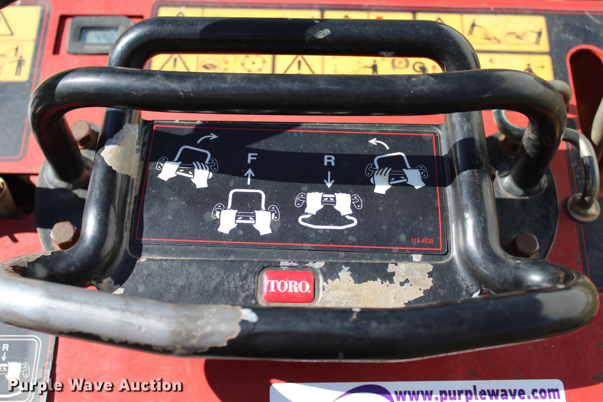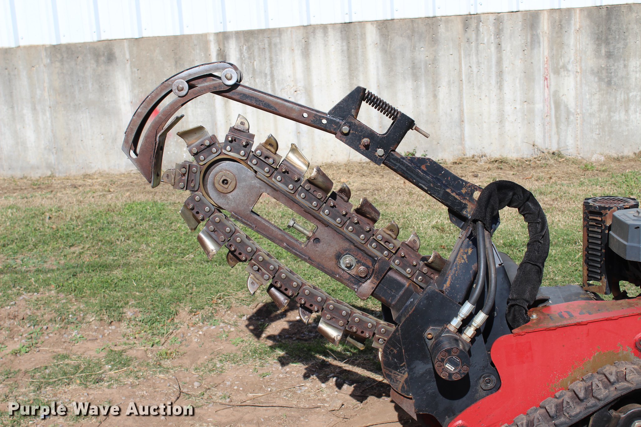 Purple Wave is selling a used Trencher or Rock Saw in Oklahoma. This item is a Toro TRX15 trencher with the following: 492 hours on meter, Model Z2970, Kawasaki FH430V gas engine, 15 HP, Hydrostatic transmission, 36" boom length, 5" cutting width, Rock and dirt teeth, Restraint bar, Crumber bridge, Manual crumber arch, 6"W rubber tracks, Trailer not included, Serial 280000228