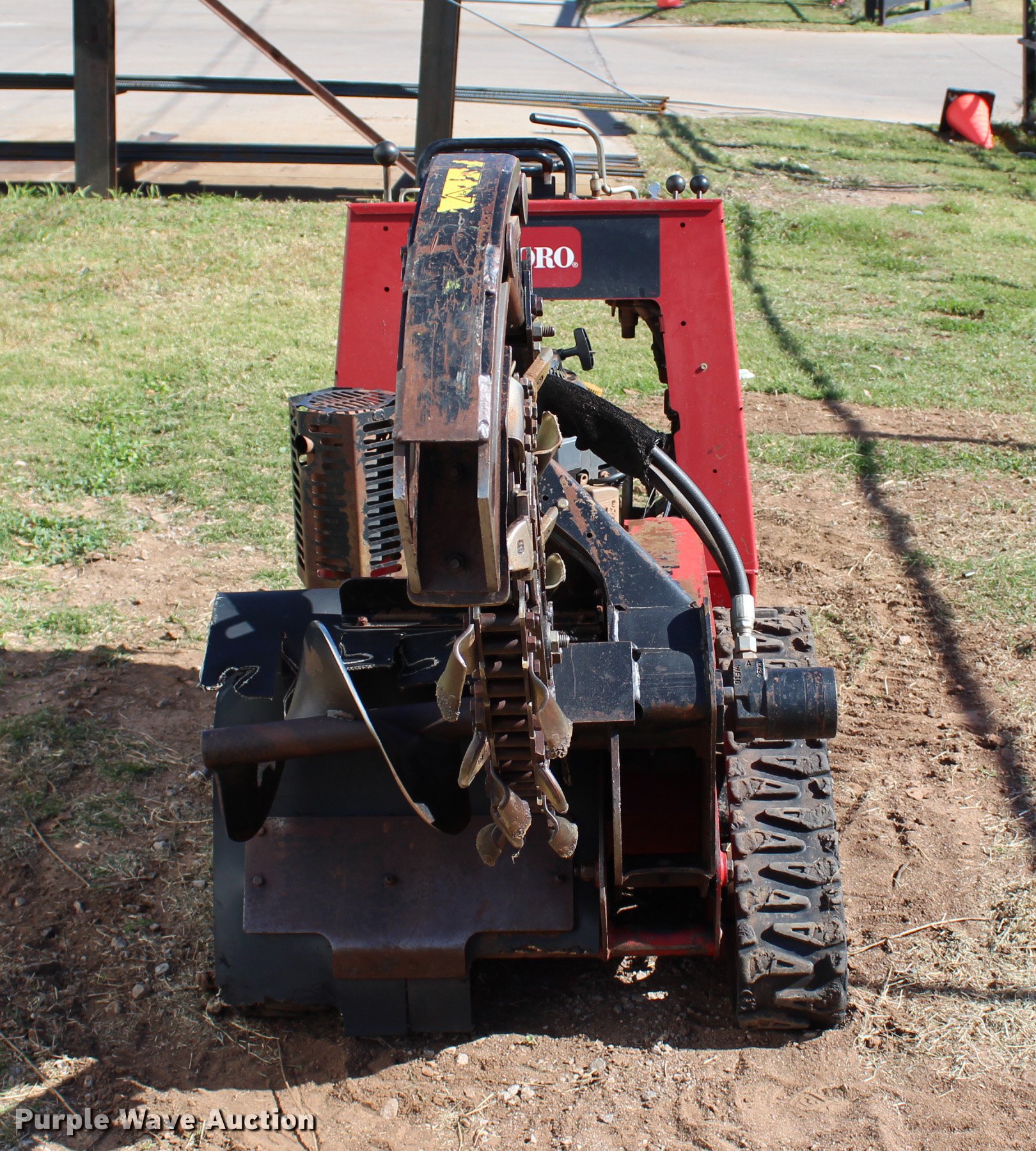 Toro TRX15 trencher. 492 hours on meter, Model Z2970, Kawasaki FH430V gas engine 15 HP, Hydrostatic transmission, 36" boom length, 5" cutting width, Rock and dirt teeth, Restraint bar, Crumber bridge, Manual crumber arch, 6"W rubber tracks, Trailer not included, Serial 280000228. Kinnunen Sales & Service. 707 E 6th Ave. Stillwater, OK 74074
