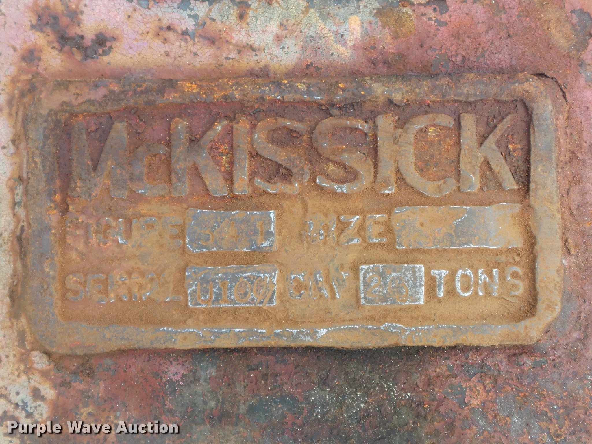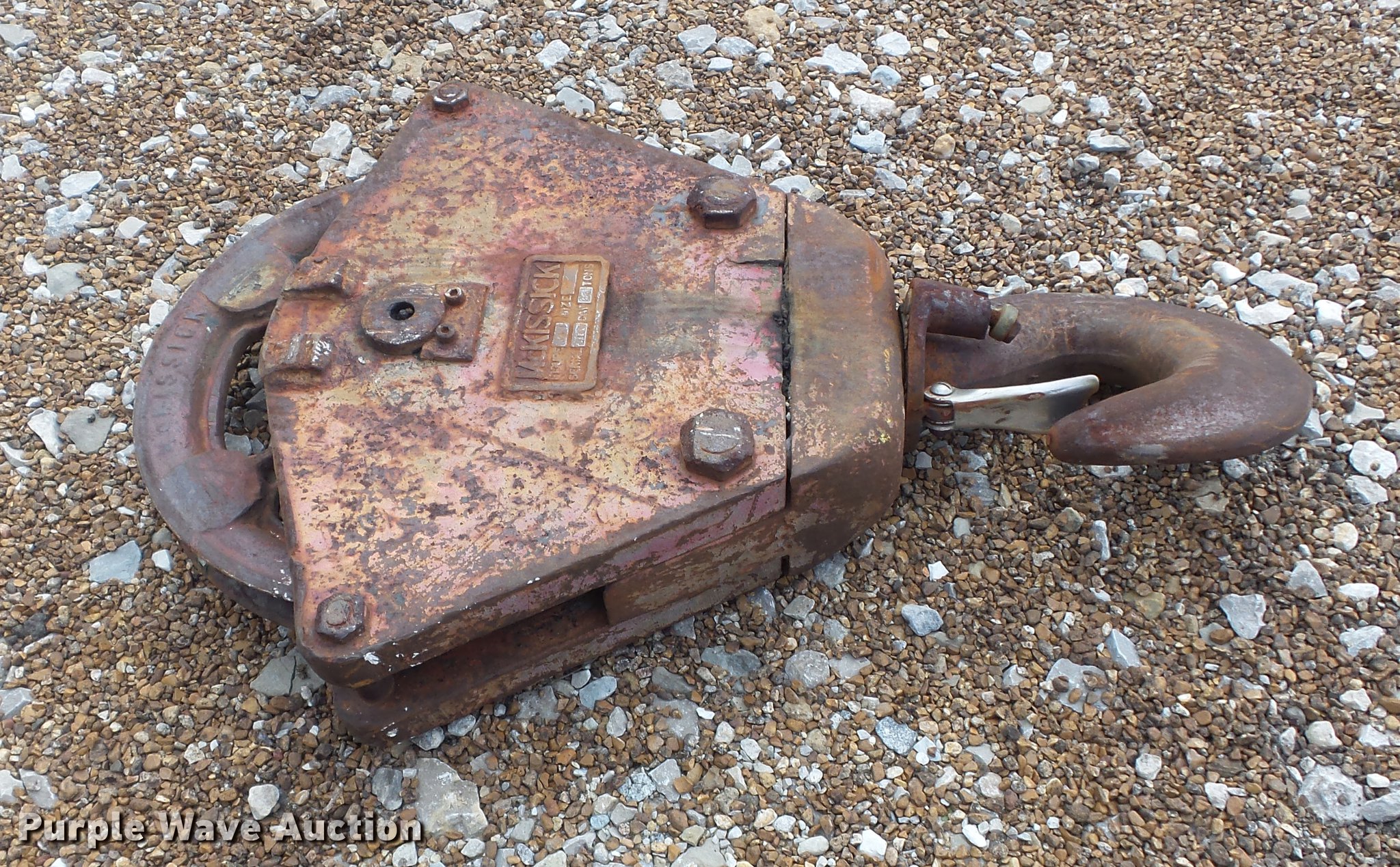 Purple Wave is selling a used Crane Attach. in Missouri. This item is a (2) pulley blocks with the following: McKissick single sheave pulley, 16" diameter sheave, 20 ton capacity, Swivel hook, Serial U100, P&H three sheave pulley, 12" diameter sheave, 25 ton capacity, Swivel hook, Part No. 801502, Serial 81-2576